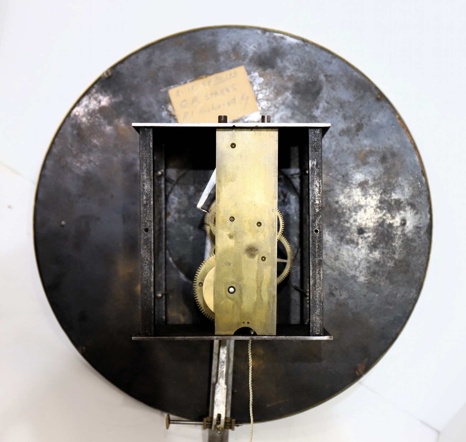 original. The porcelain dial has some noticeable chips and hairline cracks which could be repaired; the hands are appropriate. The pinwheel movement is unsigned; it is running without issue, regulated by a large gridiron temperature-compensating pendulum with