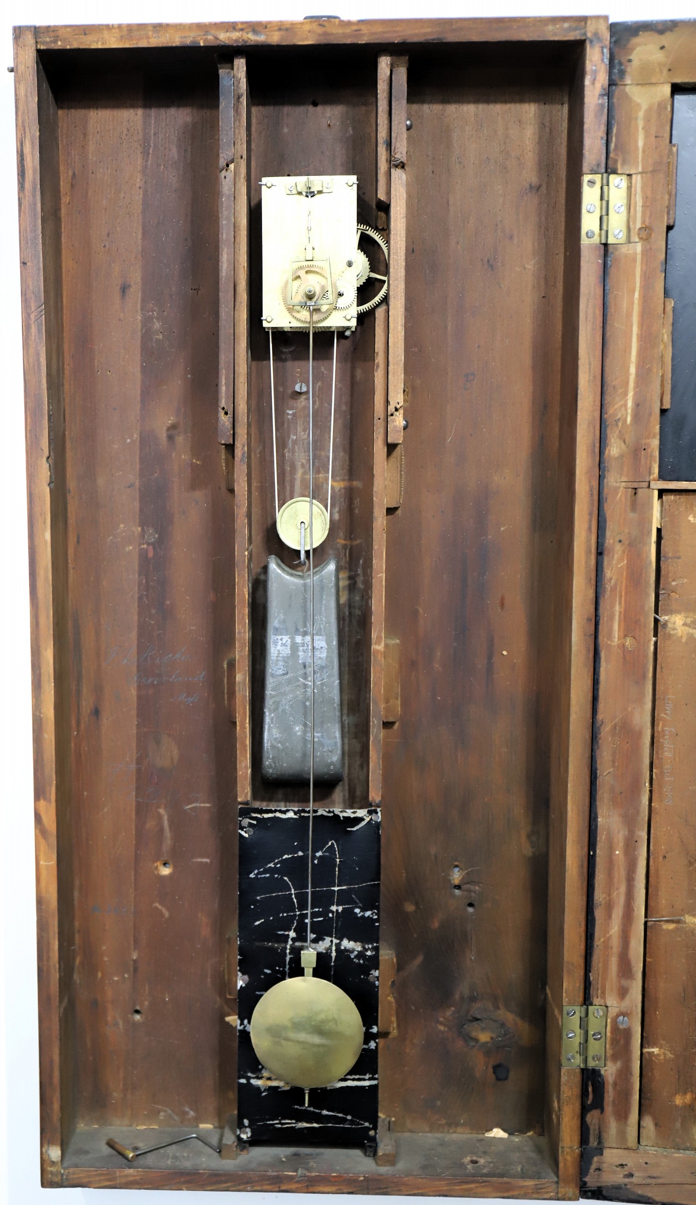 are likely original. The unmarked 8-day, time-only banjo-type movement is running, driven by a lead weight with a metal pendulum