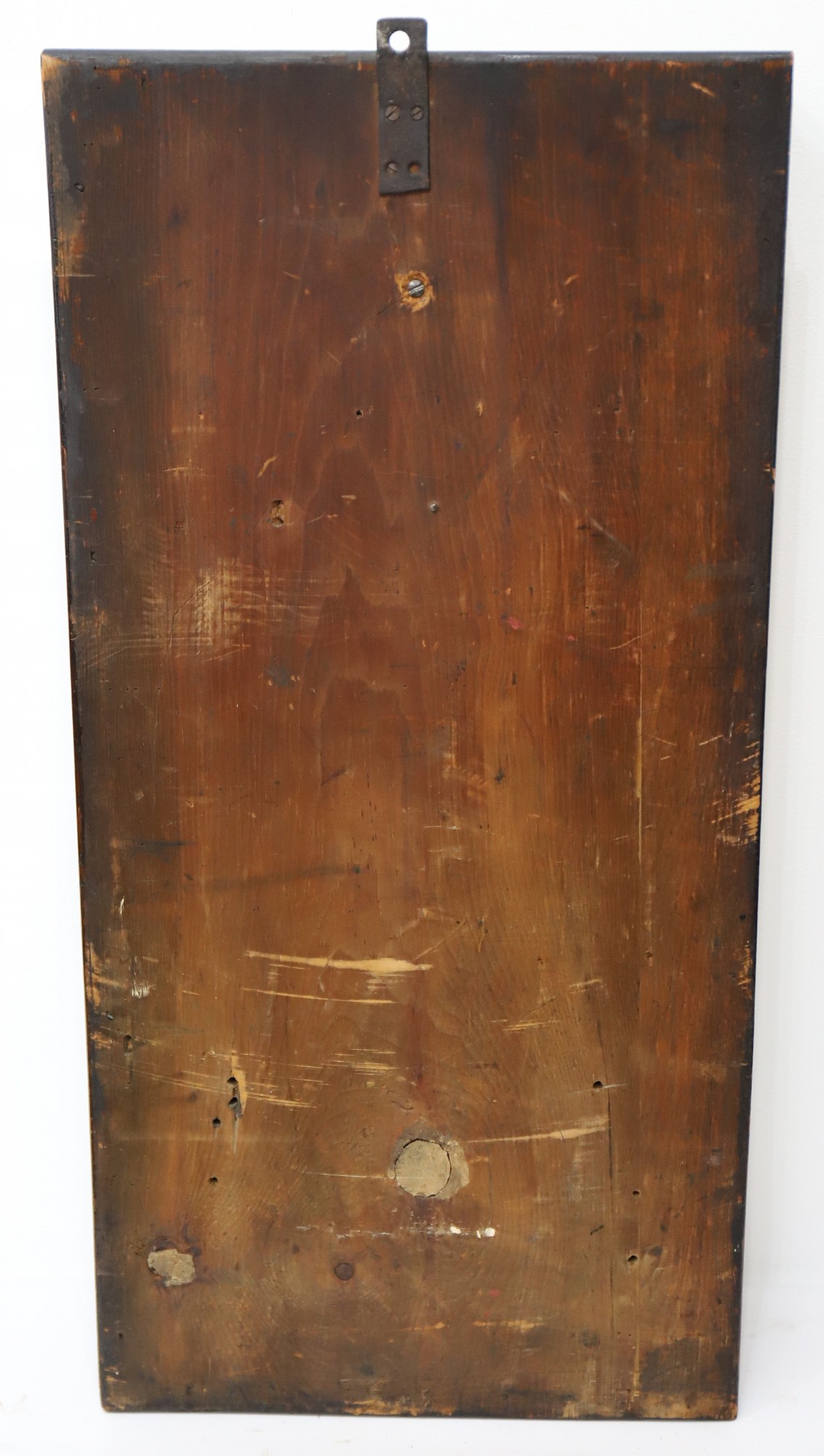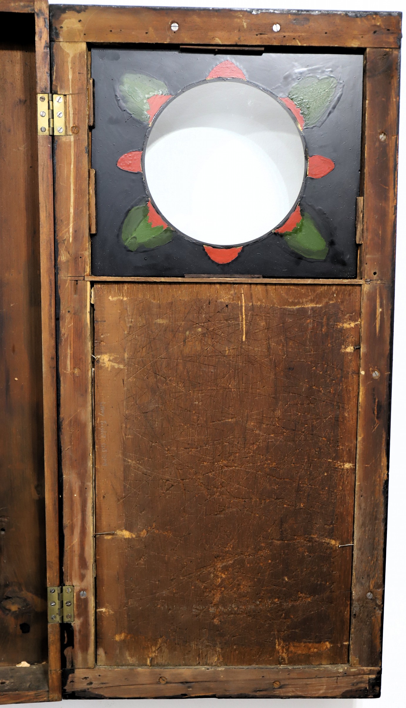 with the surround painted by Tom Moberg. The mirror is very wavy, protected by a wood backboard, and may well be original. The iron dial holds the original paint, with professional touch-up by Kathi Edwards (The Dial House). The delicate barbed hands