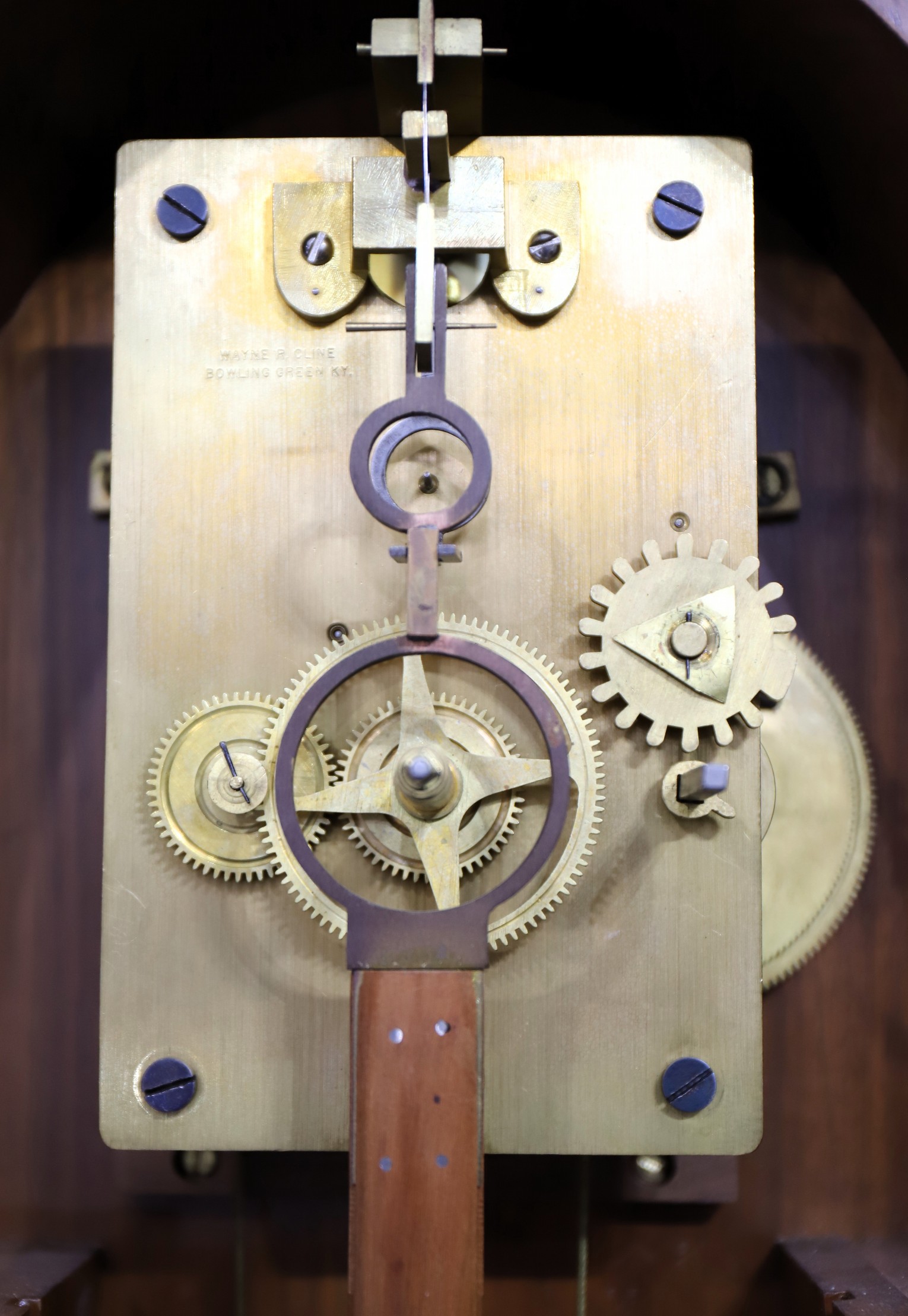 weight-driven, time-only movement is signed by Wayne Cline and is running without problem, regulated by a lead-backed pendulum bob