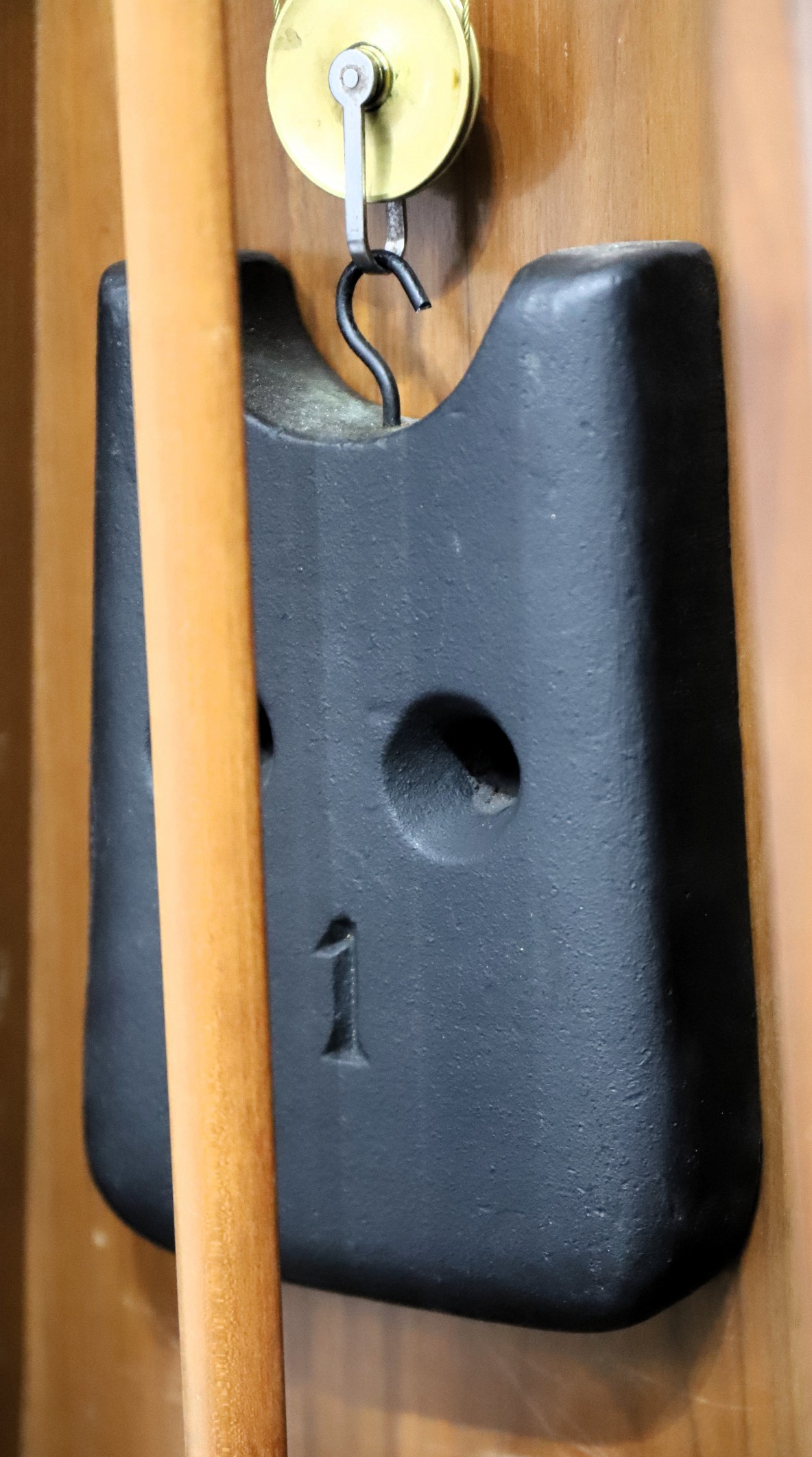 and driven by a reproduction No. 1 weight. No label, but the makers name, location, and date are stamped into the outside back