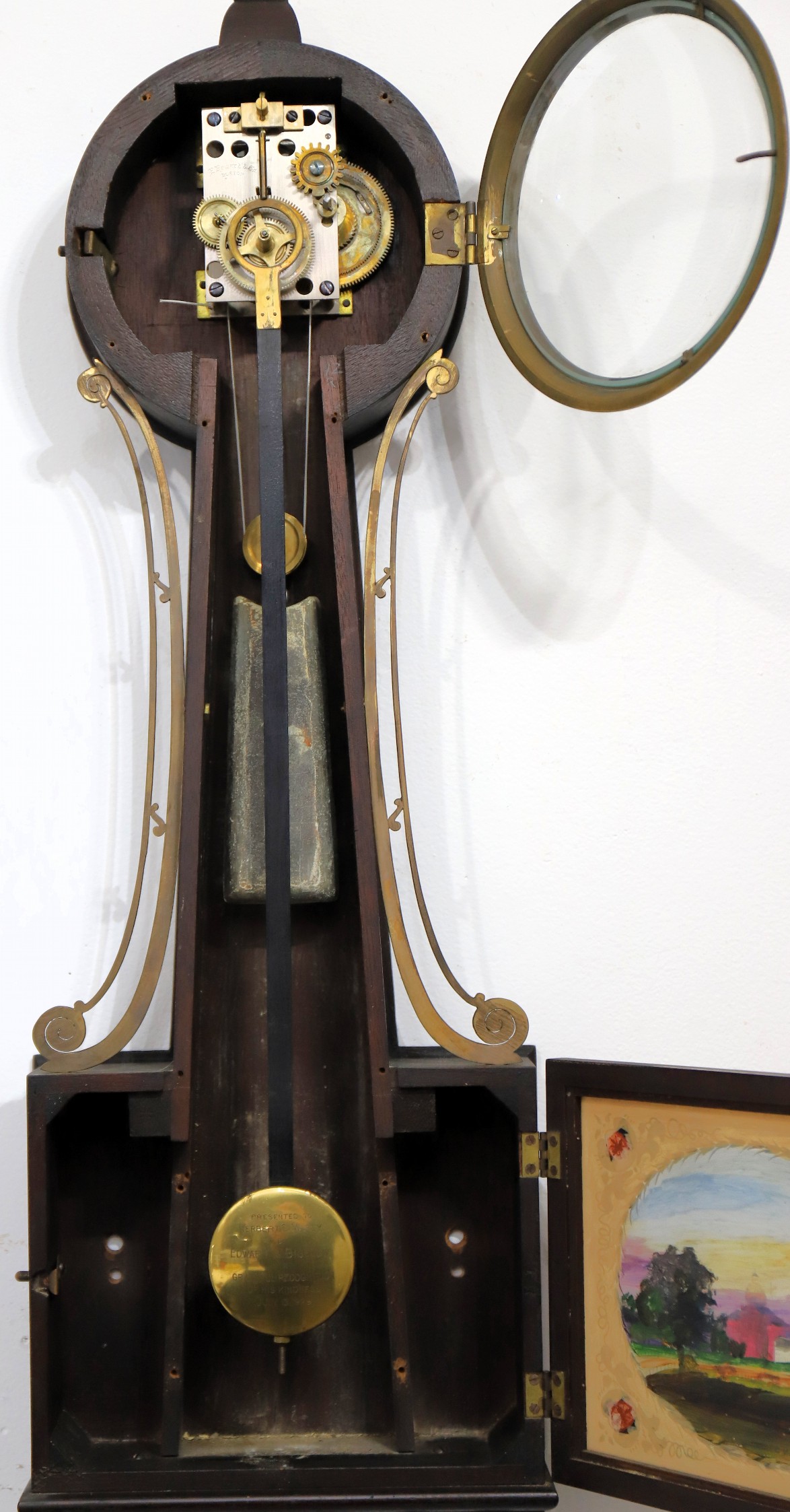 movement is signed and running, driven by a proper lead weight and a pendulum bob with an engraved appreciation. Two tin