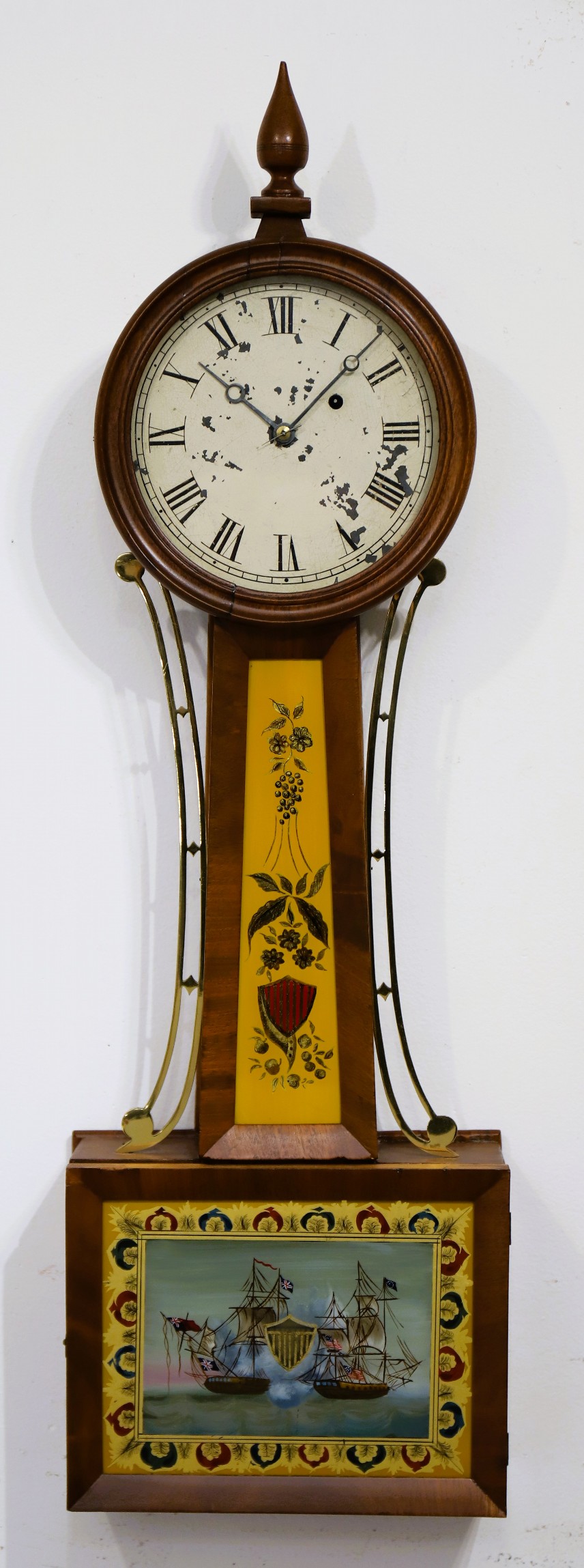 Early Boston area banjo, ca. 1835. A 32-inch mahogany case with attractive glasses. The front veneer is good with two possible corner repairs, and a wood bezel. The throat glass is old and may hold the original paint and gilding, while the dial and box glasses are modern, with a repainted tablet