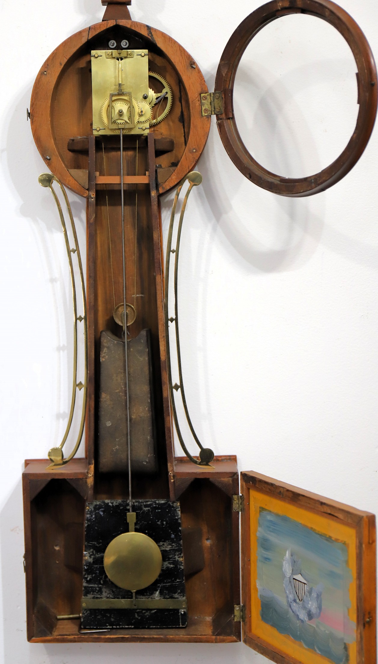 running nicely. A tin weight shield and pendulum tie-down bar, but the clip is lost. No label, of course. The matching
