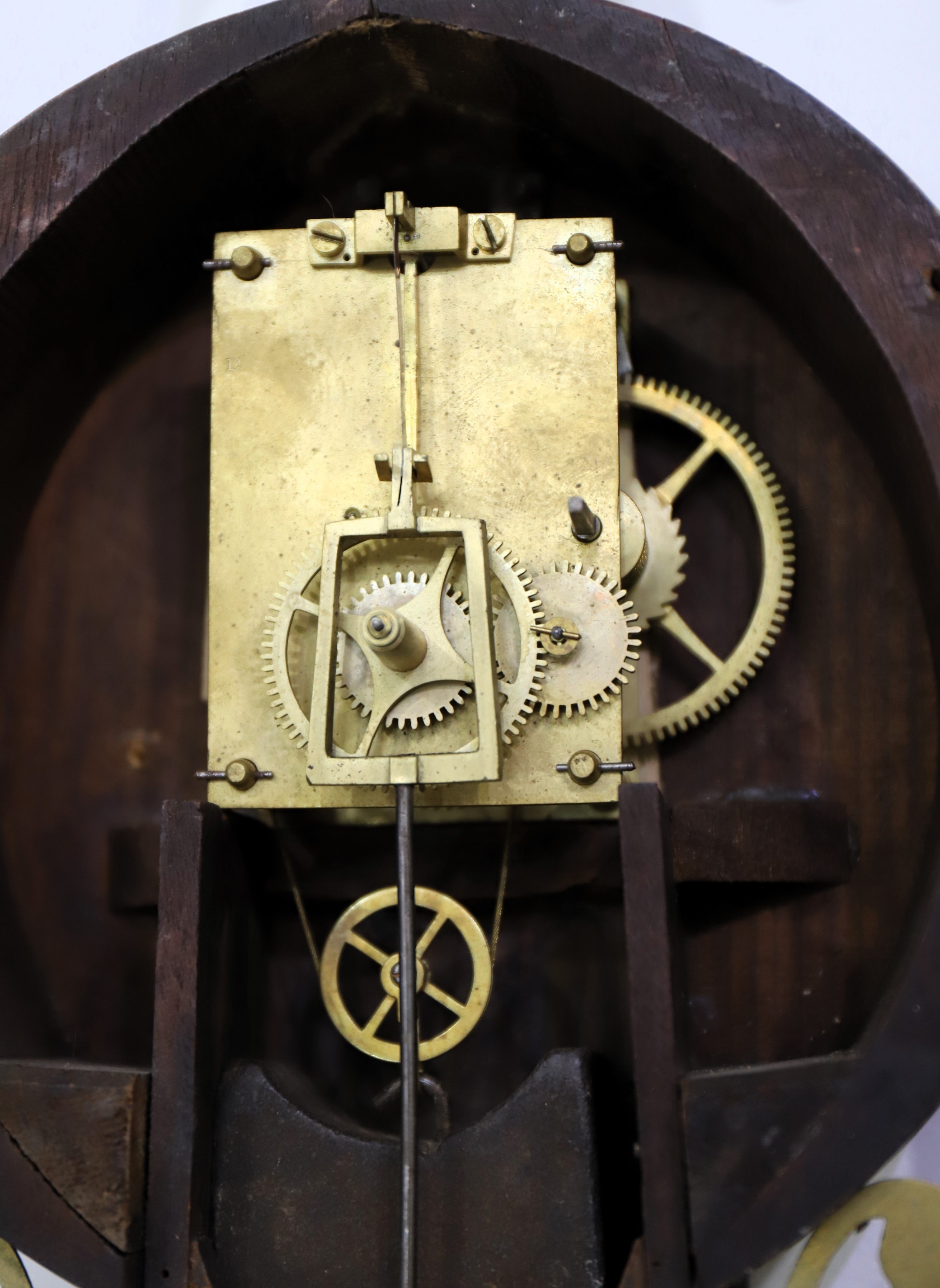 early mahogany case with gilding around the front – I think it has been redone, as it is like new. The dial glass is period