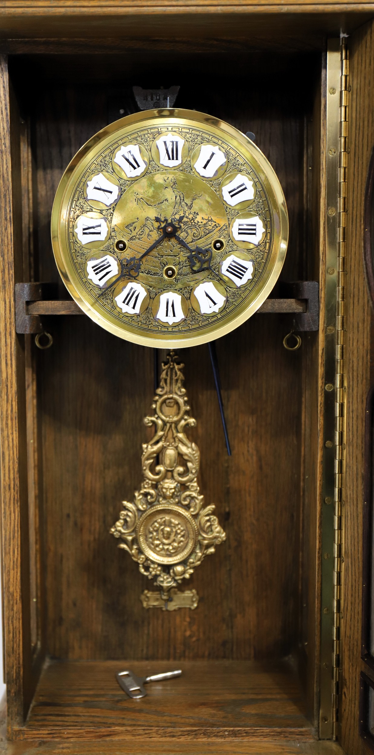 with a convex glass over the etched brass dial with cartouche numbering and fancy hands. The name “Gazo” is on the dial above