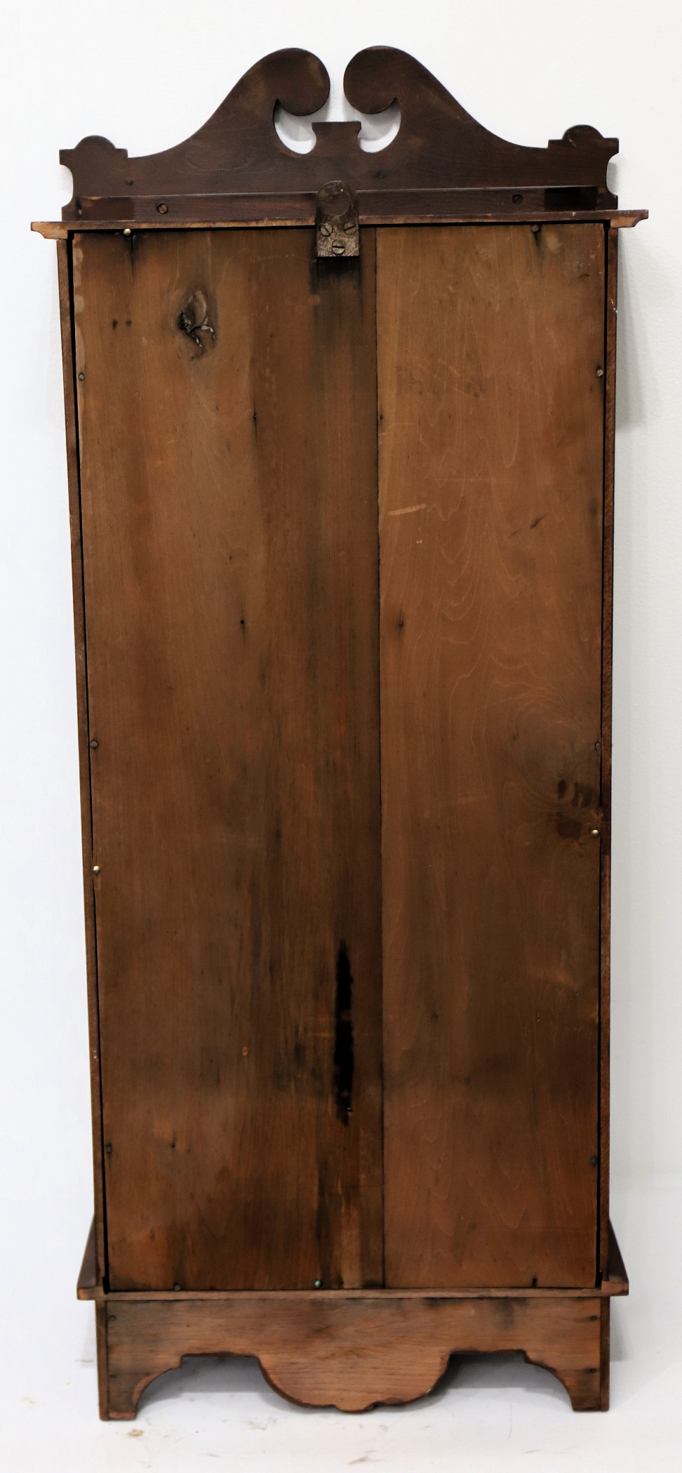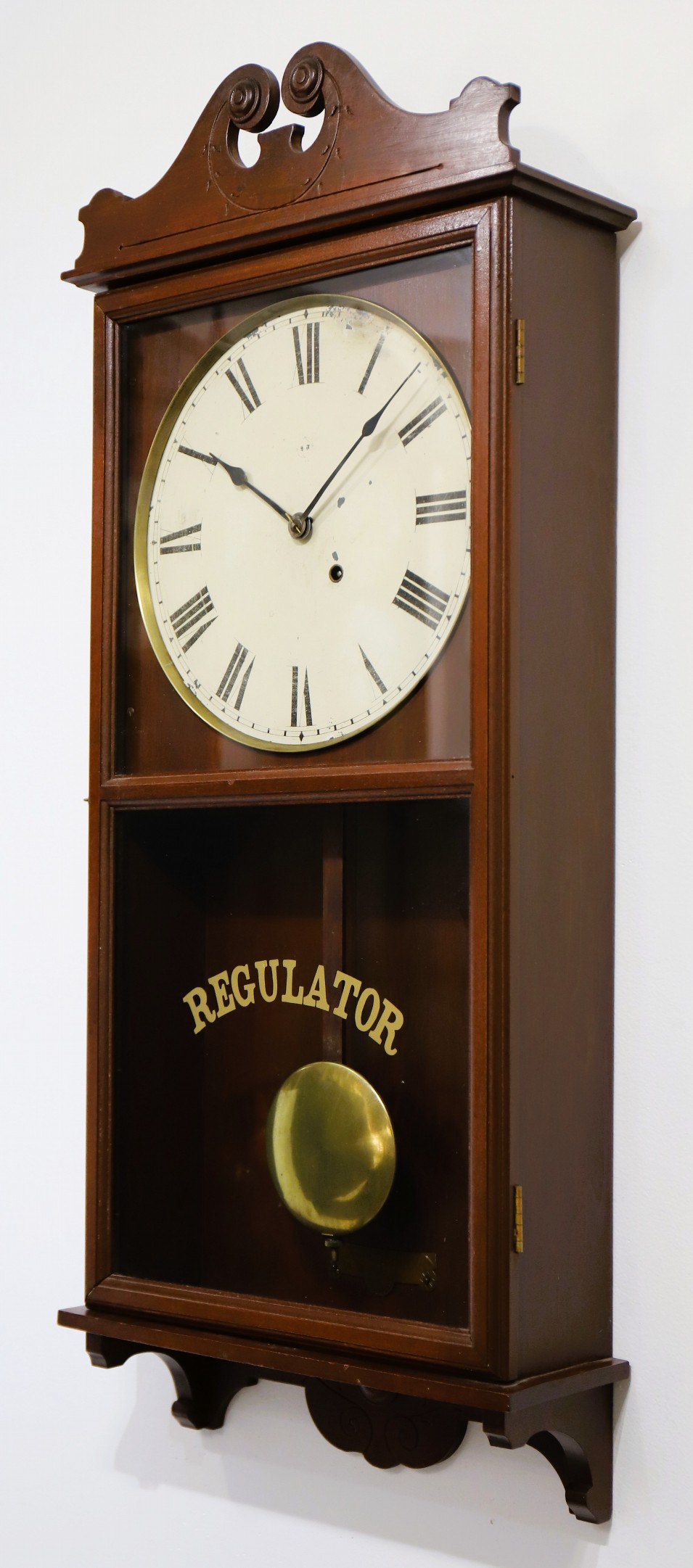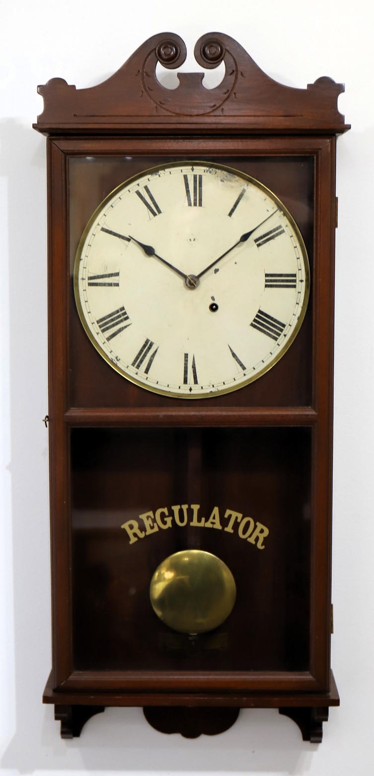 modern, with “Regulator” in gold lettering on the bottom glass – a bit of artistic license, as the catalog does not show that lettering. The faded painted dial looks to be original, with the ST logo. The hands are Seth Thomas. The 8-day, time-only spring-driven