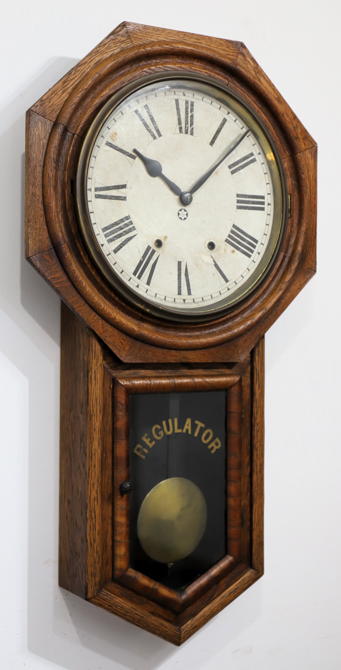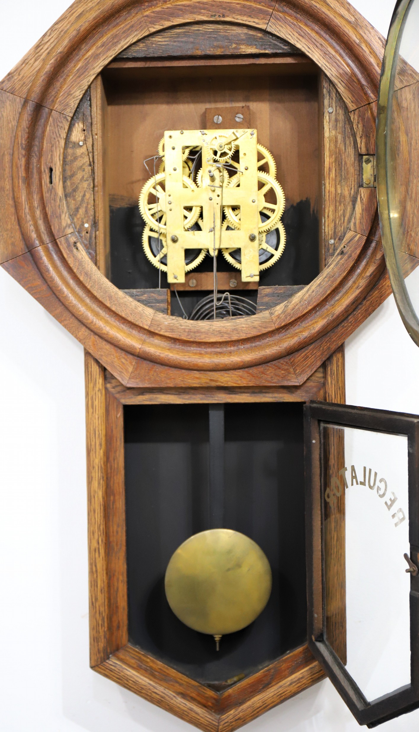 32-inch oak case that has been refinished but not varnished. The glasses are old with “REGULATOR” on the lower glass; the 12-inch