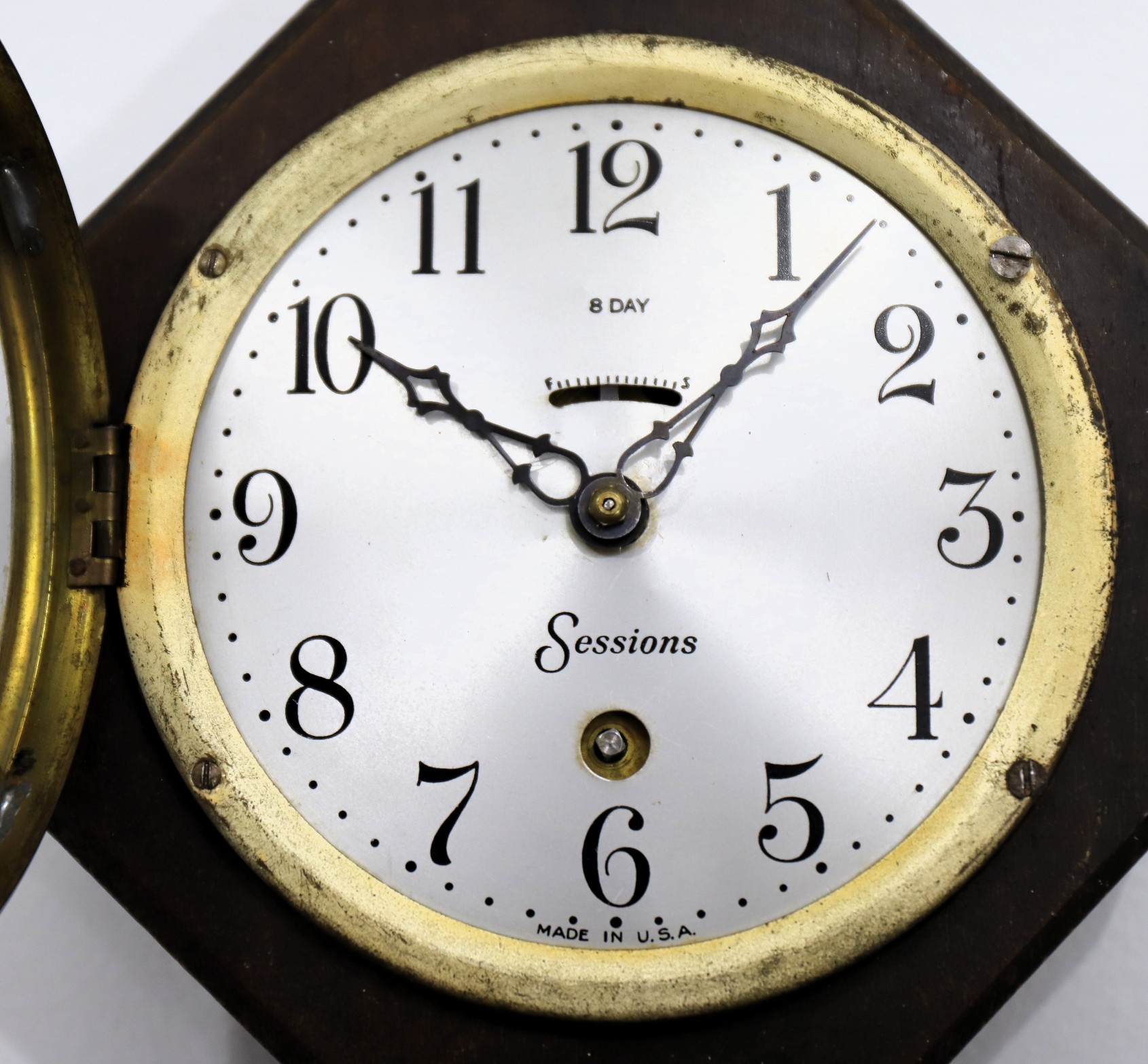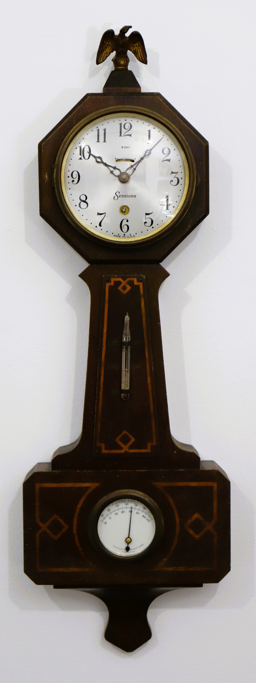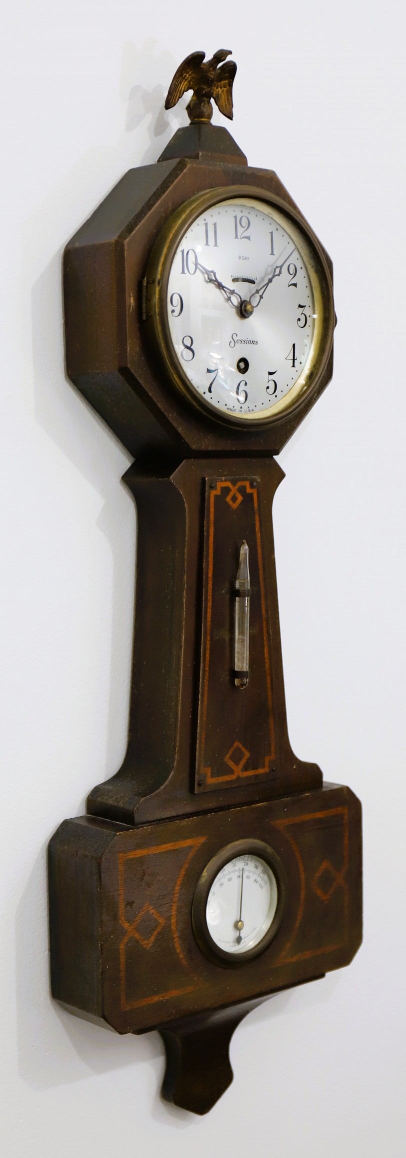 Sessions Clock Co. small lever-spring banjo,ca. 1920? A 25-inch mahogany case with lighter wood inlay around the box and throat. The finish is very dull and in need
