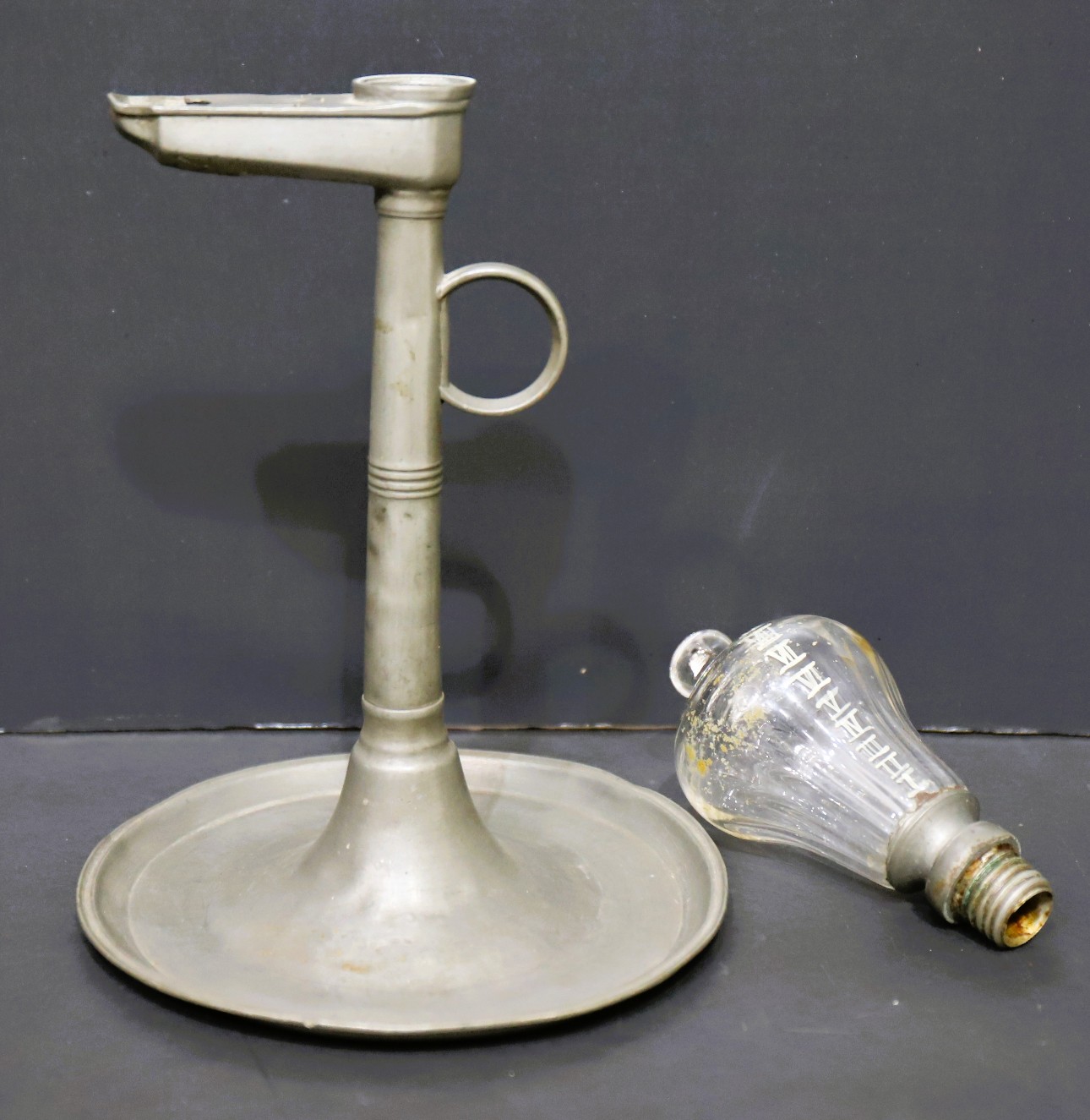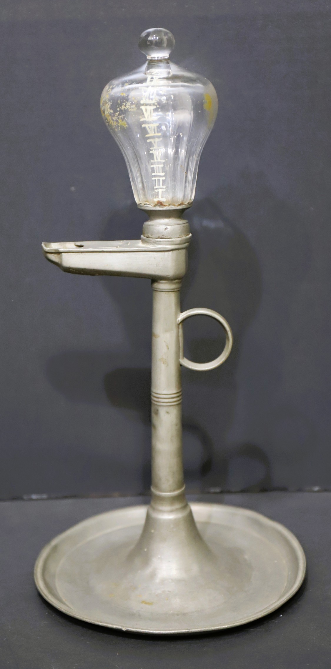 was invented in the 1700’s in France. You fill the glass globe with whale oil (it burns very cleanly), screw it into the pewter