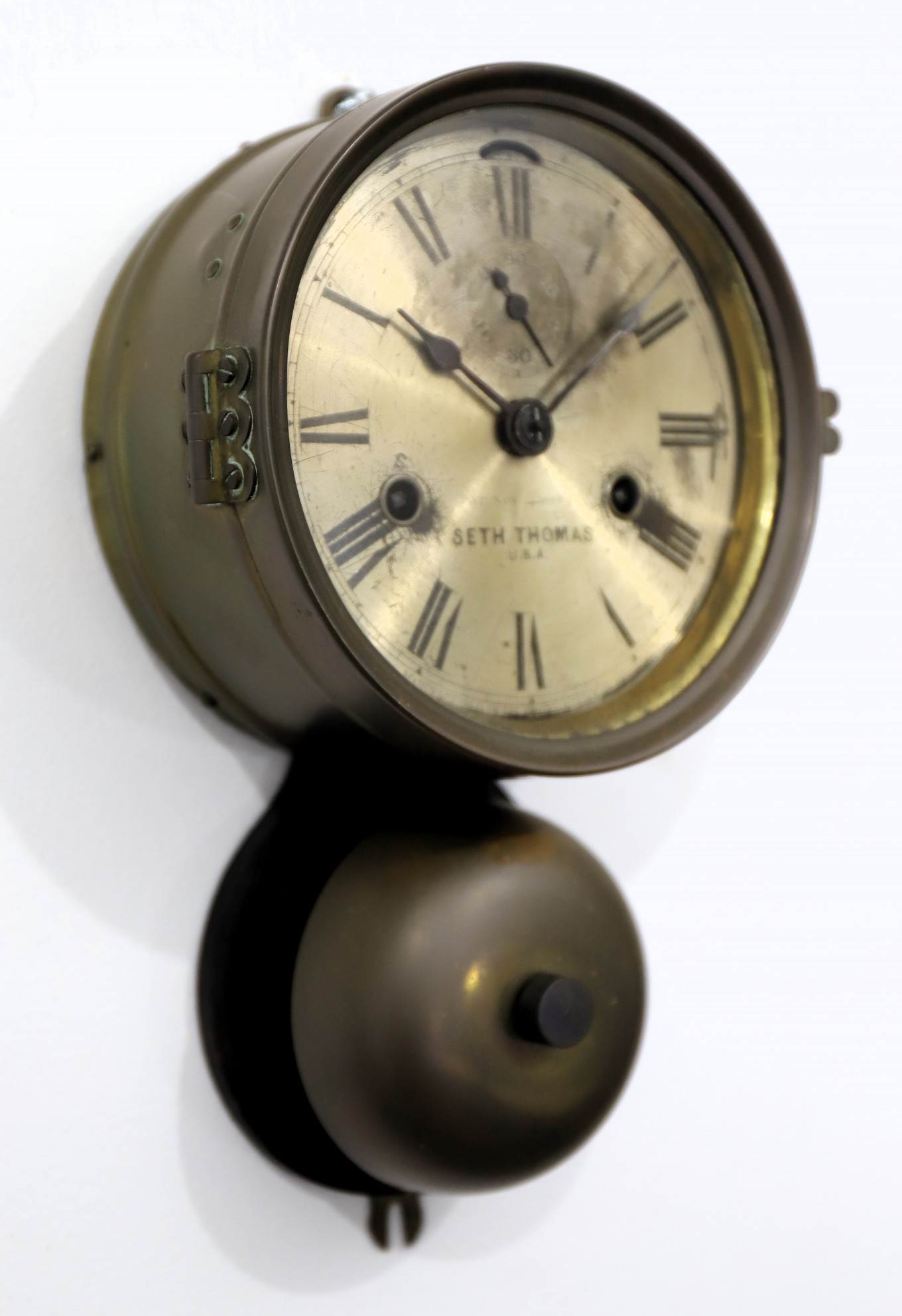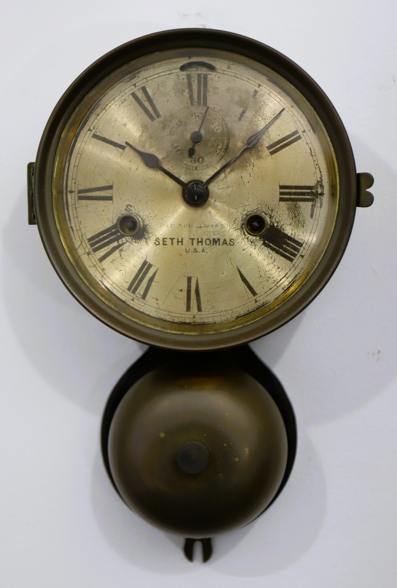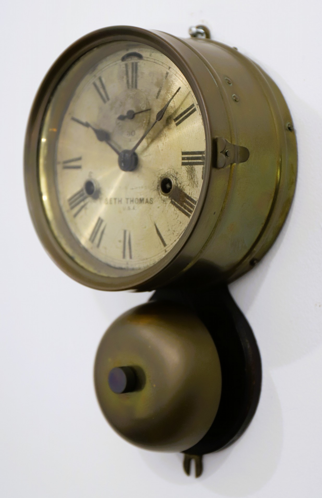 Seth Thomas Clock Co. “Ship’s Bell Lever”, ca. 1884. A 10.5-inch tall lever one-day movement that strikes ship’s bells on the bell below the dial. The brass case is badly oxidized,