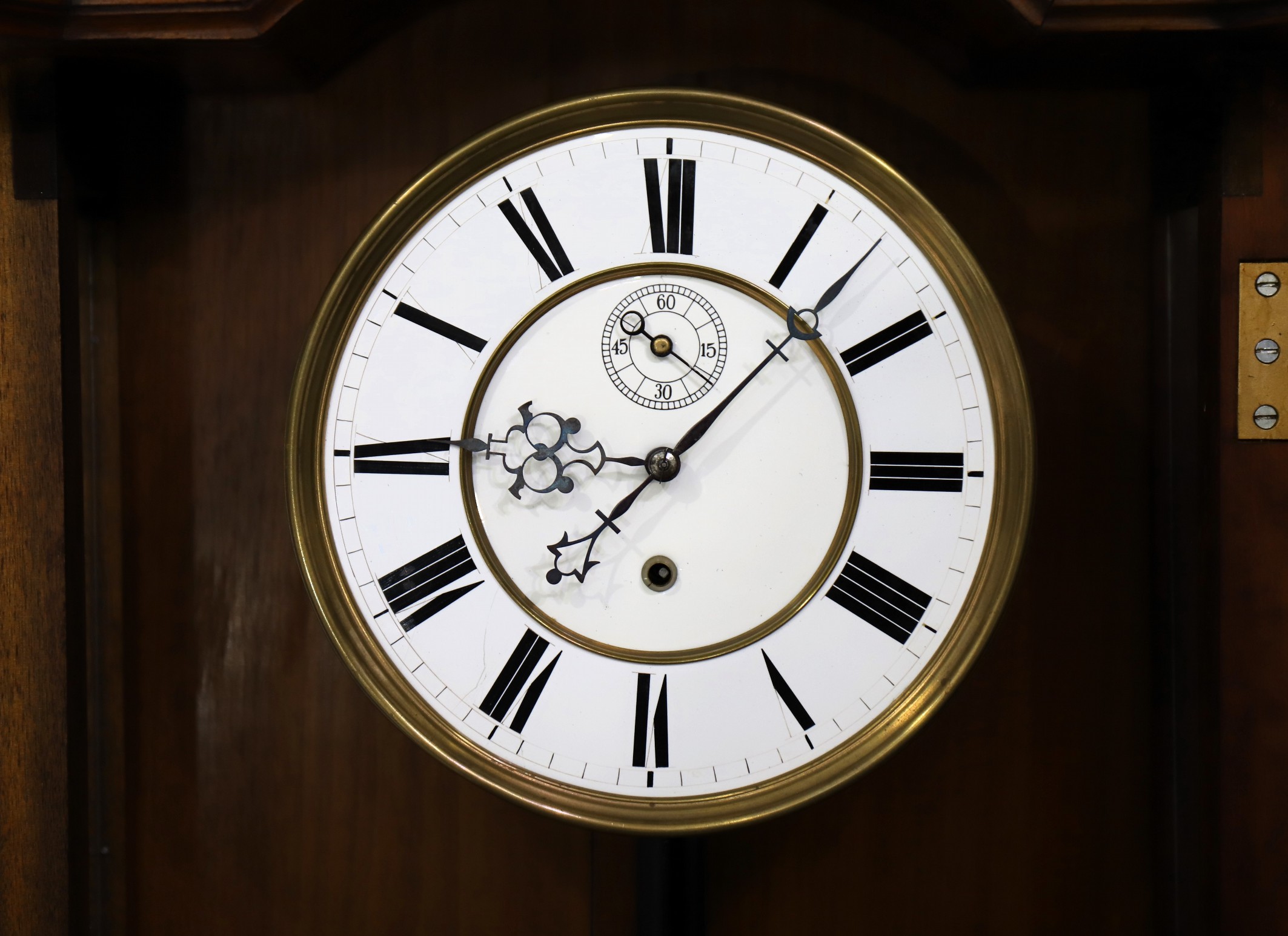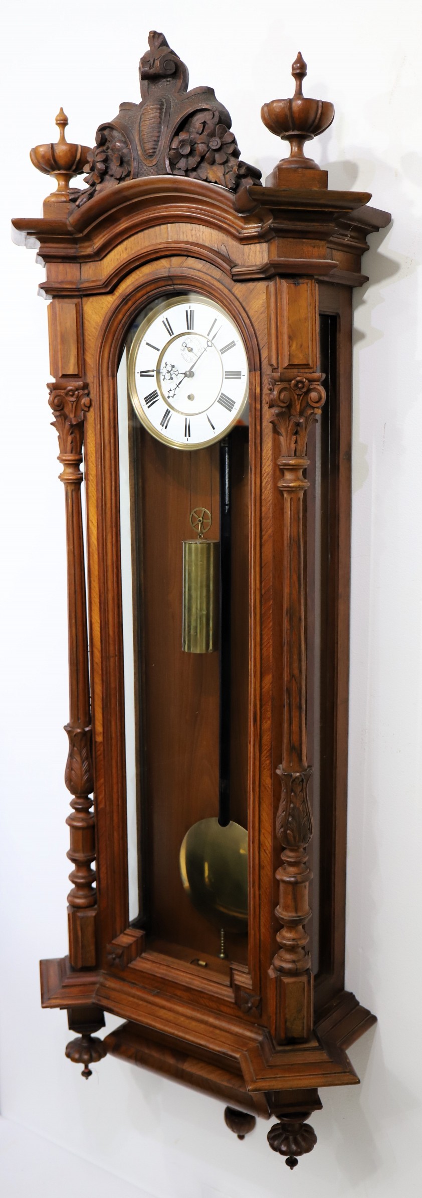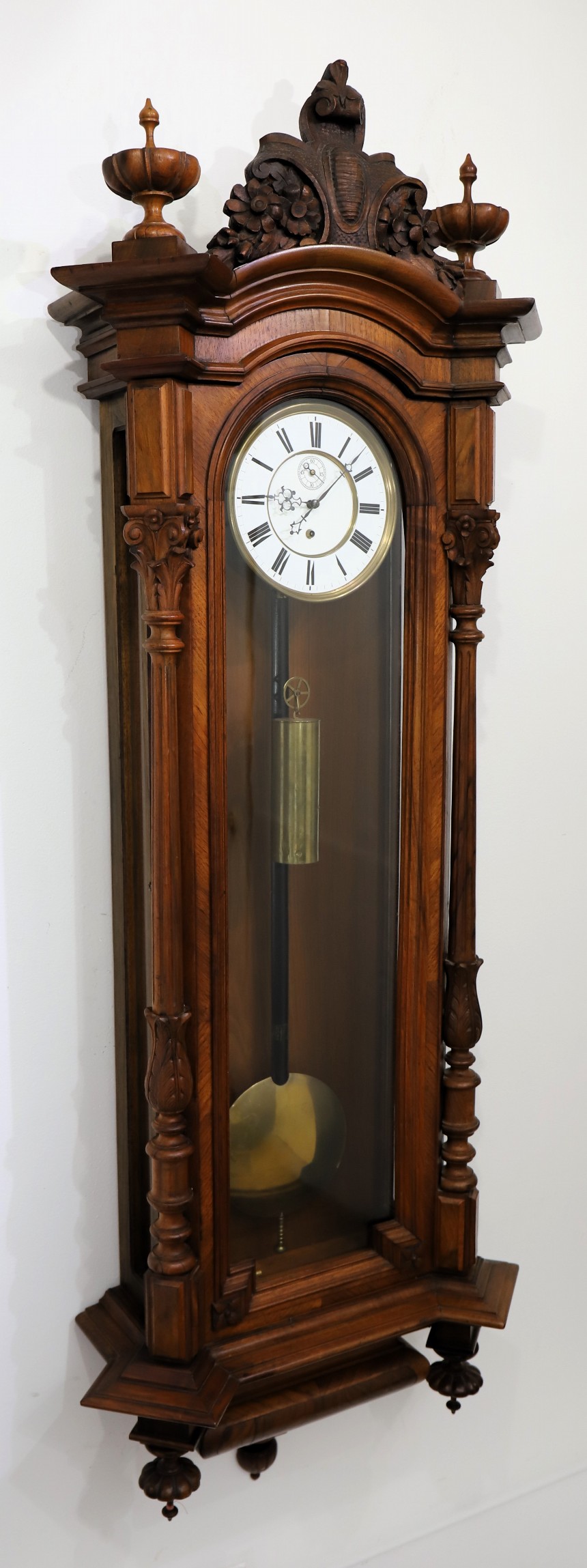 Very large one-weight, 30-day Vienna,ca. 1890. A 64-inch walnut case with walnut or mahogany veneer, a finely carved crest, door columns, and finials. The