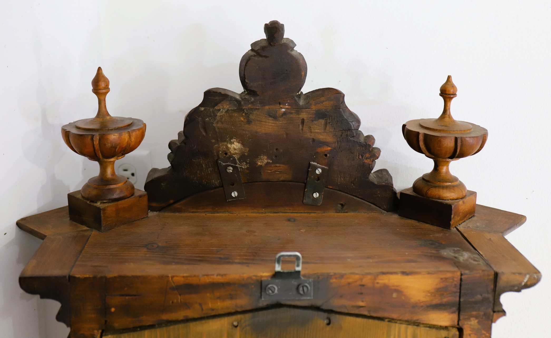 the VII), ornate Viennese hands including a seconds hand. The 30-day, time-only movement is unsigned and unmarked; it is running. There is a large hollow brass pendulum bob and a brass weight on a spoked pulley wheel. Other than a good repair to the top
