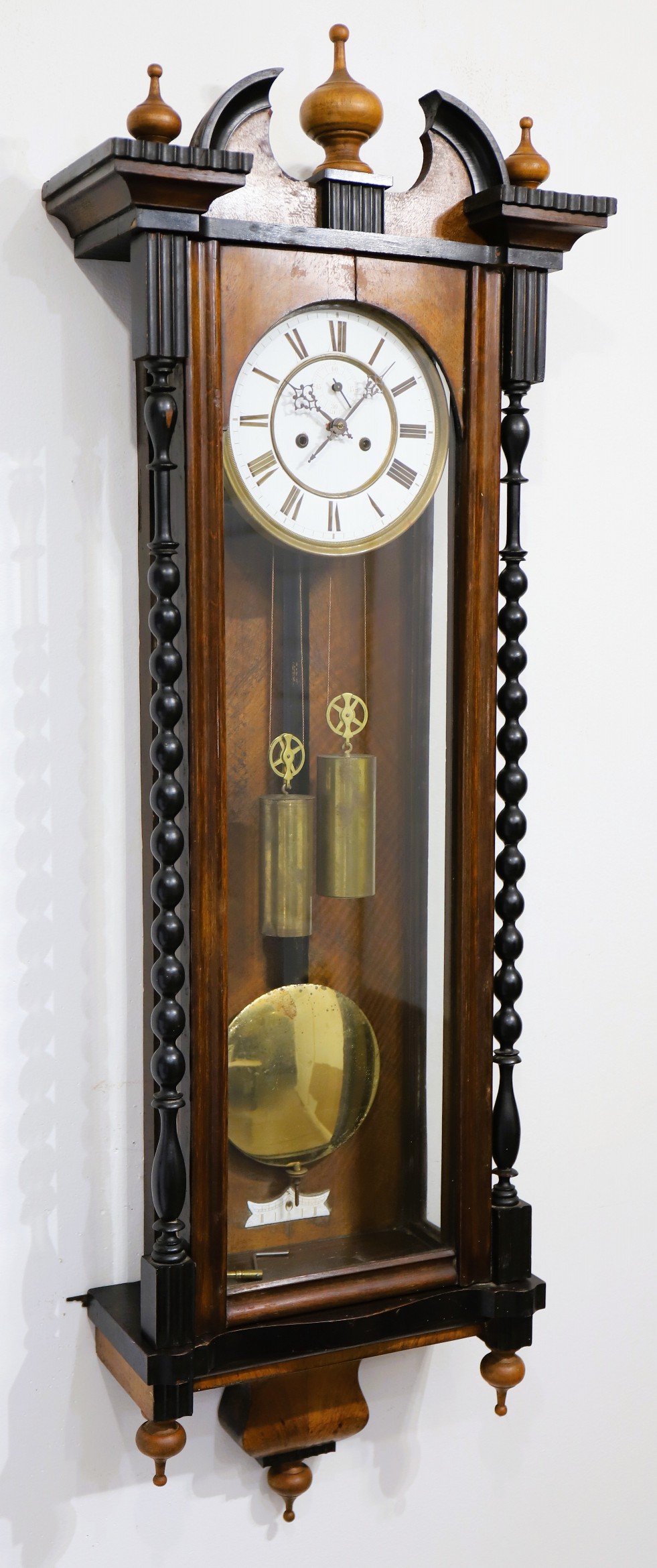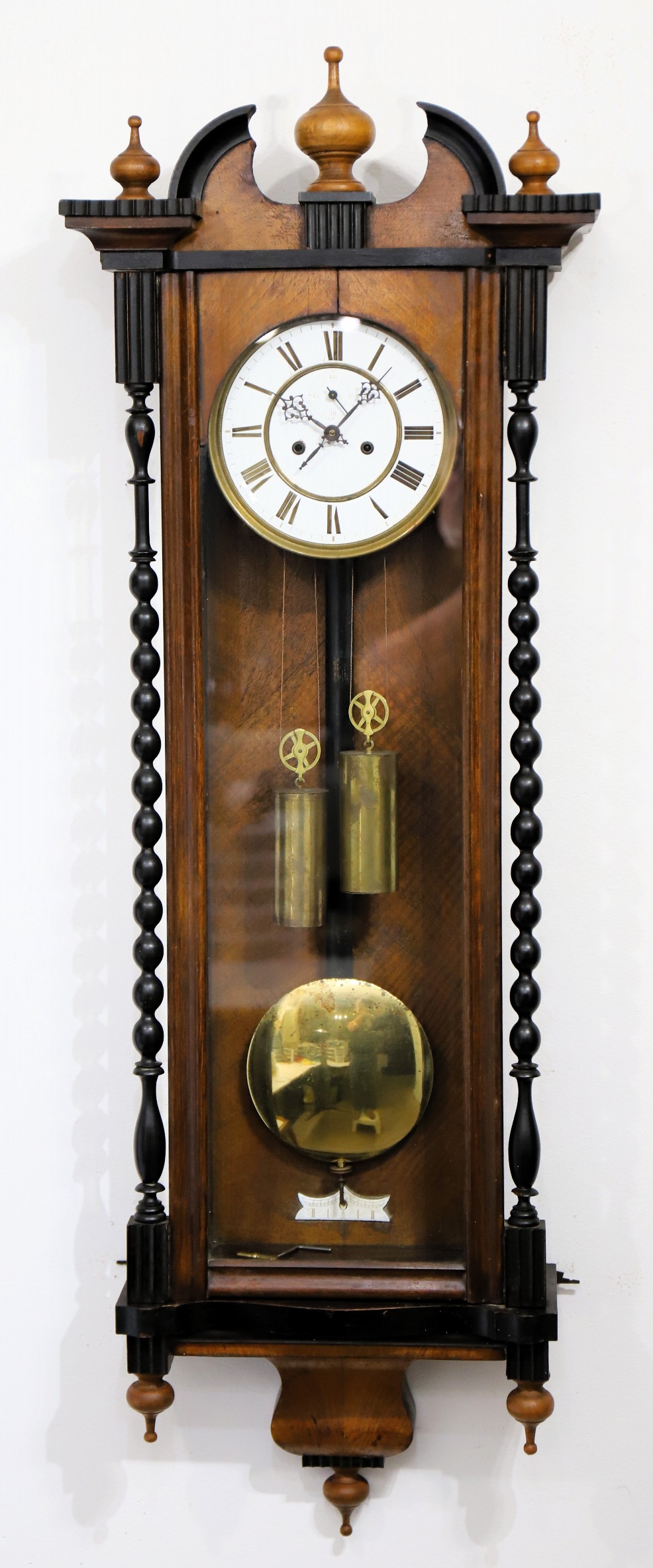 H. Endler & Co. two-weight Vienna, ca. 1890. A 44-inch Vienna with the original finish, a bit dull and nicked up. The door glass looks modern, but everything else looks