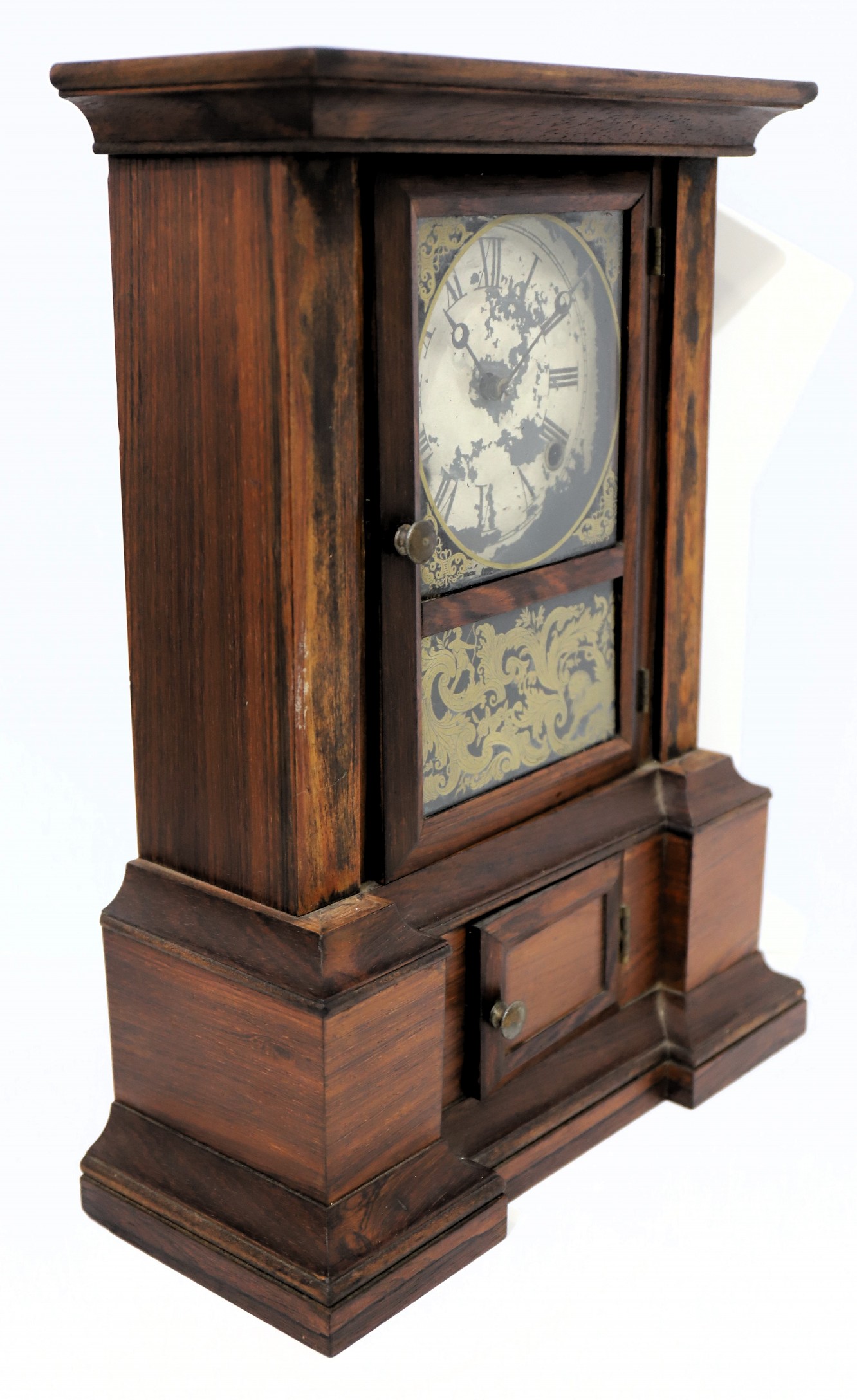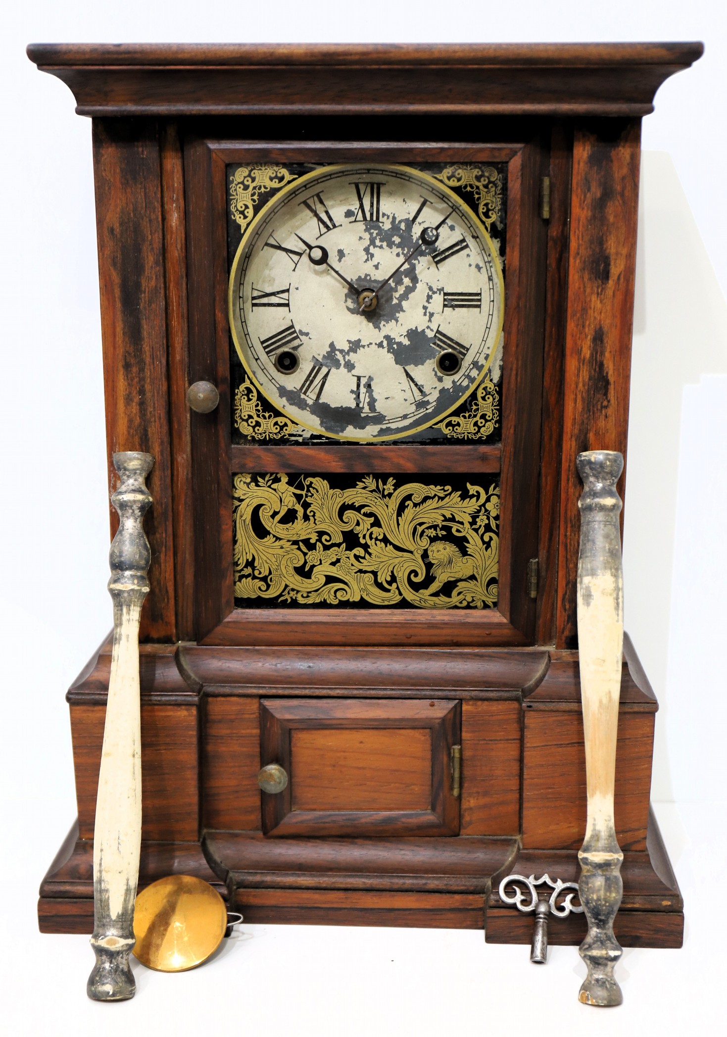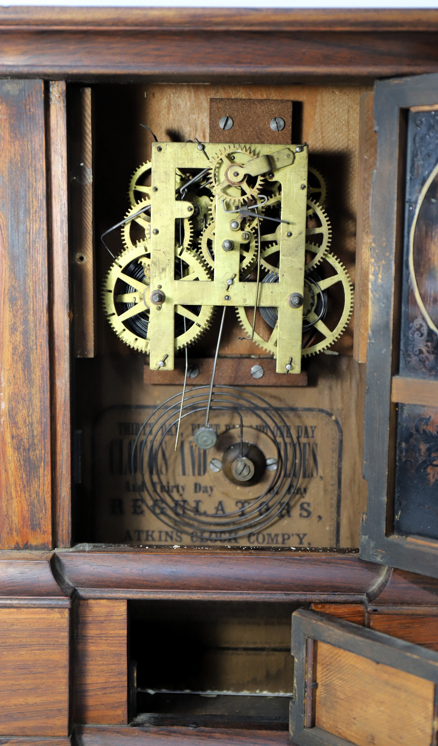 Atkins Clock Co. “London”, 1859-1879. The 17-inch case has been stripped but not refinished; the rosewood veneer is complete and in good condition. The half-columns