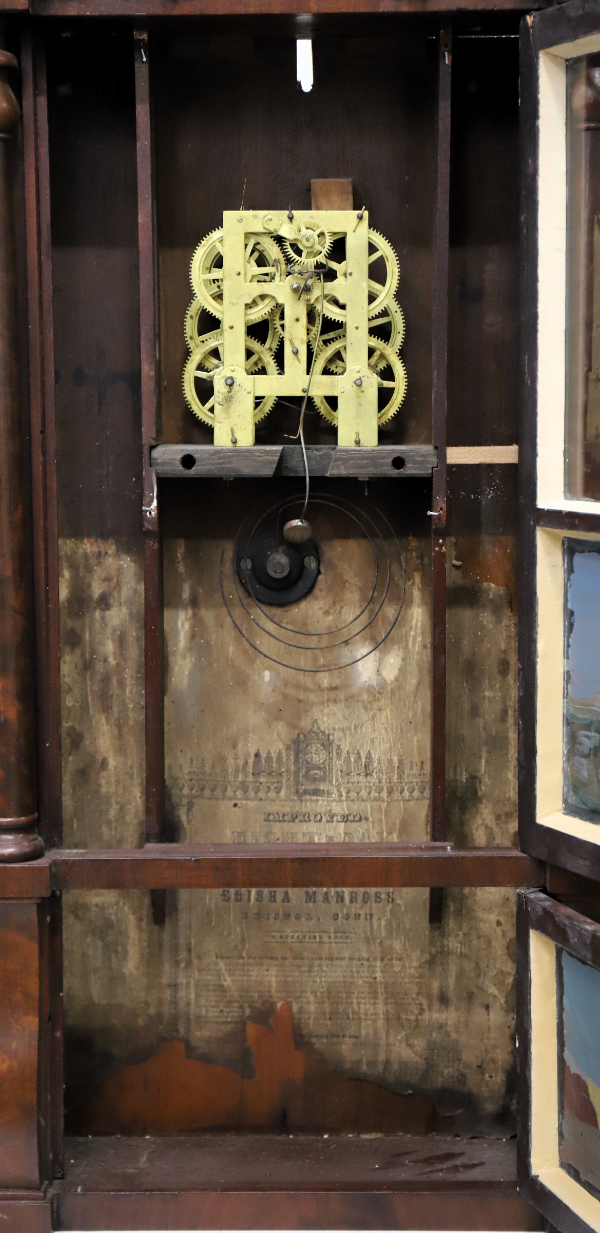 Brass Clock”, 1843-1849. A 36-inch case with a clean finish on mahogany veneer, a carved splat and two full columns with figured