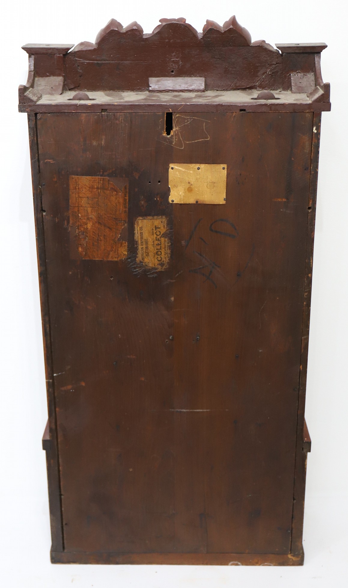 installed. The contoured metal dial is in good condition with light soiling; it is not original to this case but fits the movement. There are no hands. I believe this is a 30-hour time-and-strike, weight-driven movement that has been modified to run 8 days