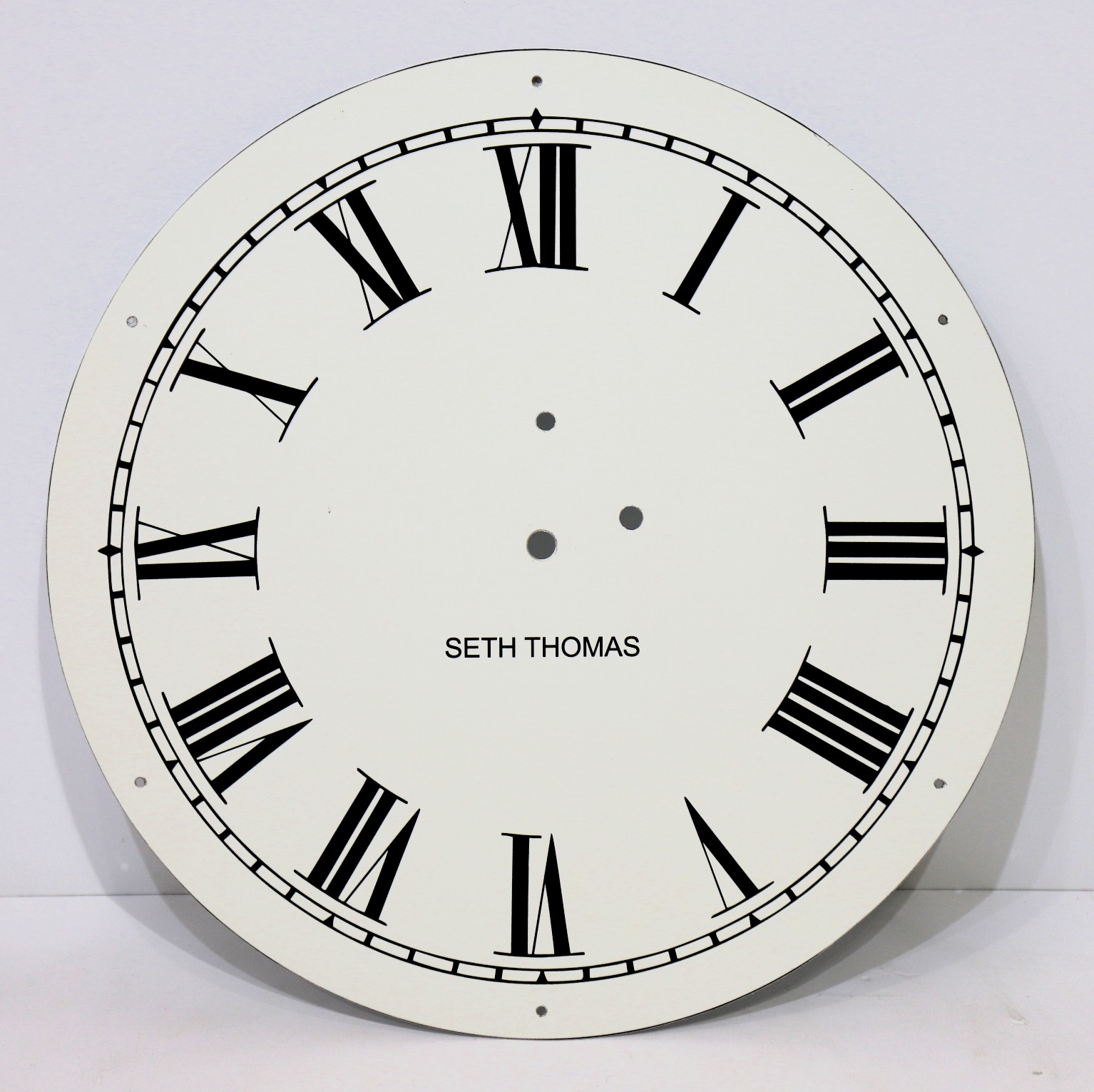 Seth Thomas (replica) 14-inch dial. Full diameter of 15.5 inches on painted aluminum (14-inch diameter time-track). Winds at the number 2, with seconds bit opening. Fits a Seth Thomas No. 62 movement (item 609). $25–$100.