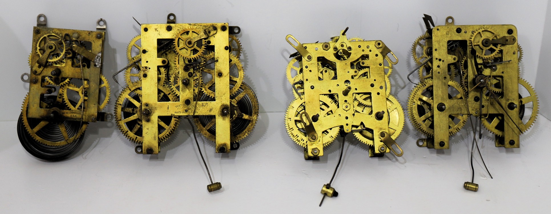 Four brass 8-day spring movements. Sessions time-only, solder repair to anchor stay; Waterbury time-and-strike, takes a 10-inch pendulum; New Haven front-mount time-and-strike;