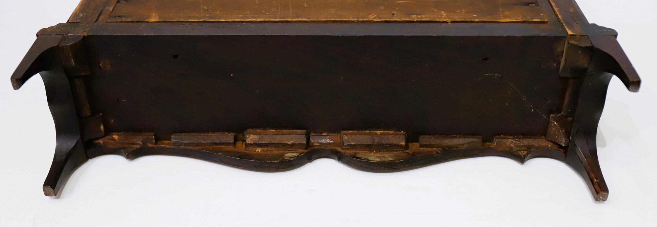 the mahogany veneer without damage or obvious repair. The scroll top, feet, and skirt look old, and with no repairs to the scroll