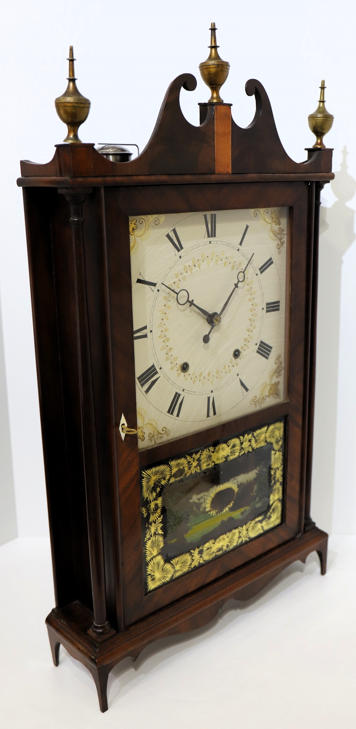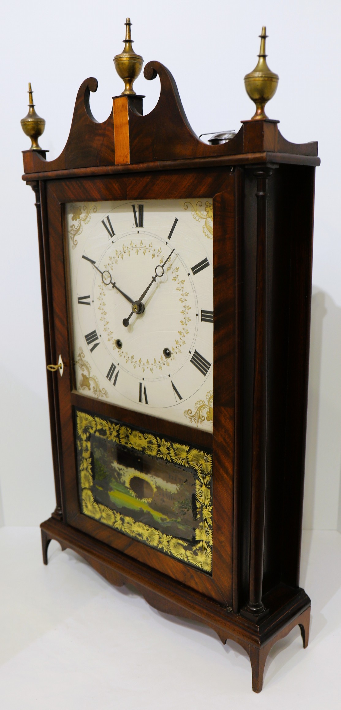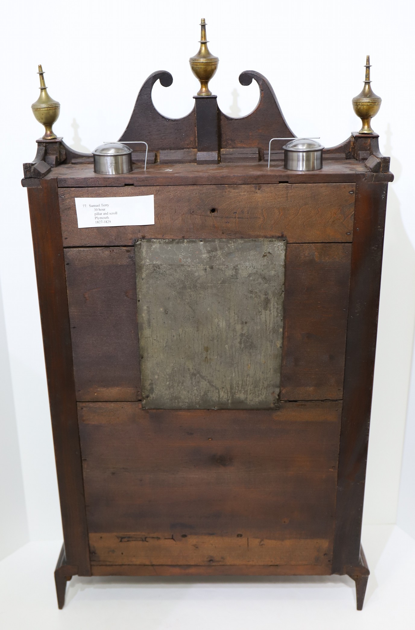 Samuel had set up his own shop in Plymouth in 1819 and was making some clocks outside of his partnership with his older brother. The 31-inch case has an old finish with some patina; the brass urn finials are on wooden posts, the scroll-top is undamaged, and the