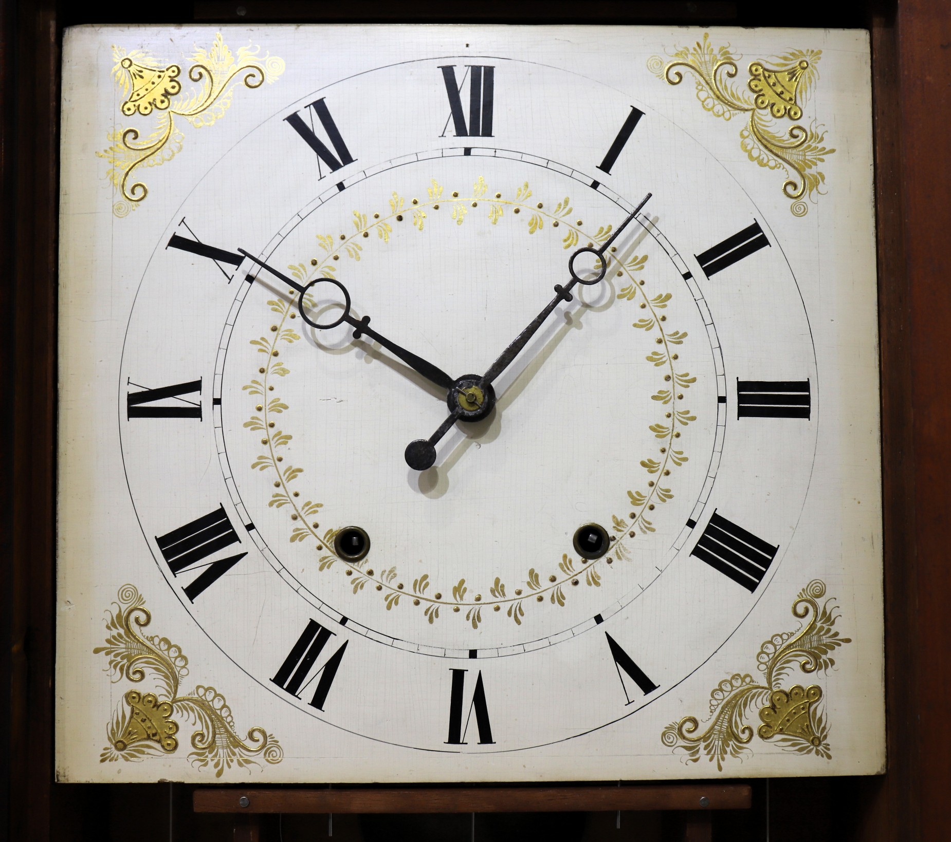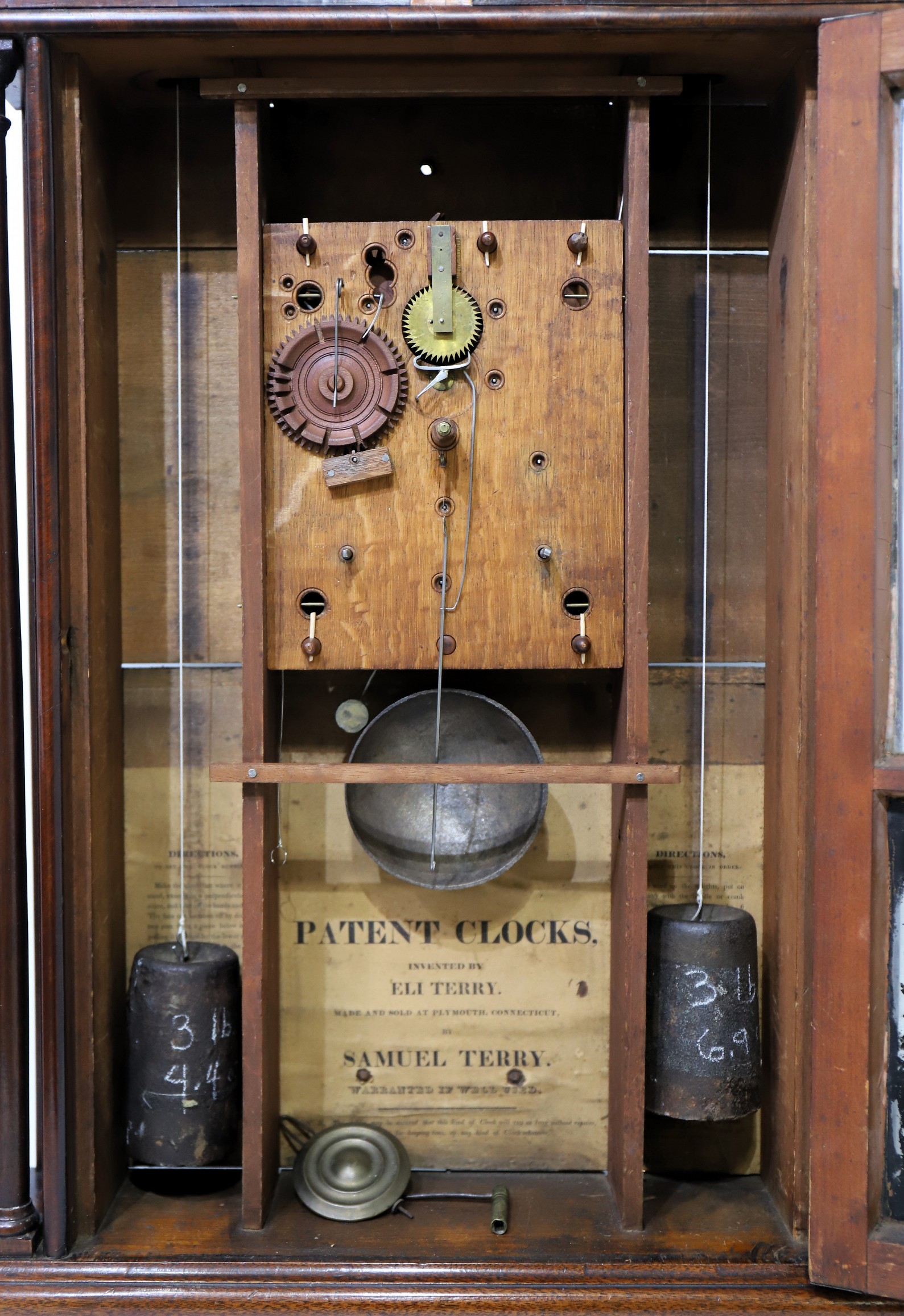 feet and skirt look original. Both glasses are original with the original putty; the tablet has suffered considerable losses. The wooden dial is clean with good gilding in the corners and a gilded inner ring. The hands are typical for Samuel Terry. The wooden 30-hour time-and-strike movement doesn’t want to run but it will strike; there are two period weights, period pendulum