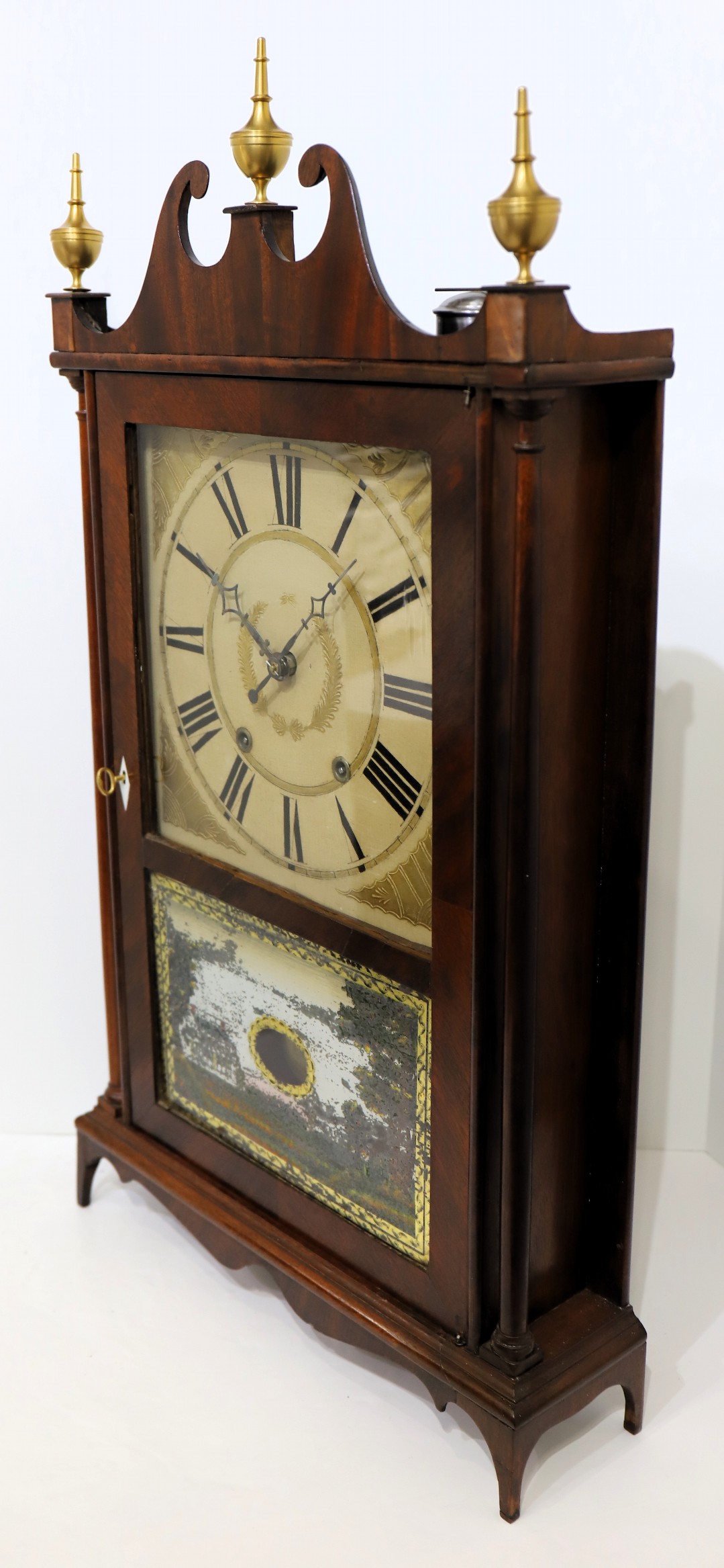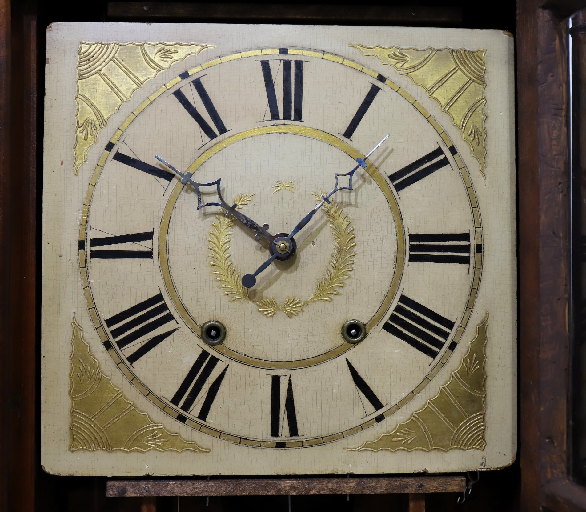 hand seems a bit short. The 30-hour time-and-strike wooden movement is running and striking without issue, with two period cast