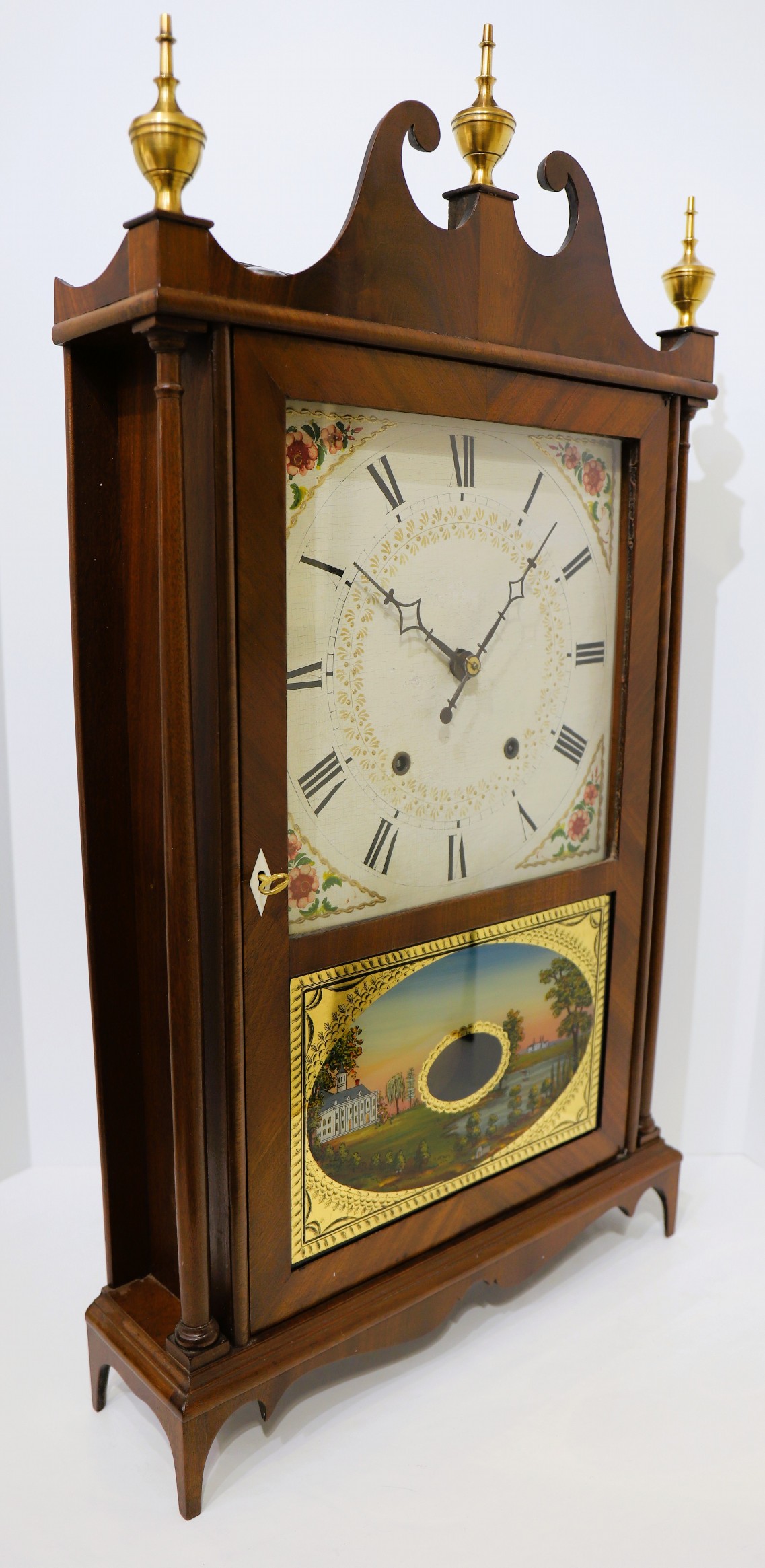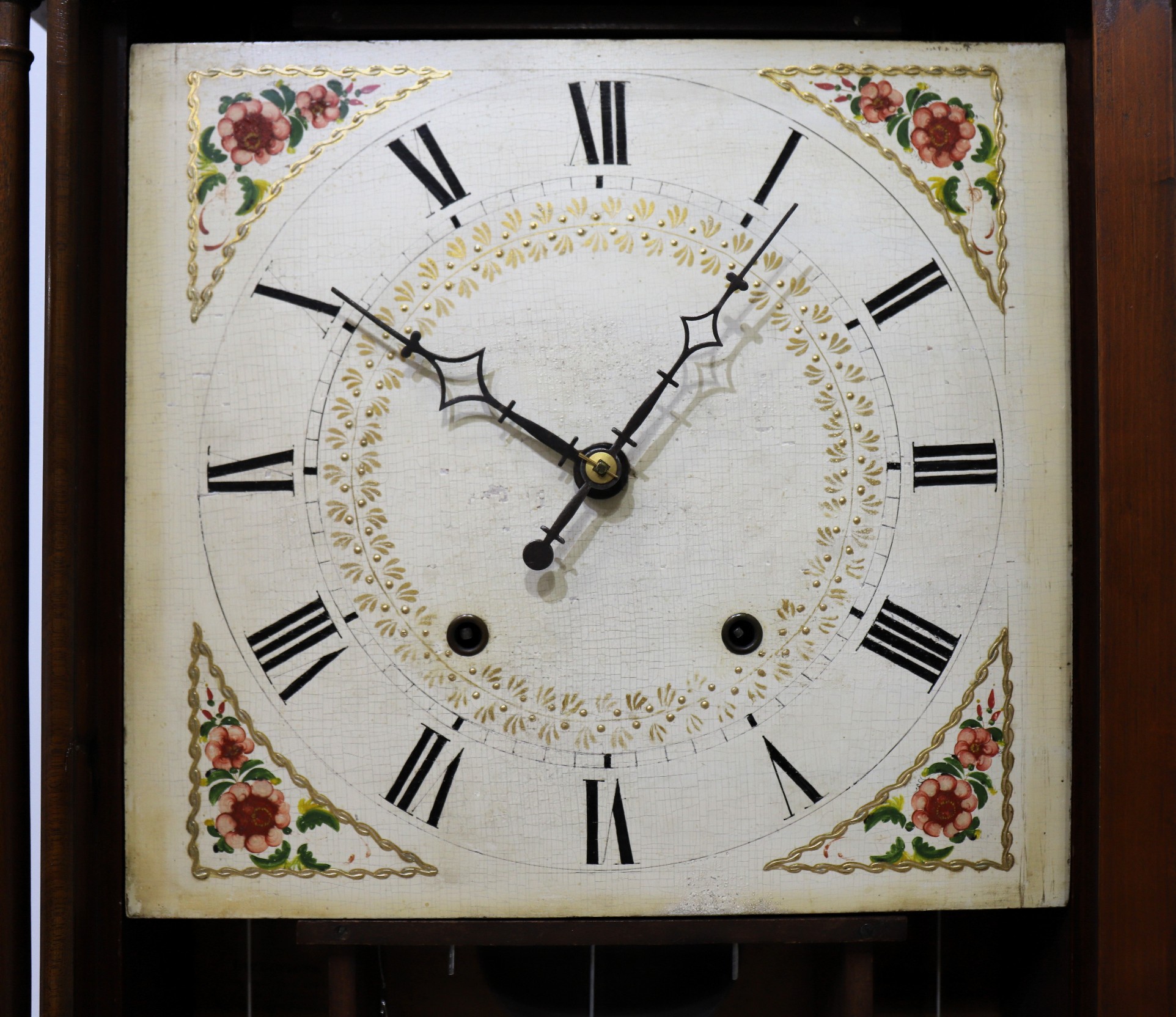 appear to be original. The dial glass is original, with the original putty, the lower glass is modern with a great tablet. The wooden dial is clean and colorful, with some degradation to the center area; note the gilded decoration inside the chapter ring. The hands are period. The wooden 30-hour time-and-strike movement is running and striking on the iron bell without problem. There are two period weights, an old pendulum bob, and a good label. $250–$400.