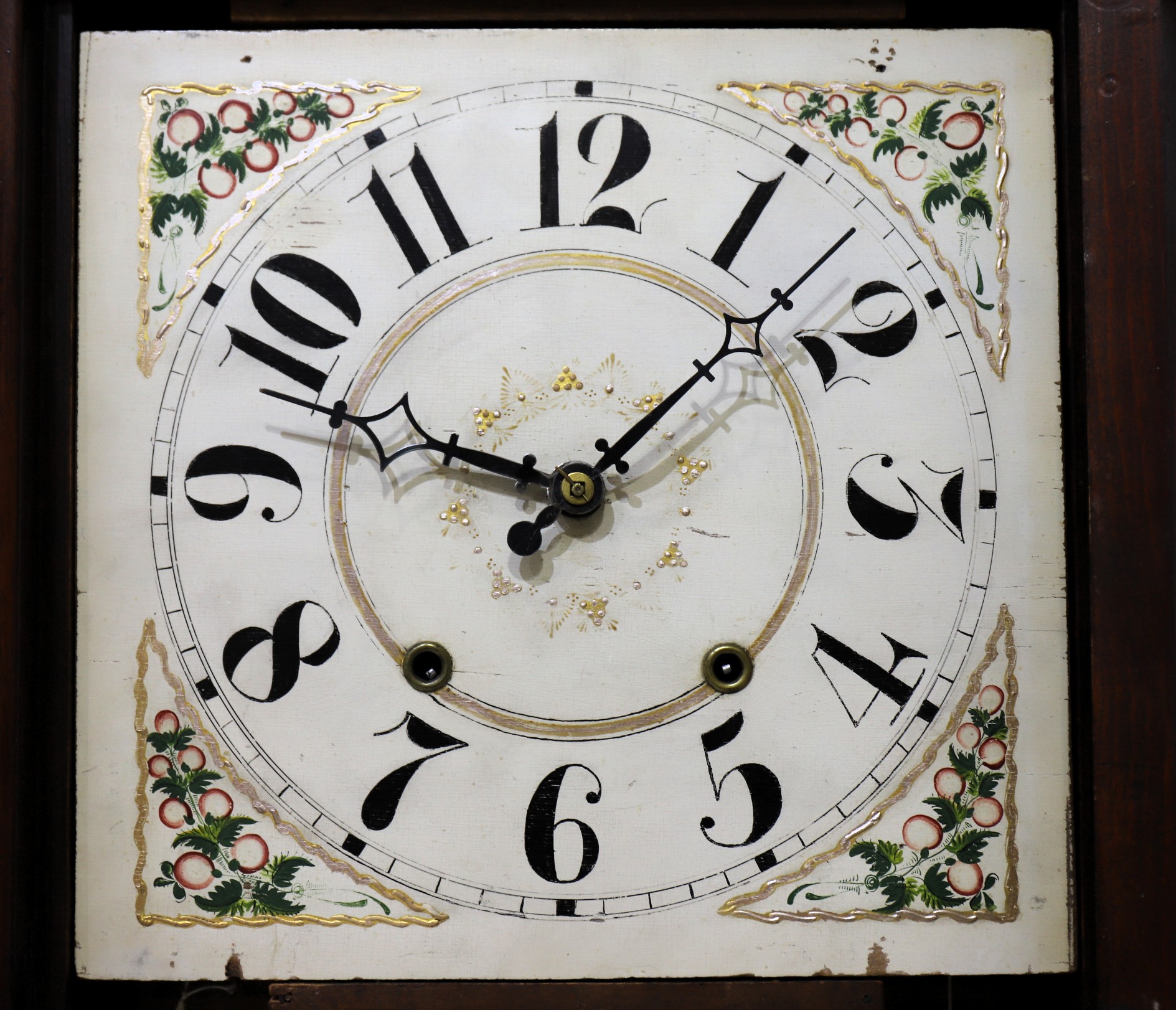 has been touched up; the hands are appropriate. The wooden 30-hour time-and-strike movement is running strongly and striking
