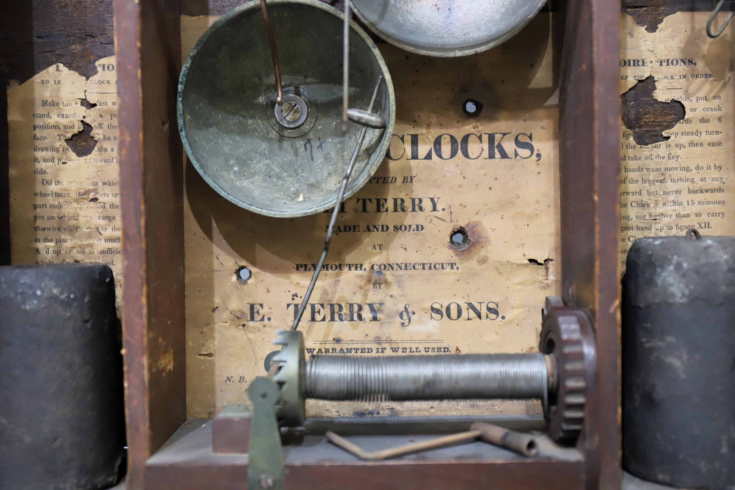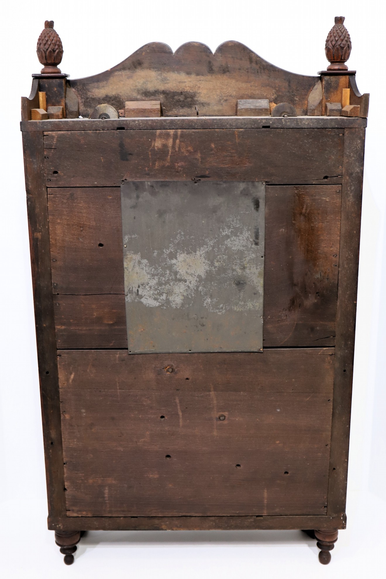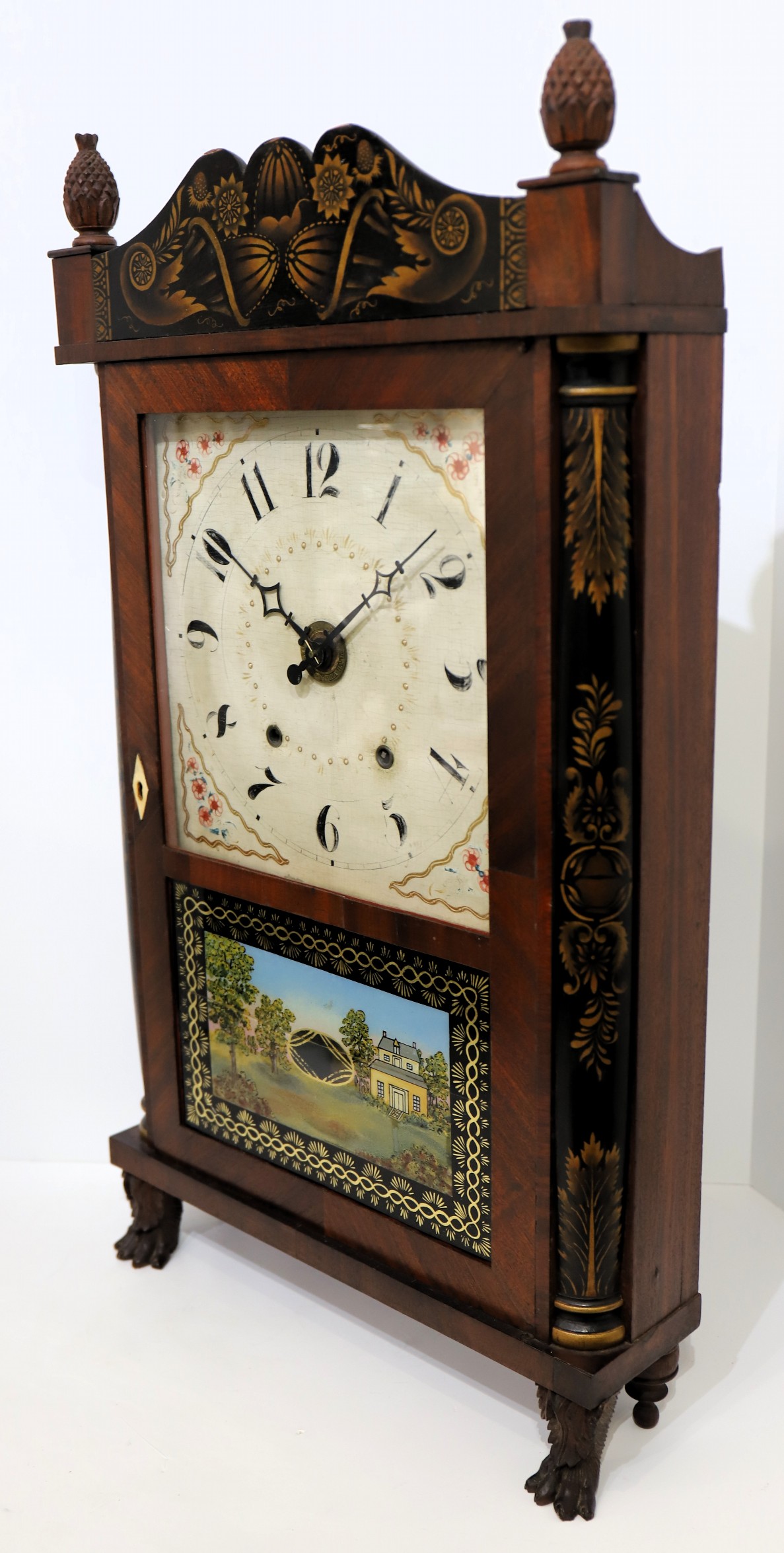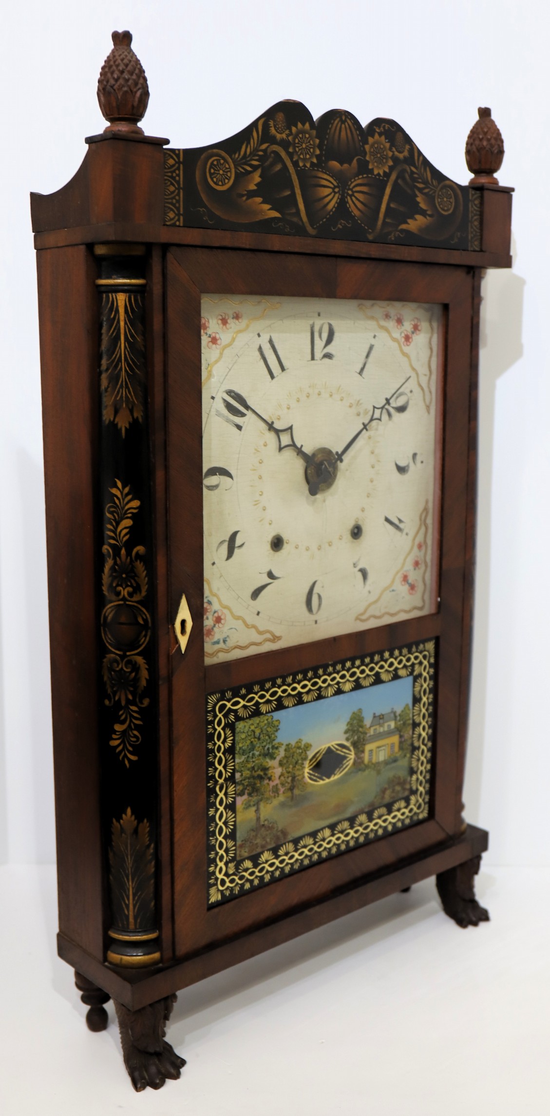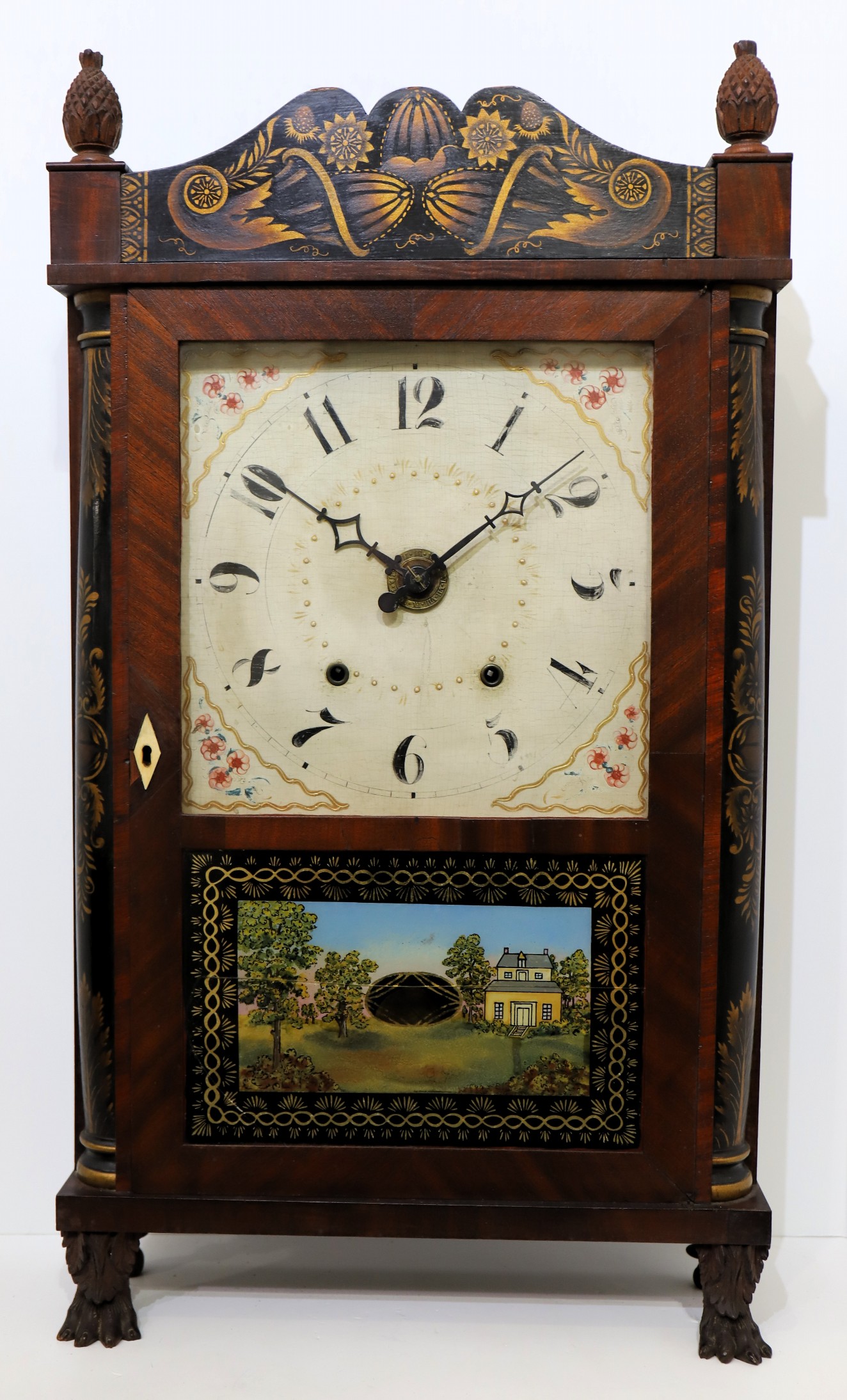 Sons quarter-column & splat with window-shade alarm, 1823-1831. A 29.5-inch case on paw feet in front and turned feet in