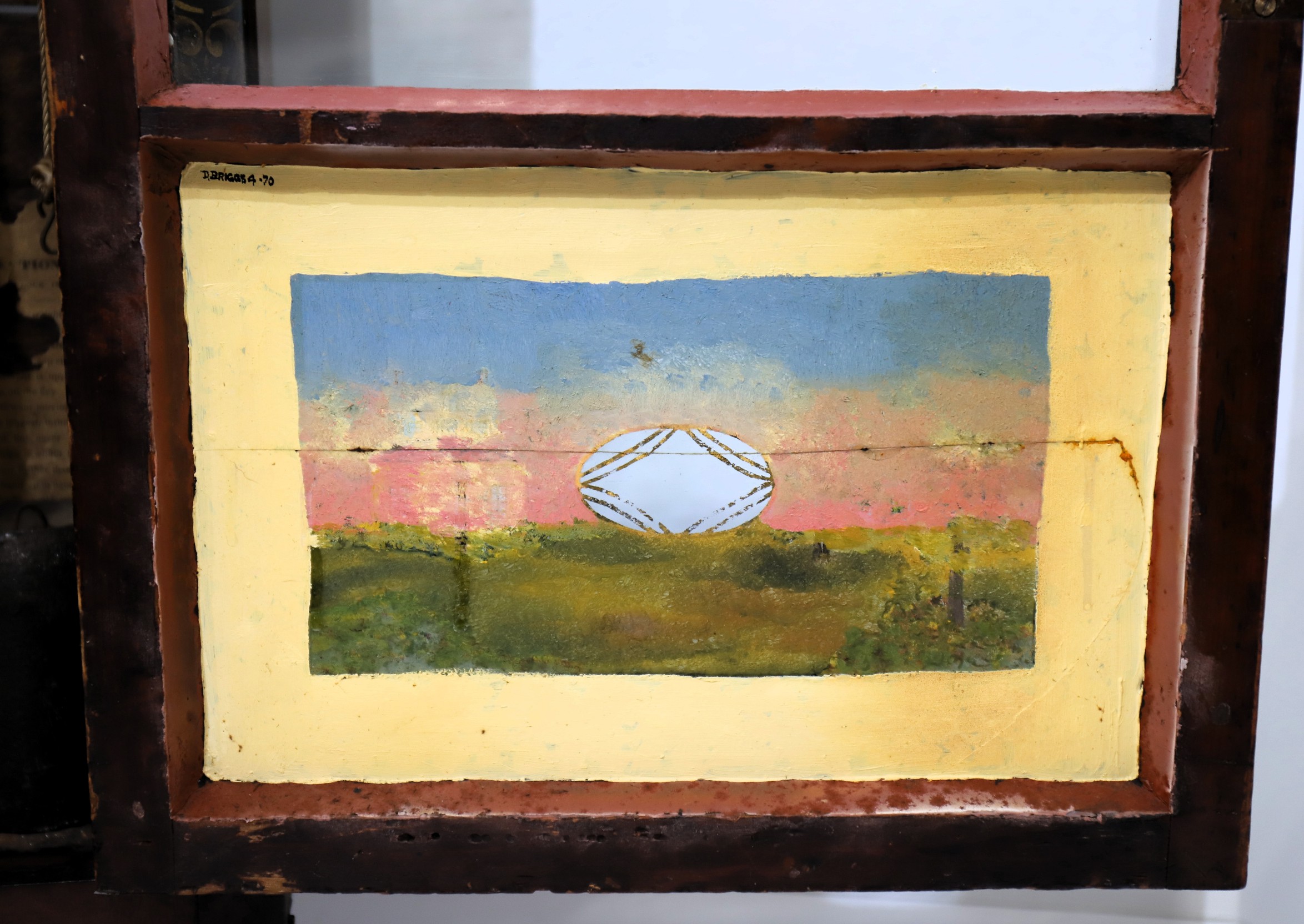 on a wooden base. The wooden 30-hour, time-and-strike movement with the alarm attachment will not run and I did not remove it