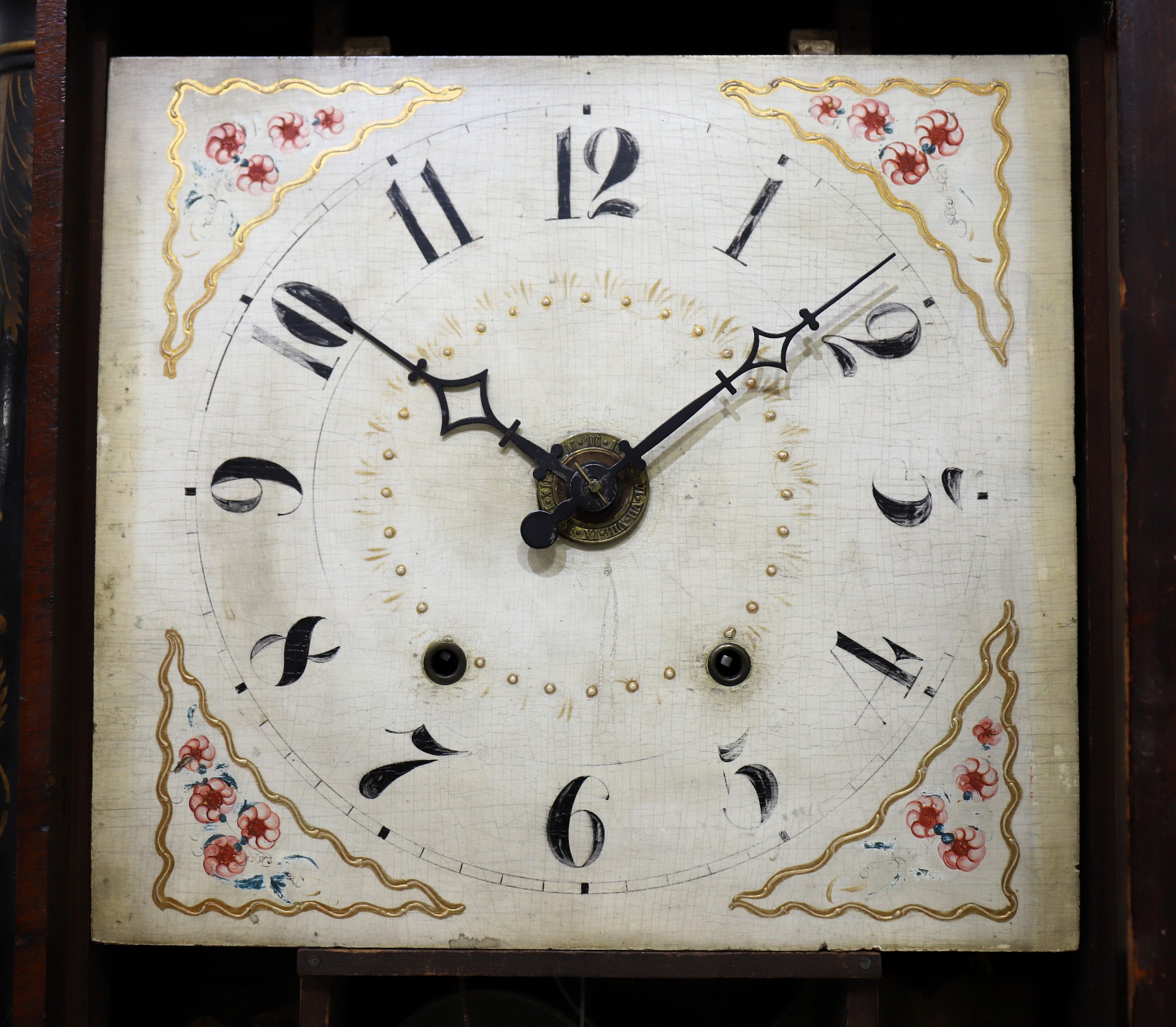 on the quarter columns and splat is quite bright, the pineapple finials look old, and both glasses are old with newer putty. The tablet was repainted in 1970 by D. Briggs. The period/original dial is in clean condition with interesting spandrels; there