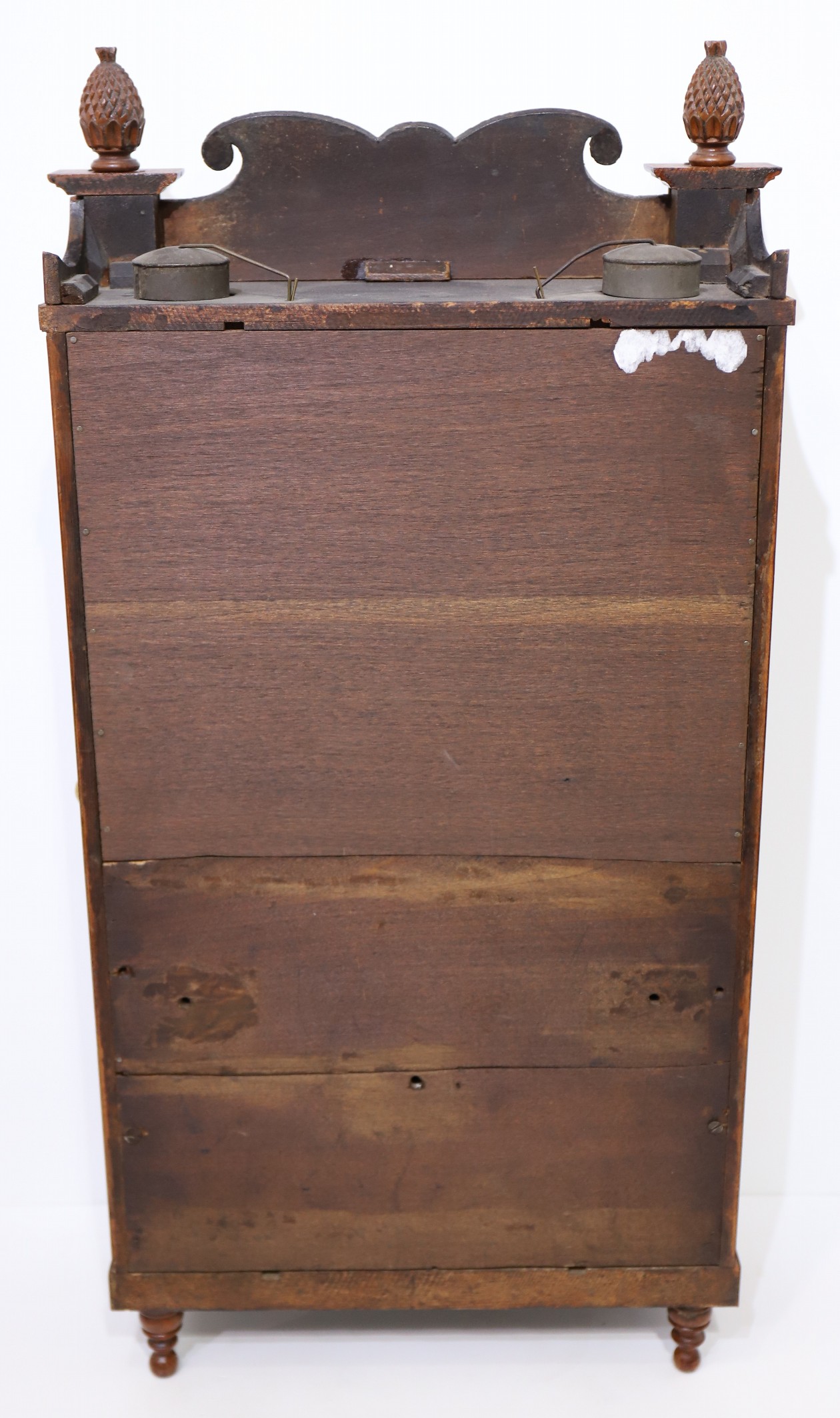 cousins. The clock is 29 inches tall with the period carved pineapple finials and 14 inches wide. There are some veneer