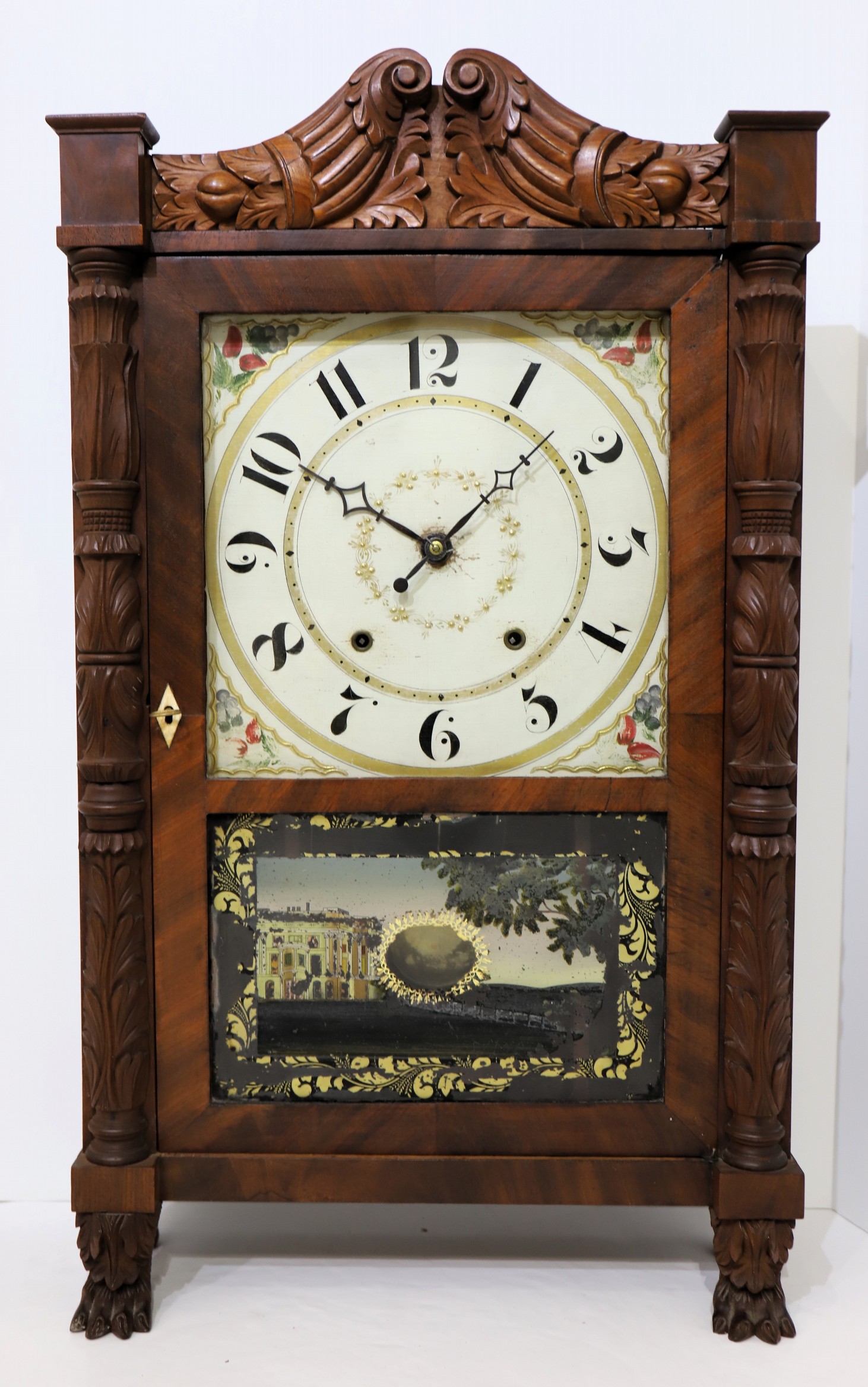 and gilding, the hands are period and appropriate. The wooden 30-hour time-and-strike movement is running and striking, with
