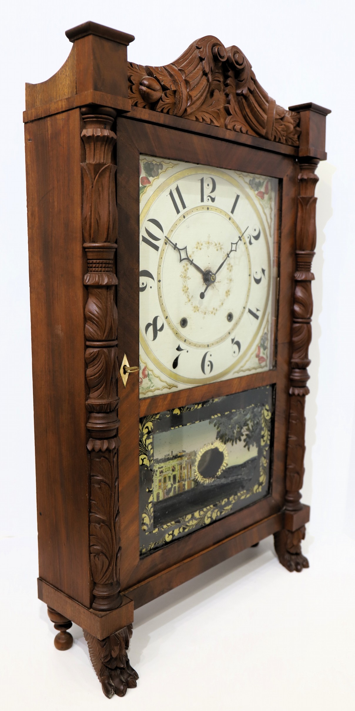 column & splat shelf clock, ca. 1835. A 29-inch case with good mahogany veneer, a clean finish, and carved half-columns