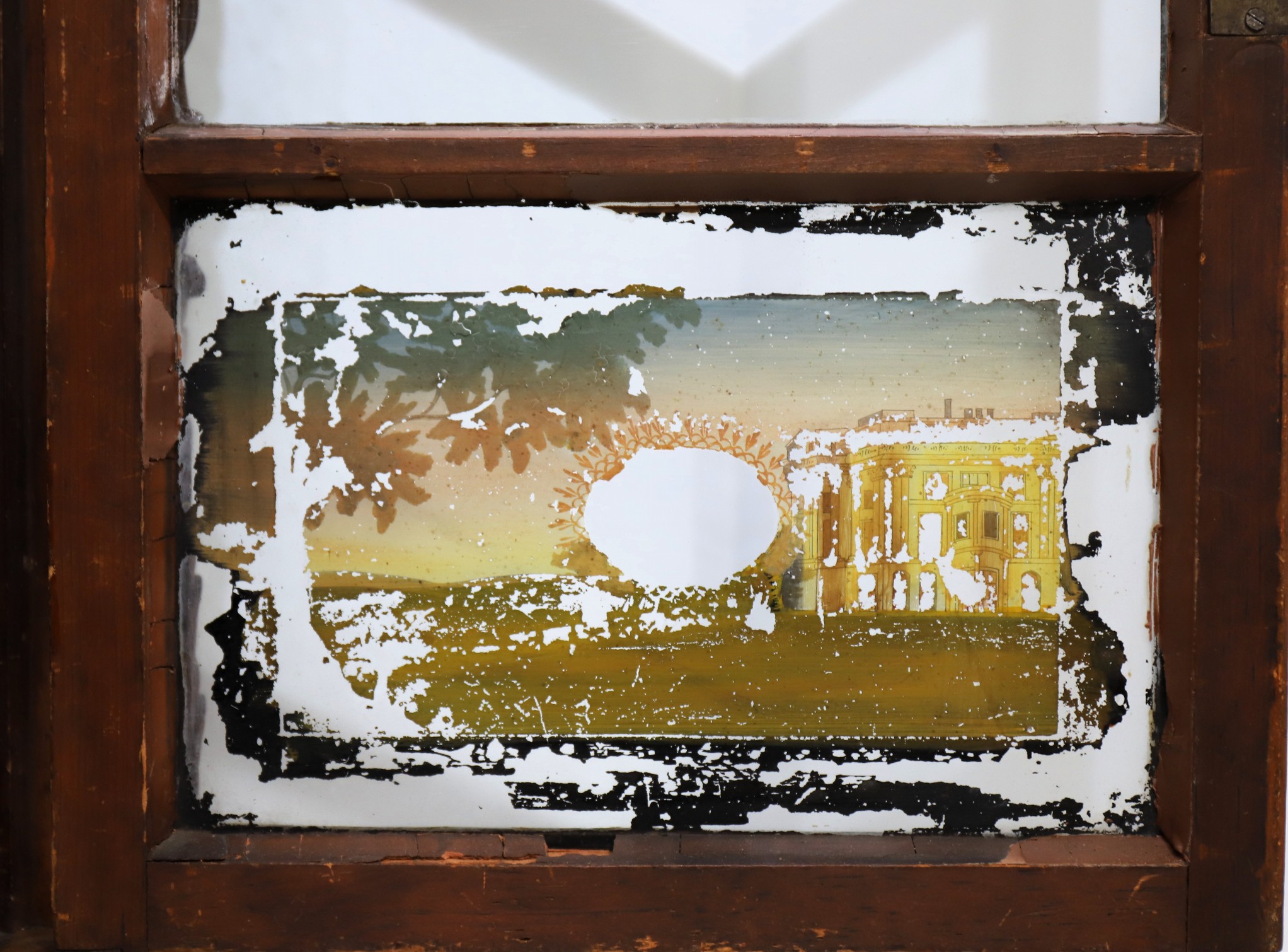 glasses are old with old putty and may be original; the tablet has considerable losses. The wooden dial is clean with good color