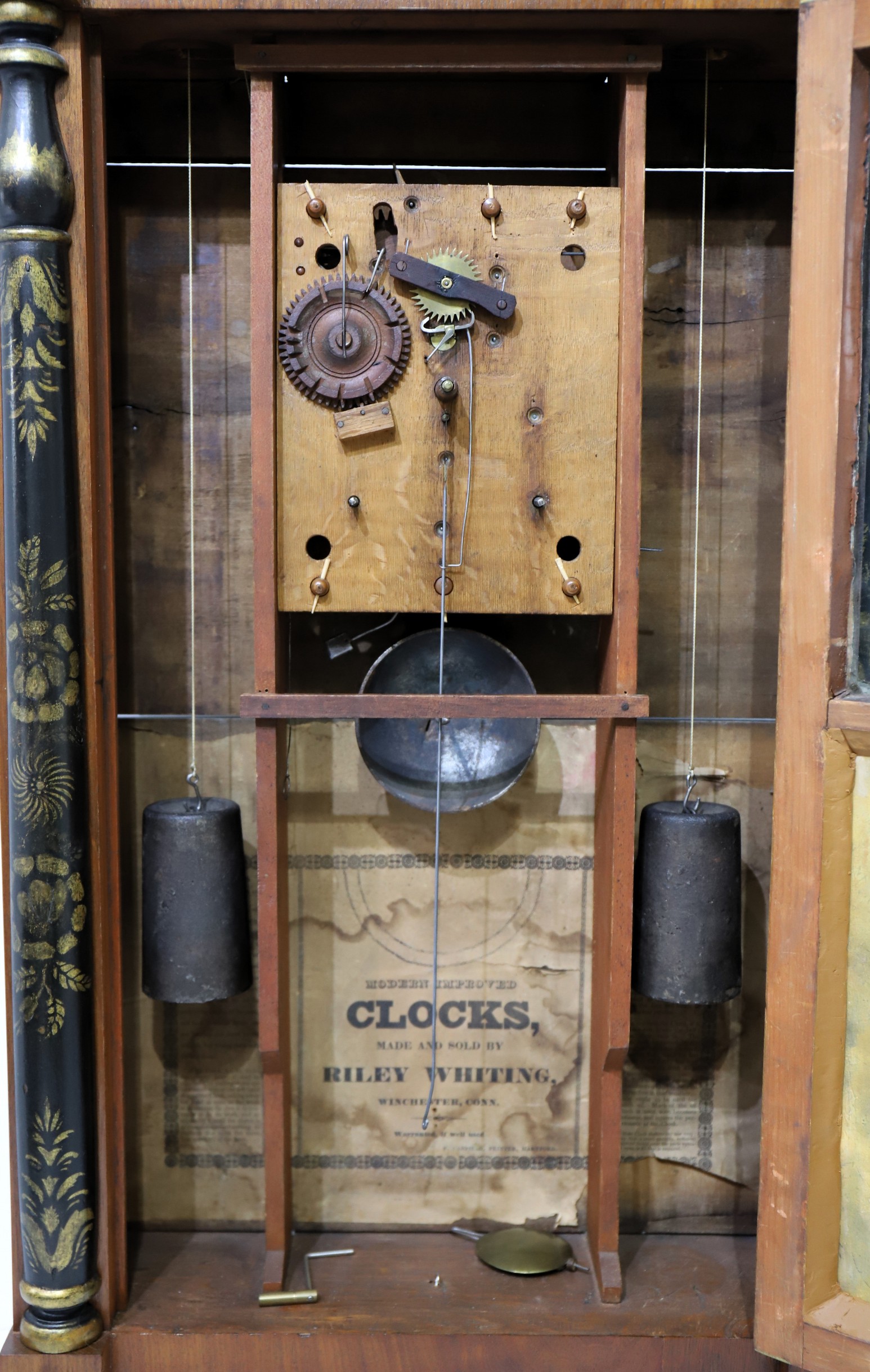 time-and-strike movement is running like a champ, striking on the iron bell, with two period weights. It is a Whiting movement