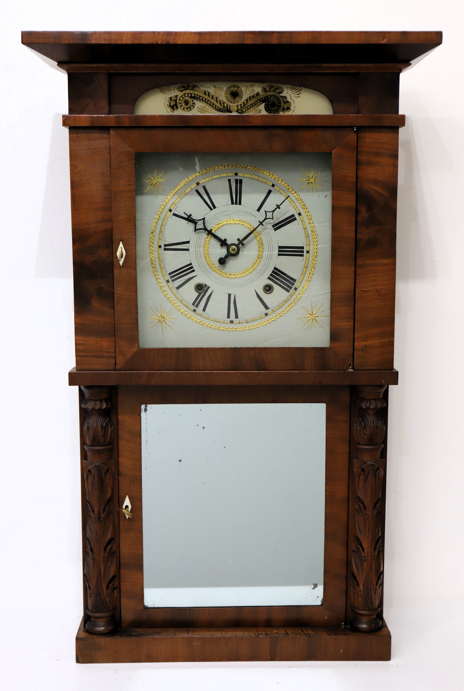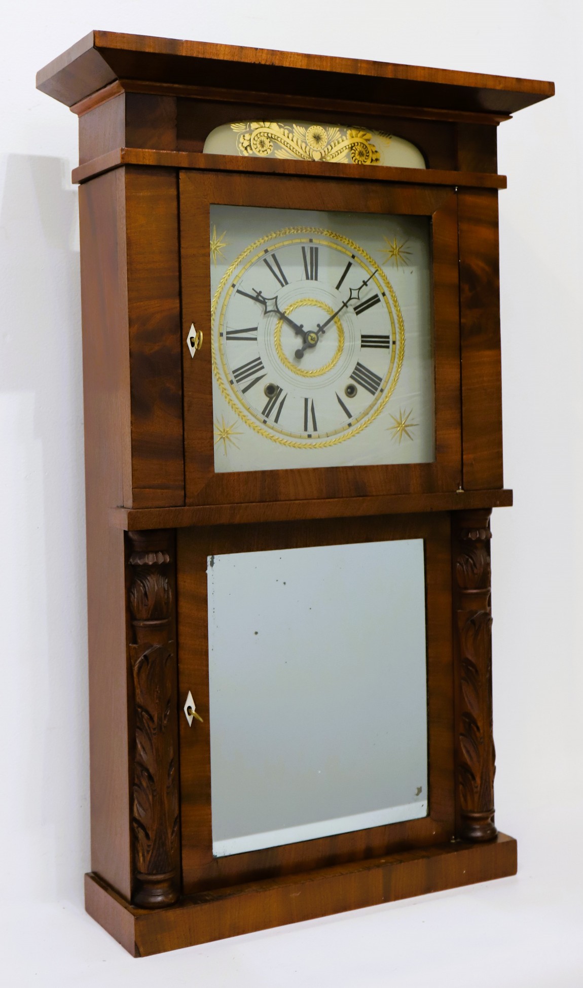 striking. The figured mahogany case is 33 inches tall with carved half-columns flanking the lower door. There is