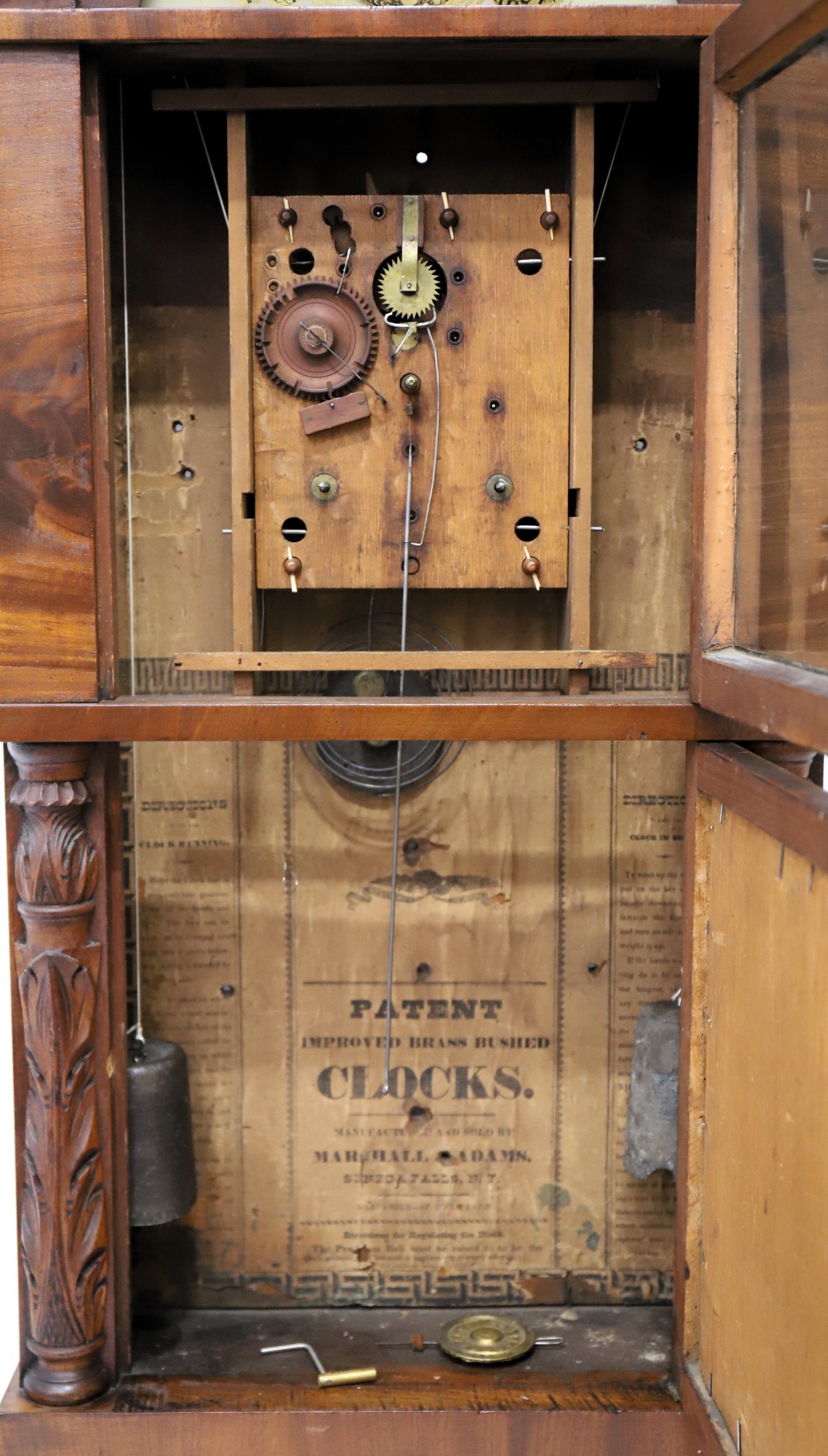working latches and keys. The wooden dial is clean with gilding and is the typical grey/green color of Marshall and Adams clocks. The hands are period and appropriate. The wooden 30-hour time-and-strike movement was likely made by the Jeromes and has brass
