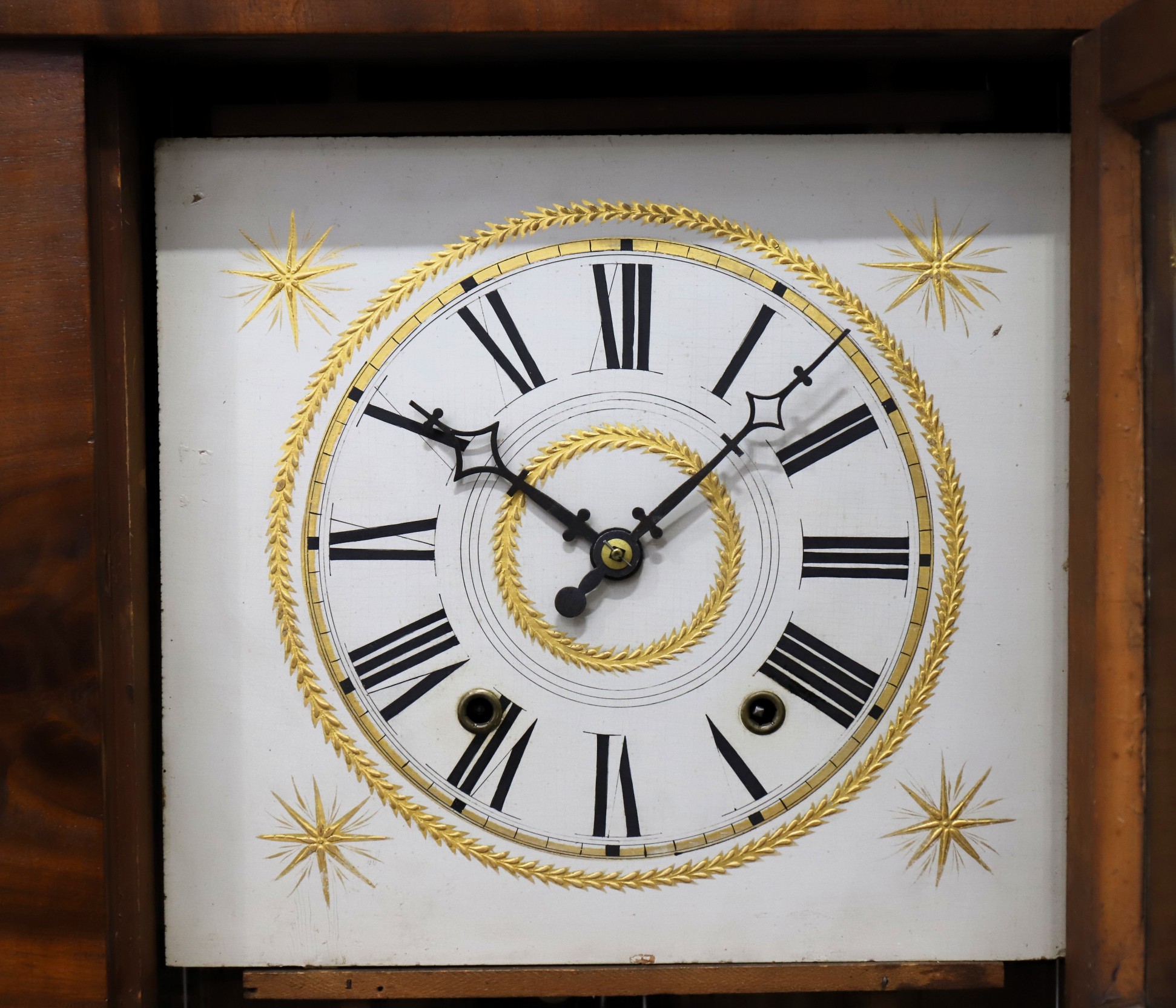with either wooden works or strap-brass movements. This example contains a 30-hour wooden movement that is running and