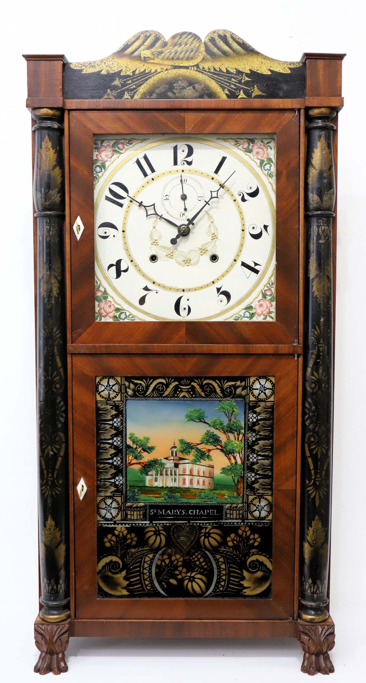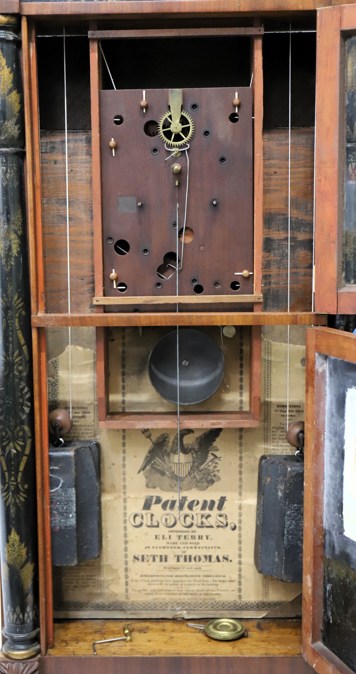 plate movement (Type 1.22) designed by Eli Terry and probably manufactured by E. Terry & Sons. The mahogany-veneer case
