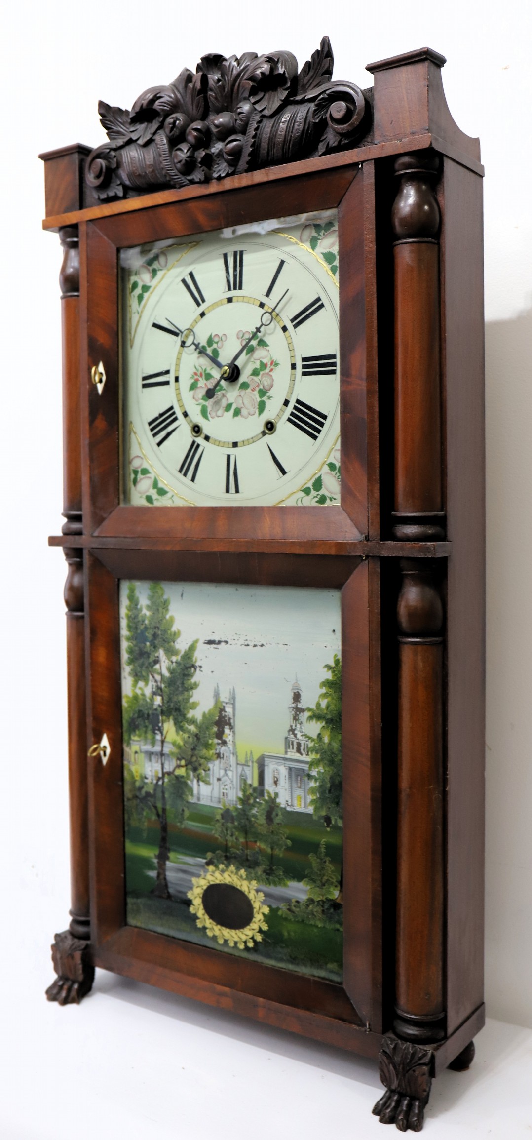 works clocks (and the occasional brass clock). By this time the name of the town became Terrysville, as found on the label here. The 39-inch case has good mahogany veneer all around with an old finish; there is a carved fruit basket splat and four smooth half-columns