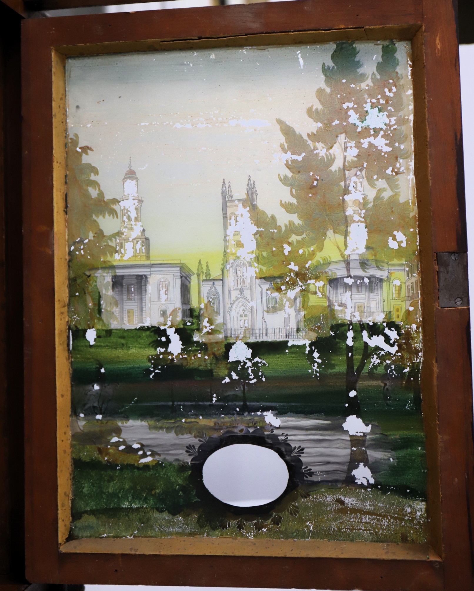 putty is newer; the well-preserved period tablet has only modest flaking. The wooden dial is clean with the typical Terry floral
