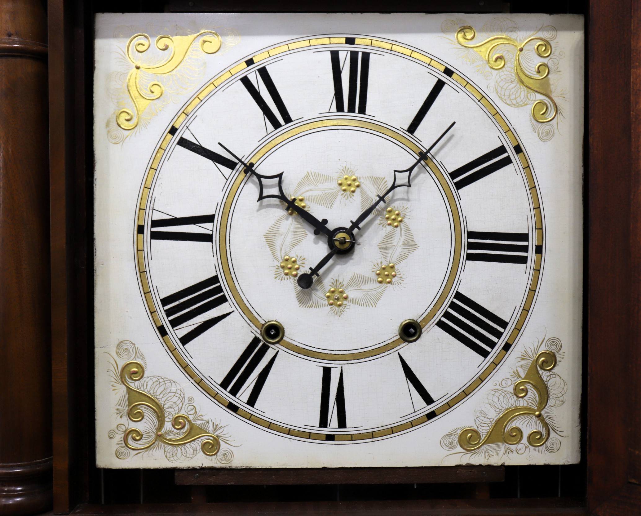 is clean with good gilding, the hands are proper and period. The 8-day, time-and-strike wooden Whiting movement is running and