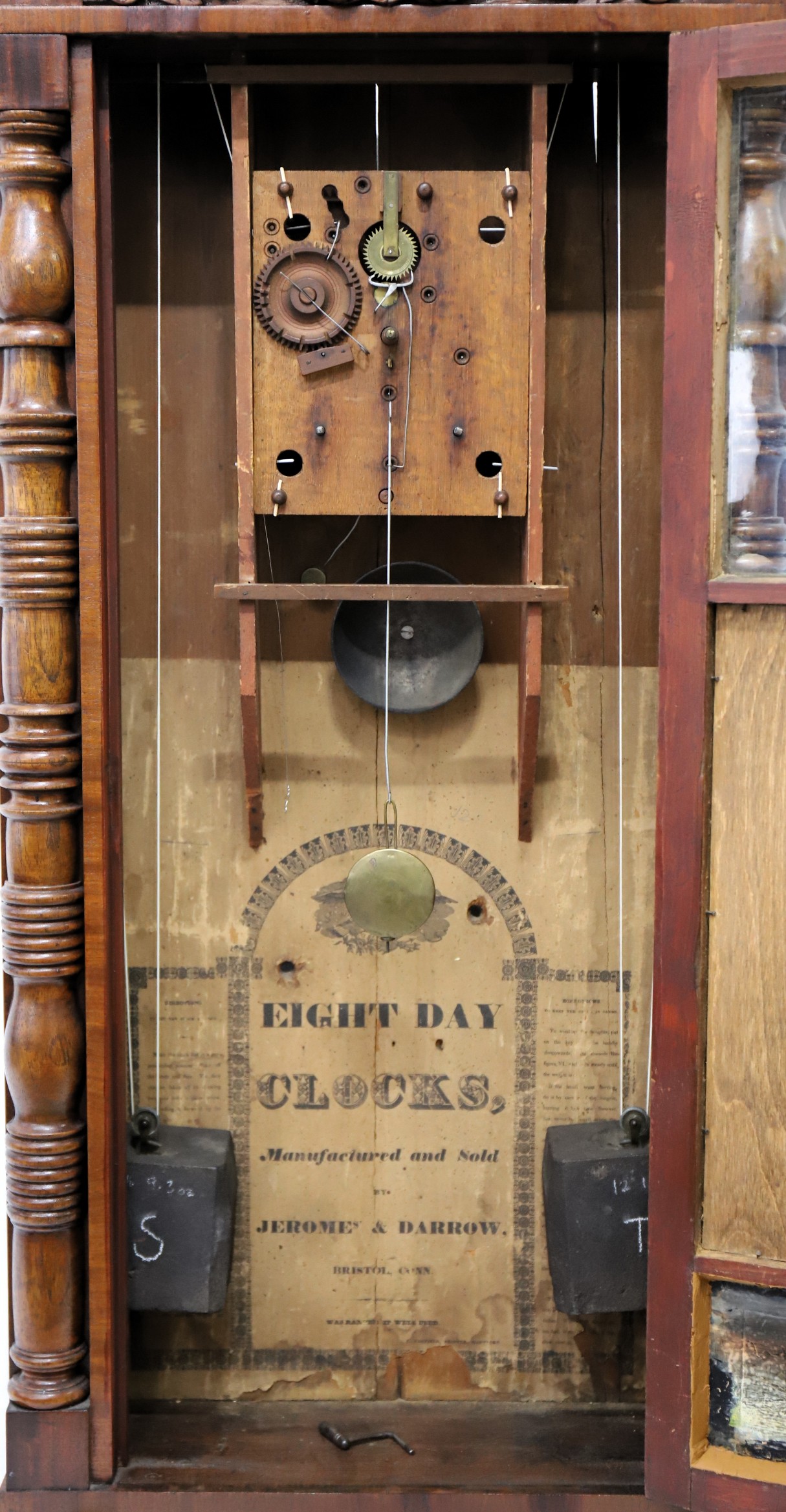 by two proper and period 8-day, 12-lb weights compounded on metal pulleys that are not original. There is a good label. A pretty good example here, and 8-day wooden works clocks are not common. AAC sold a similar example in 2023 for $485. $400-$500.