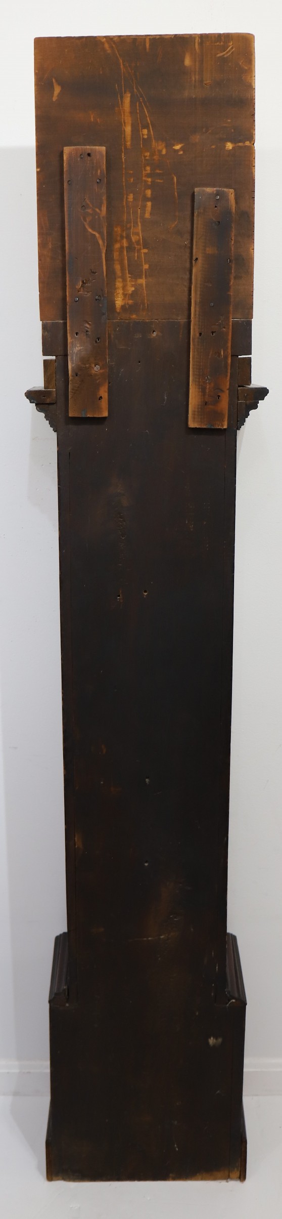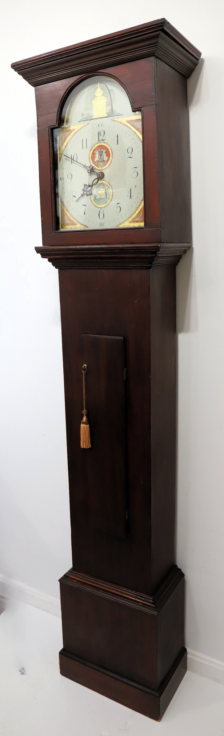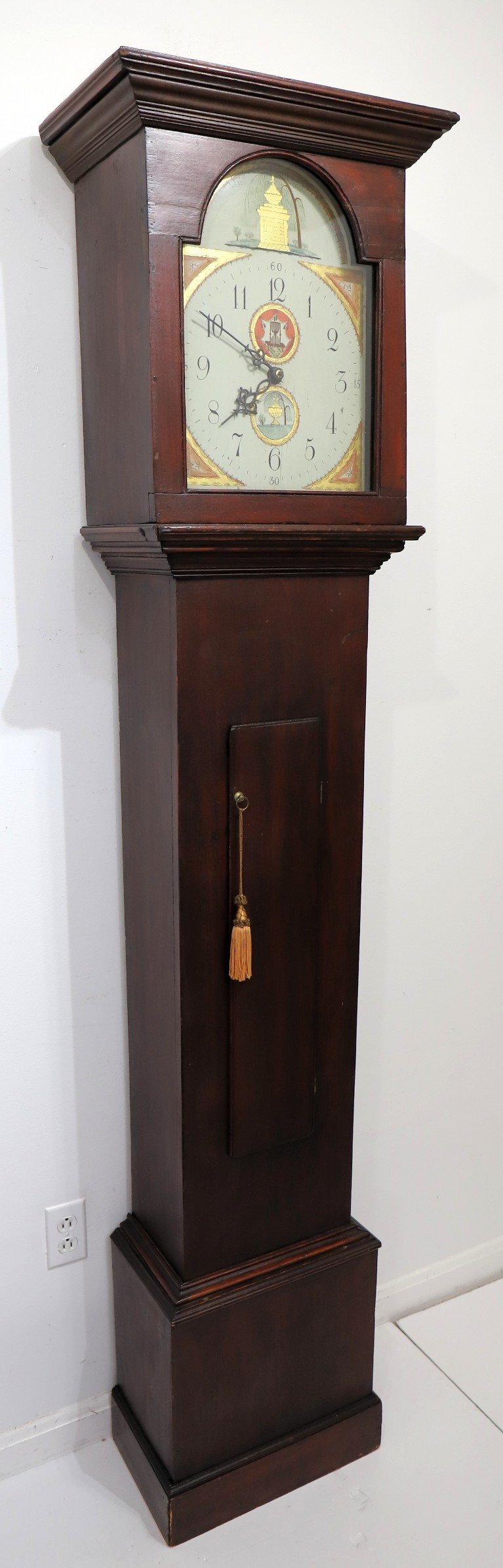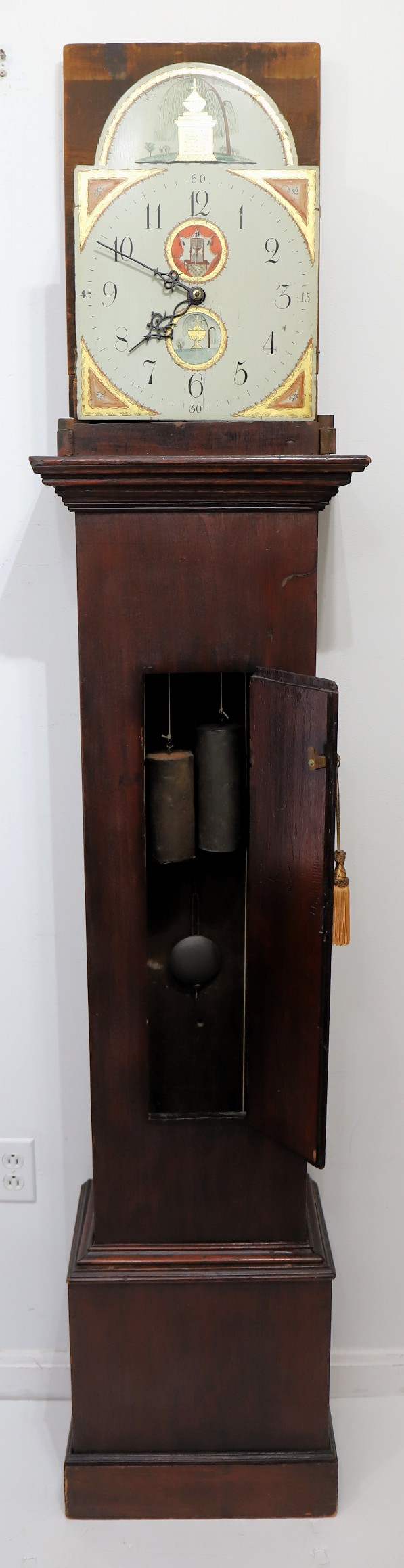 Unnamed thirty-hour wooden tall case clock, ca. 1816. An 81.5-inch case, probably pine, based on the grain I can see through the stain and slightly crusty finish. This clock was probably grain-painted early on. Nonetheless, it looks great now, with an old, mahogany-stained finish. The hood does not have a door, but there is old glass, and so, to set the hands you have to pull the hood off. It did not ever have a door that I can tell, but it may not have always had a glass. The dial and hood fit together perfectly, suggesting that the case may have been made for this movement and dial; we don’t know who made the case or the movment and dial, but my consignor says it was made by Silas Hoadley, perhaps based on the movement's design. Hoadley usually signed his dials and incuded a calendar dial, not found here. The 30-hour movement has had significant restoration and is running and striking; the dial is beautiful, perhaps too beautiful to be unrestored – maybe just professionally cleaned; I don’t think it has been repainted. The hands are cast spelter, perhaps old. There are two period tin can weights and an old pendulum rod and bob. I like this clock a lot, and that’s why I took it. Hope you do too! $450–$900.