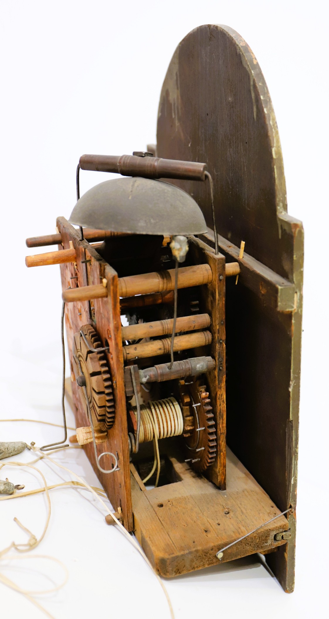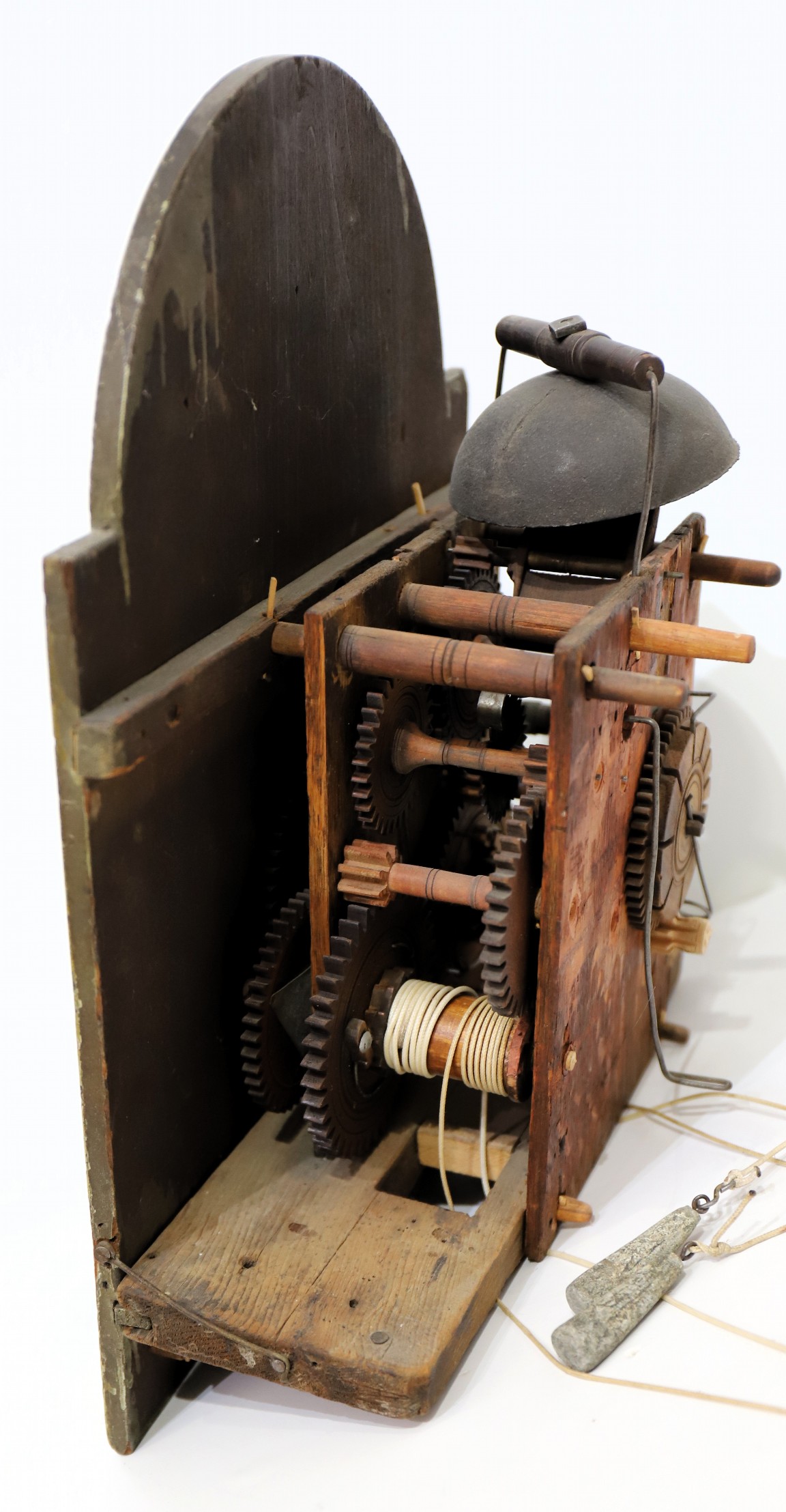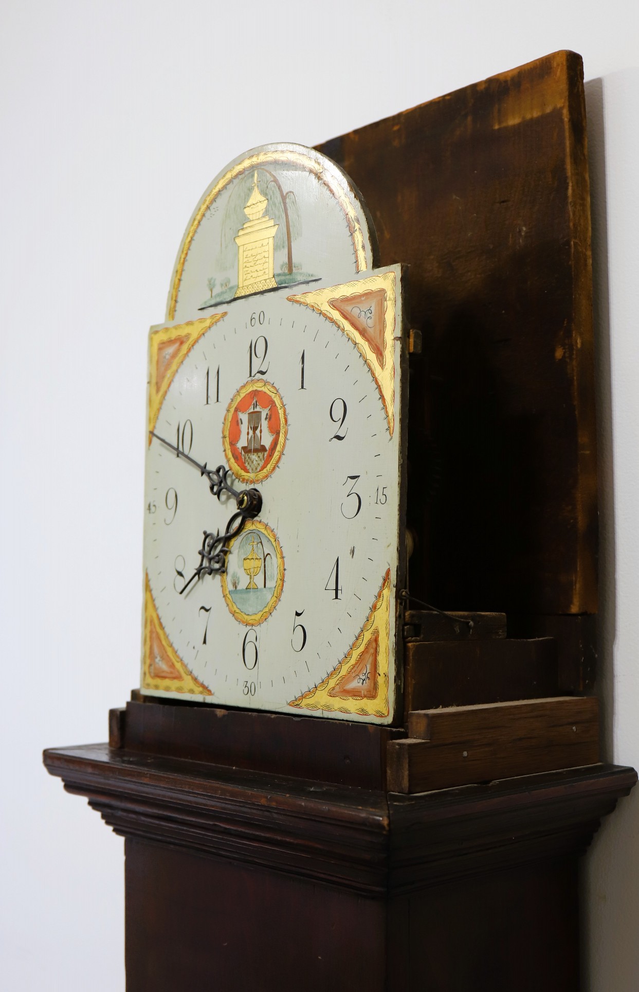 Unnamed thirty-hour wooden tall case clock, ca. 1816. An 81.5-inch case, probably pine, based on the grain I can see through the stain and slightly crusty finish. This clock was probably grain-painted early on. Nonetheless, it looks great now, with an old, mahogany-stained finish. The hood does not have a door, but there is old glass, and so, to set the hands you have to pull the hood off. It did not ever have a door that I can tell, but it may not have always had a glass. The dial and hood fit together perfectly, suggesting that the case may have been made for this movement and dial; we don’t know who made the case or the movment and dial, but my consignor says it was made by Silas Hoadley, perhaps based on the movement's design. Hoadley usually signed his dials and incuded a calendar dial, not found here. The 30-hour movement has had significant restoration and is running and striking; the dial is beautiful, perhaps too beautiful to be unrestored – maybe just professionally cleaned; I don’t think it has been repainted. The hands are cast spelter, perhaps old. There are two period tin can weights and an old pendulum rod and bob. I like this clock a lot, and that’s why I took it. Hope you do too! $450–$900.