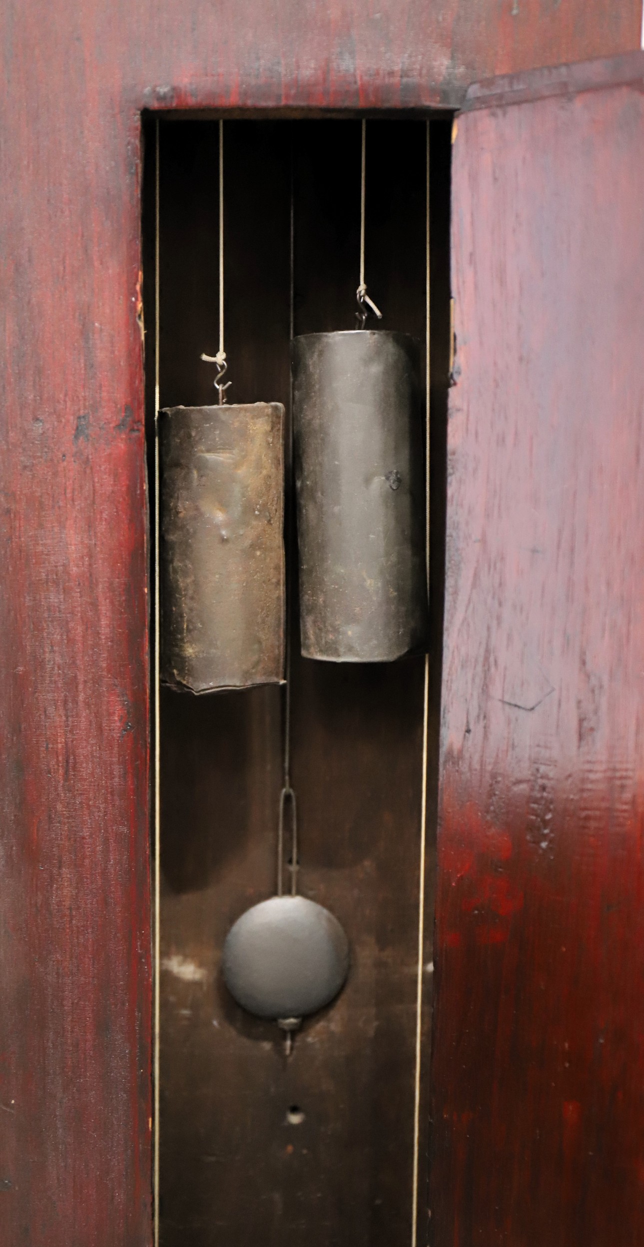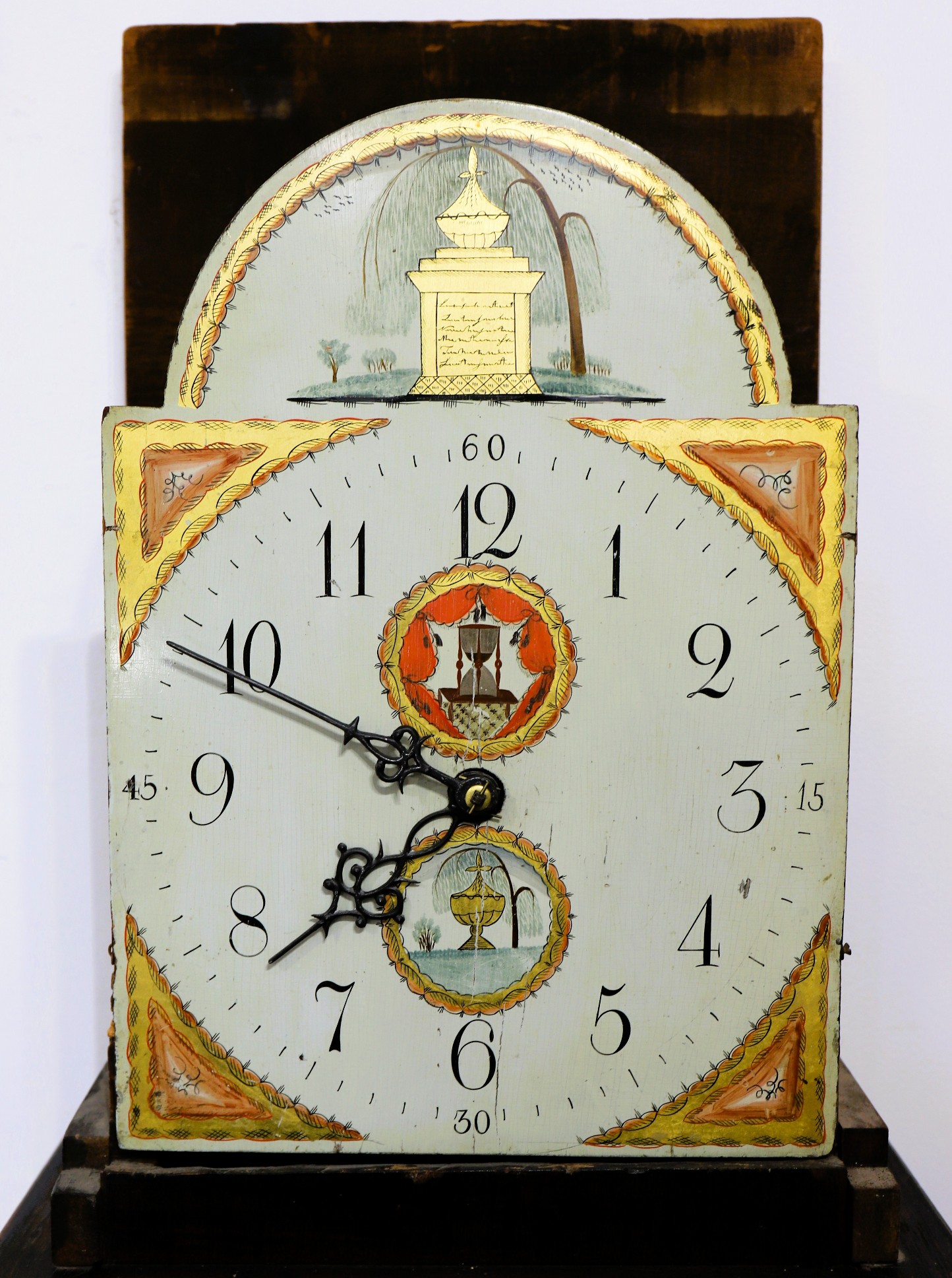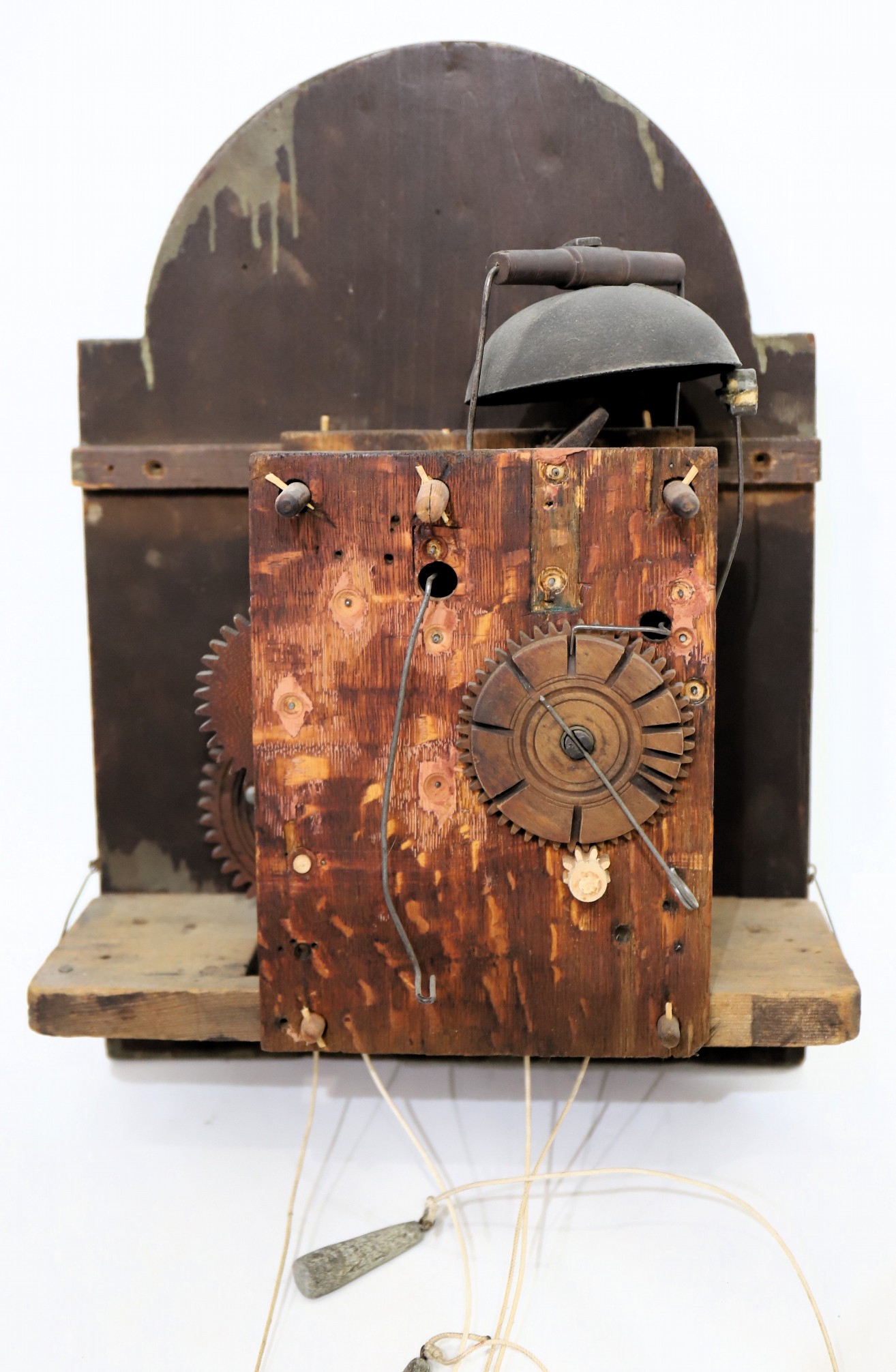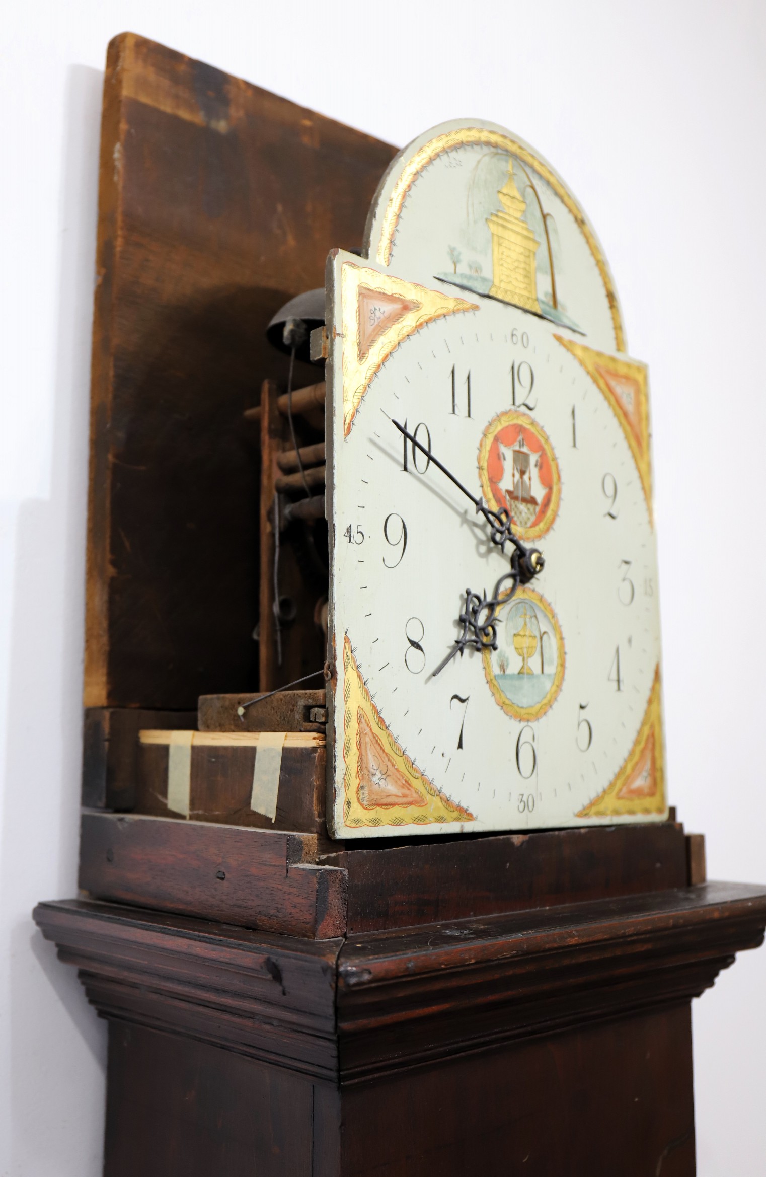 Unnamed thirty-hour wooden tall case clock, ca. 1816. An 81.5-inch case, probably pine, based on the grain I can see through the stain and slightly crusty finish. This clock was probably grain-painted early on. Nonetheless, it looks great now, with an old, mahogany-stained finish. The hood does not have a door, but there is old glass, and so, to set the hands you have to pull the hood off. It did not ever have a door that I can tell, but it may not have always had a glass. The dial and hood fit together perfectly, suggesting that the case may have been made for this movement and dial; we don’t know who made the case or the movment and dial, but my consignor says it was made by Silas Hoadley, perhaps based on the movement's design. Hoadley usually signed his dials and incuded a calendar dial, not found here. The 30-hour movement has had significant restoration and is running and striking; the dial is beautiful, perhaps too beautiful to be unrestored – maybe just professionally cleaned; I don’t think it has been repainted. The hands are cast spelter, perhaps old. There are two period tin can weights and an old pendulum rod and bob. I like this clock a lot, and that’s why I took it. Hope you do too! $450–$900.