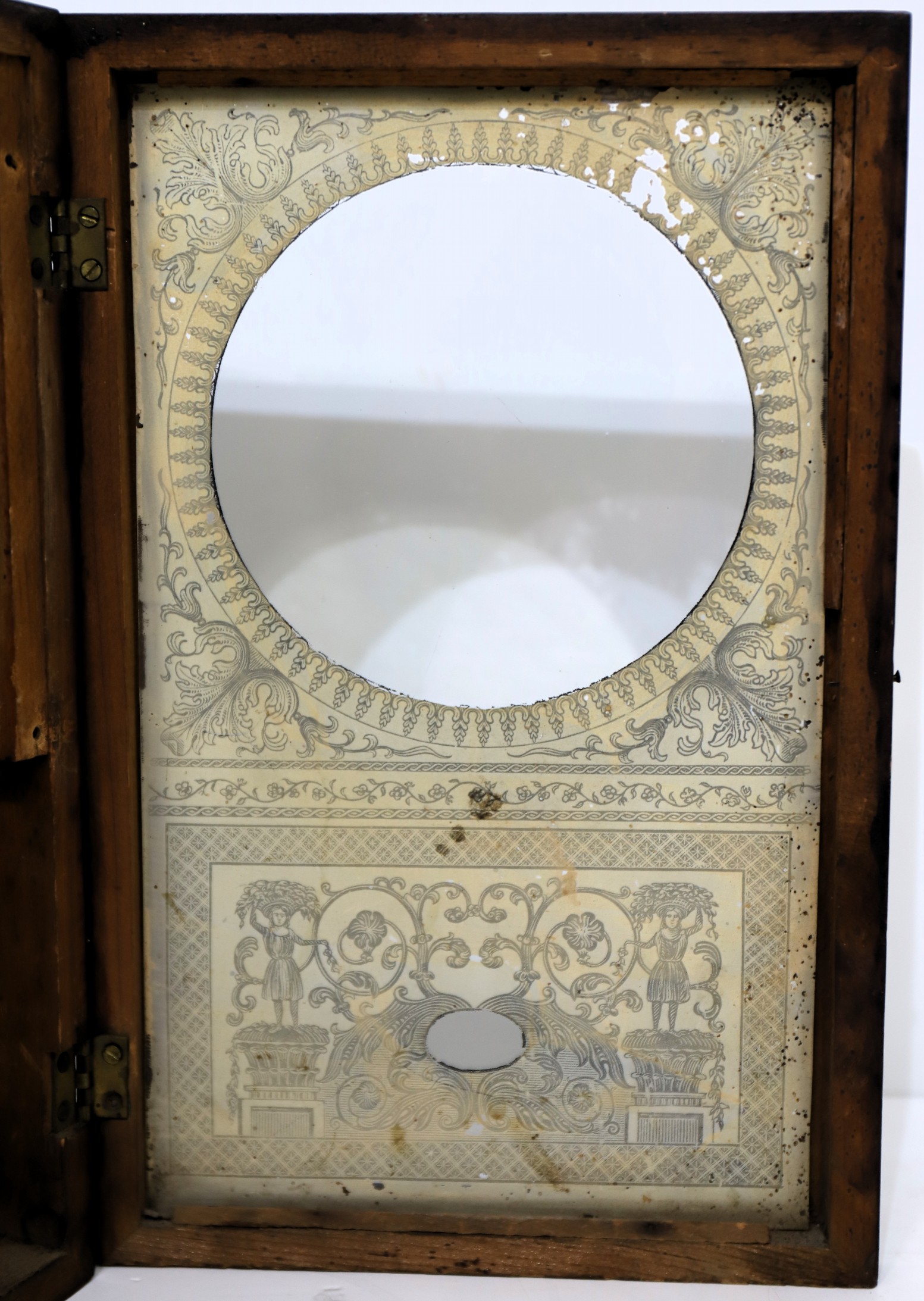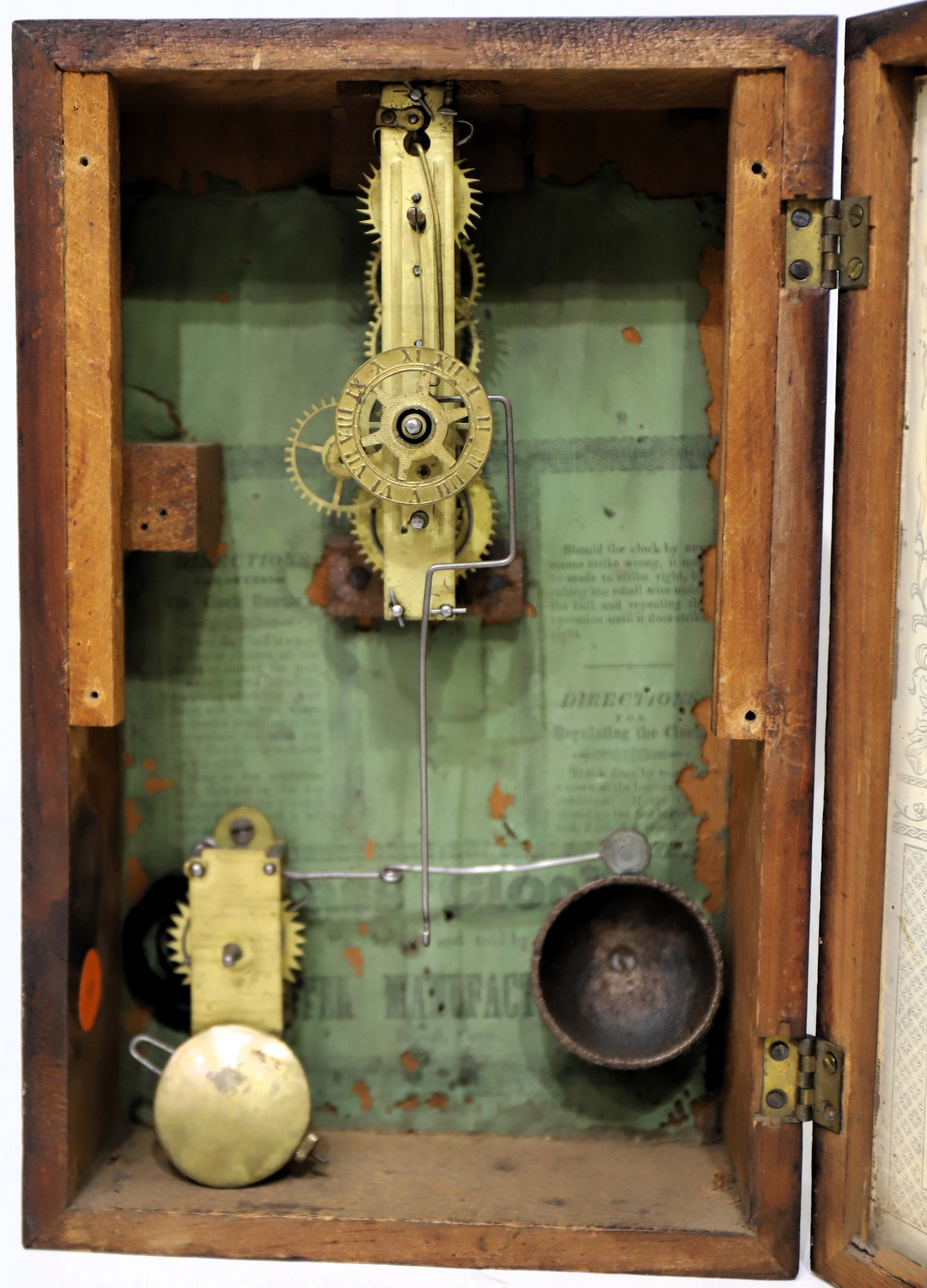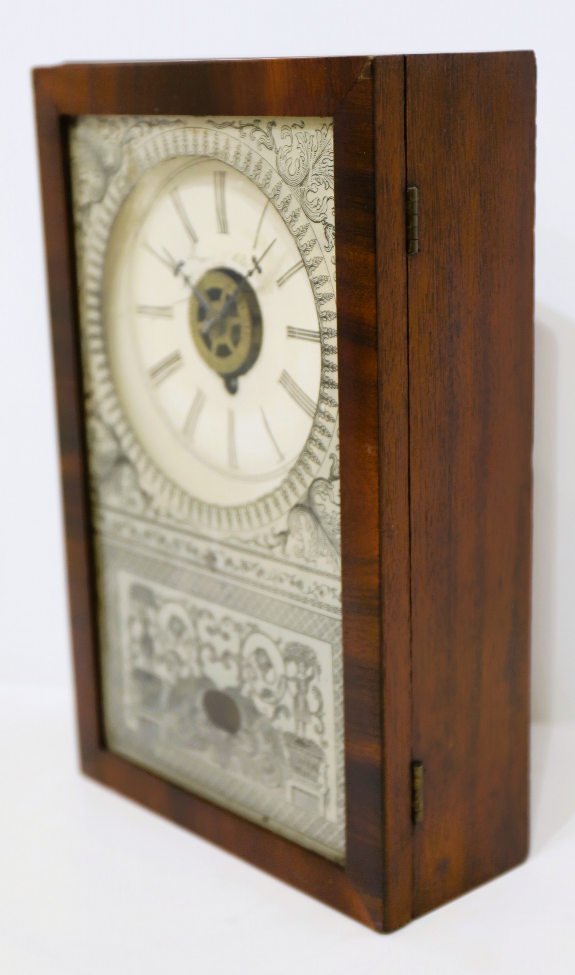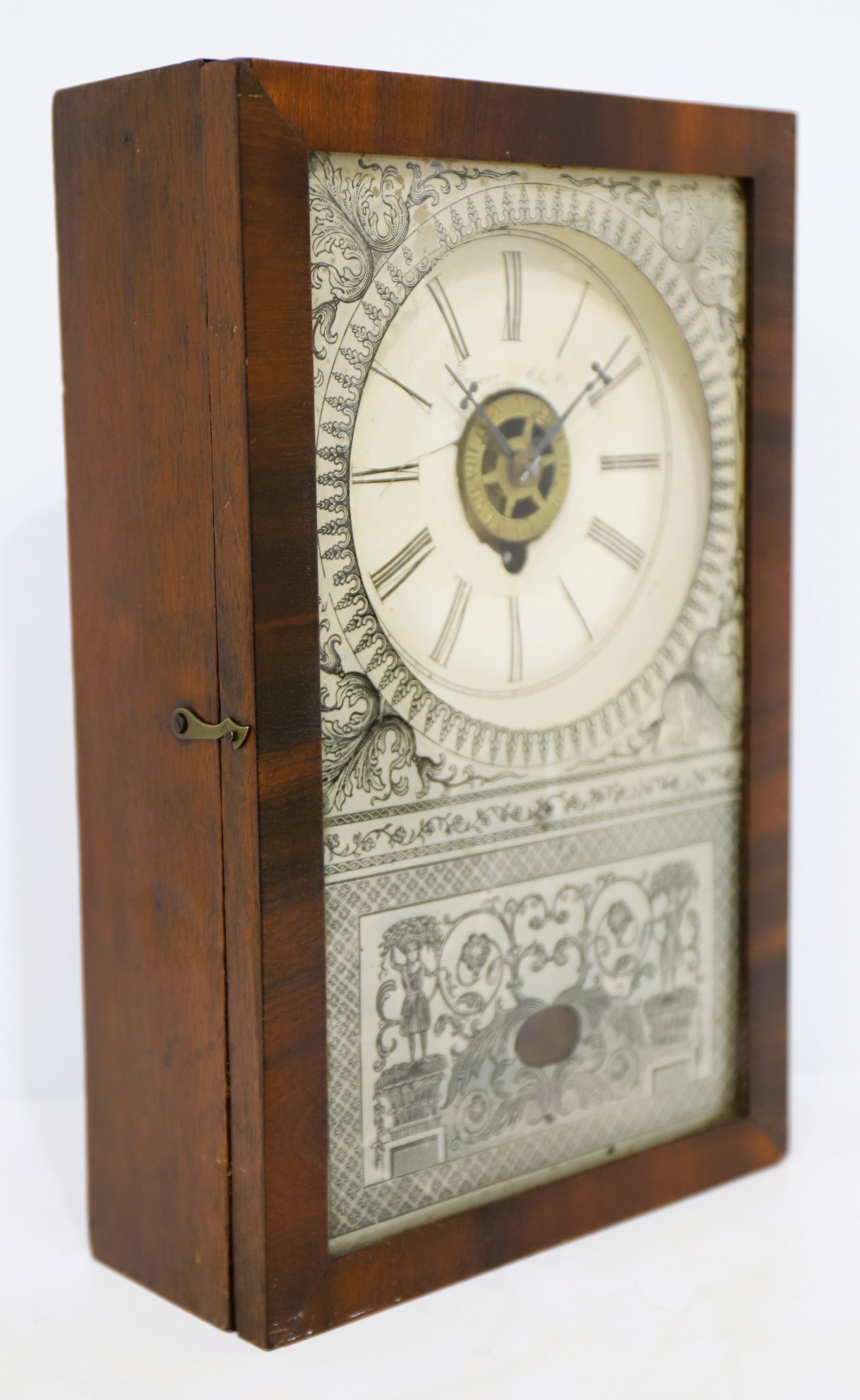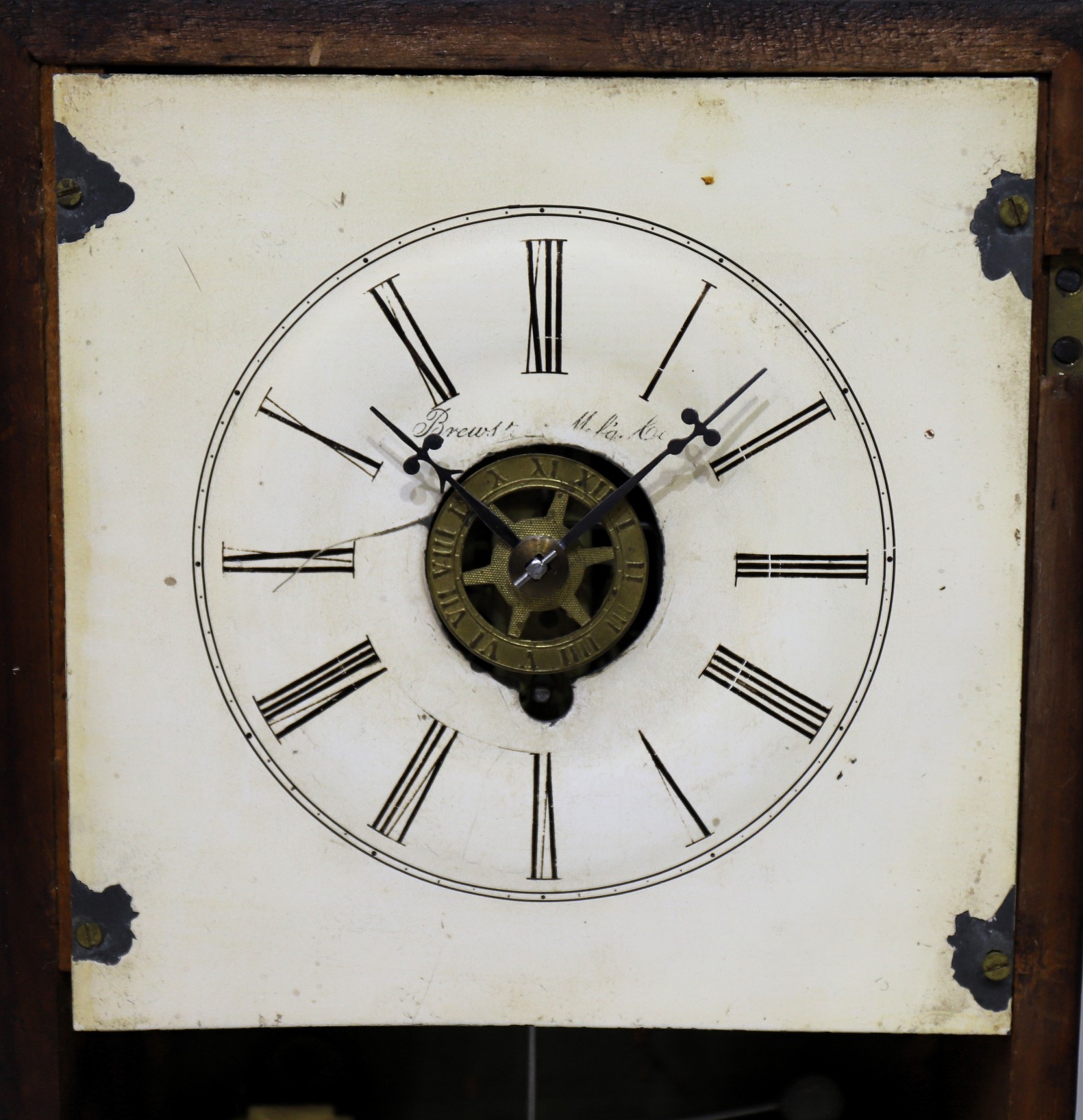 colored glasses were offered by several other sellers as well, but this is the first one I have had by Elisha Brewster’s company. There is one other sale on LiveAuctioneers for this model by Brewster, but it differs slightly with the addition of a small base. This clock is 11 inches tall with walnut veneer all around and an original door glass. I believe they first stenciled in the