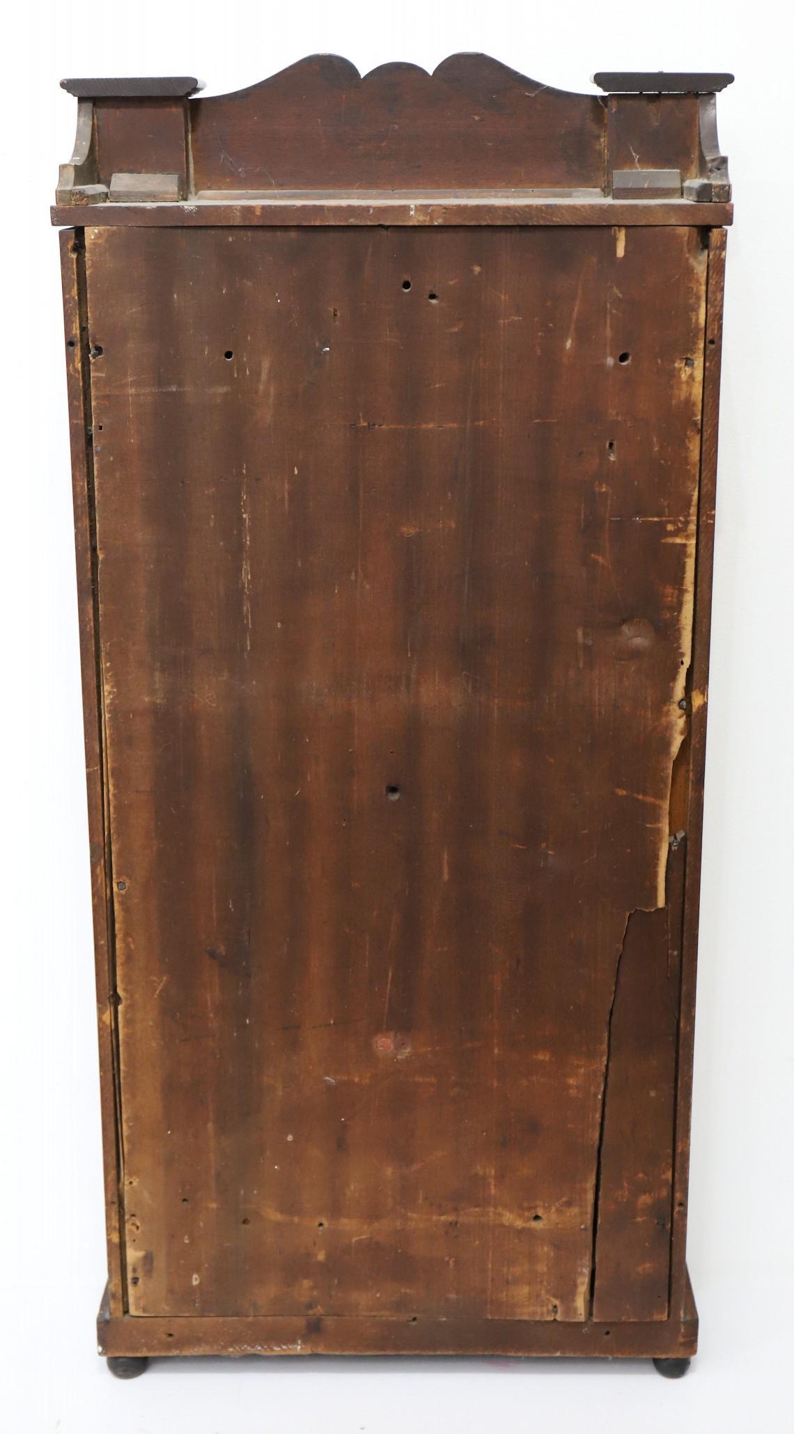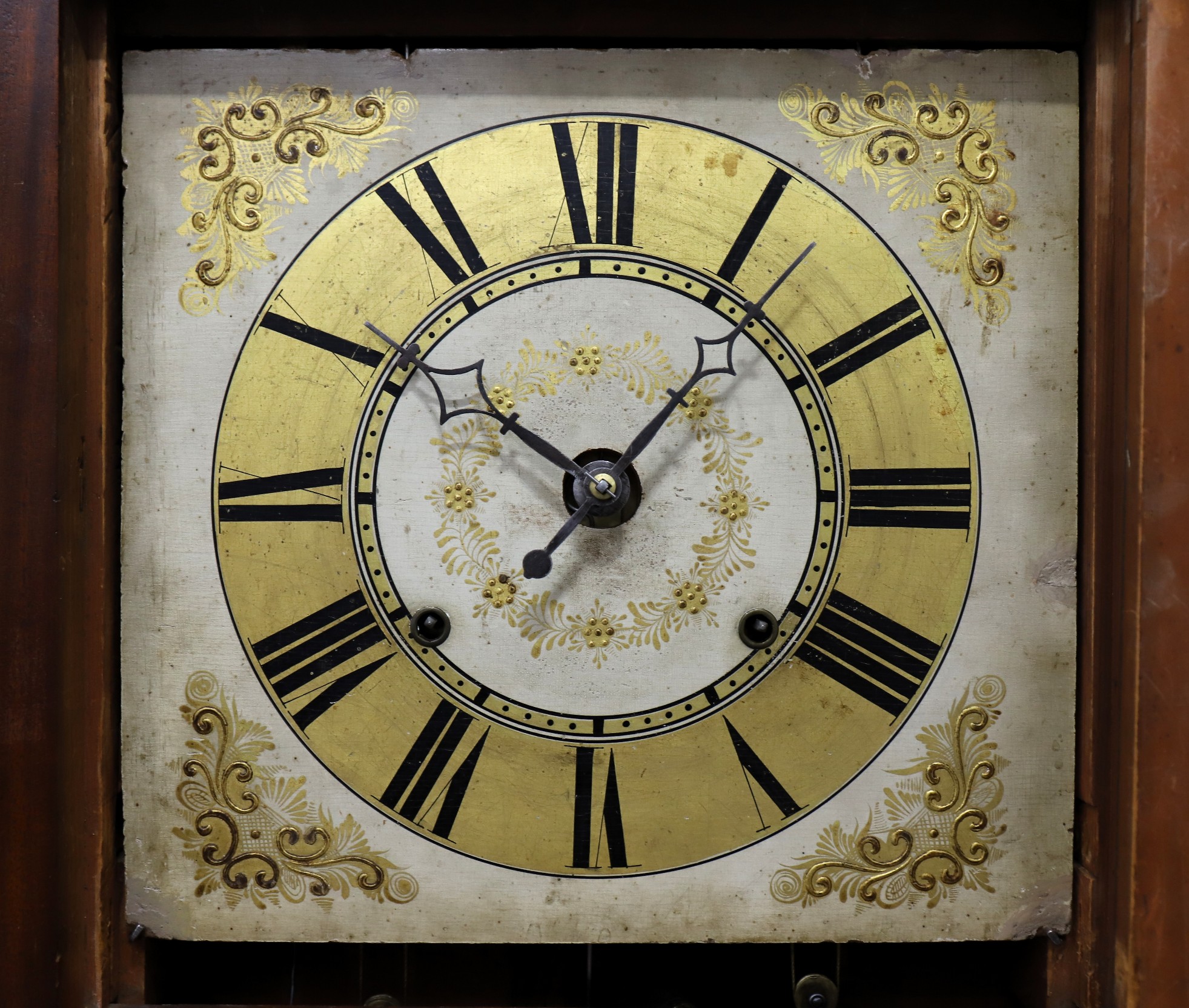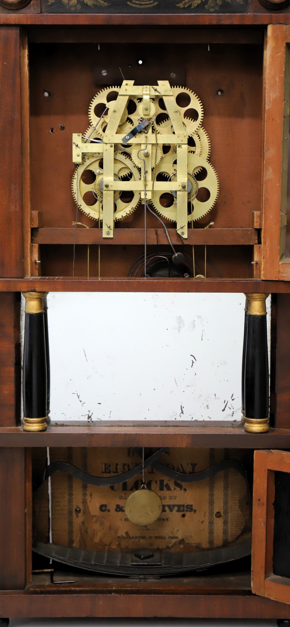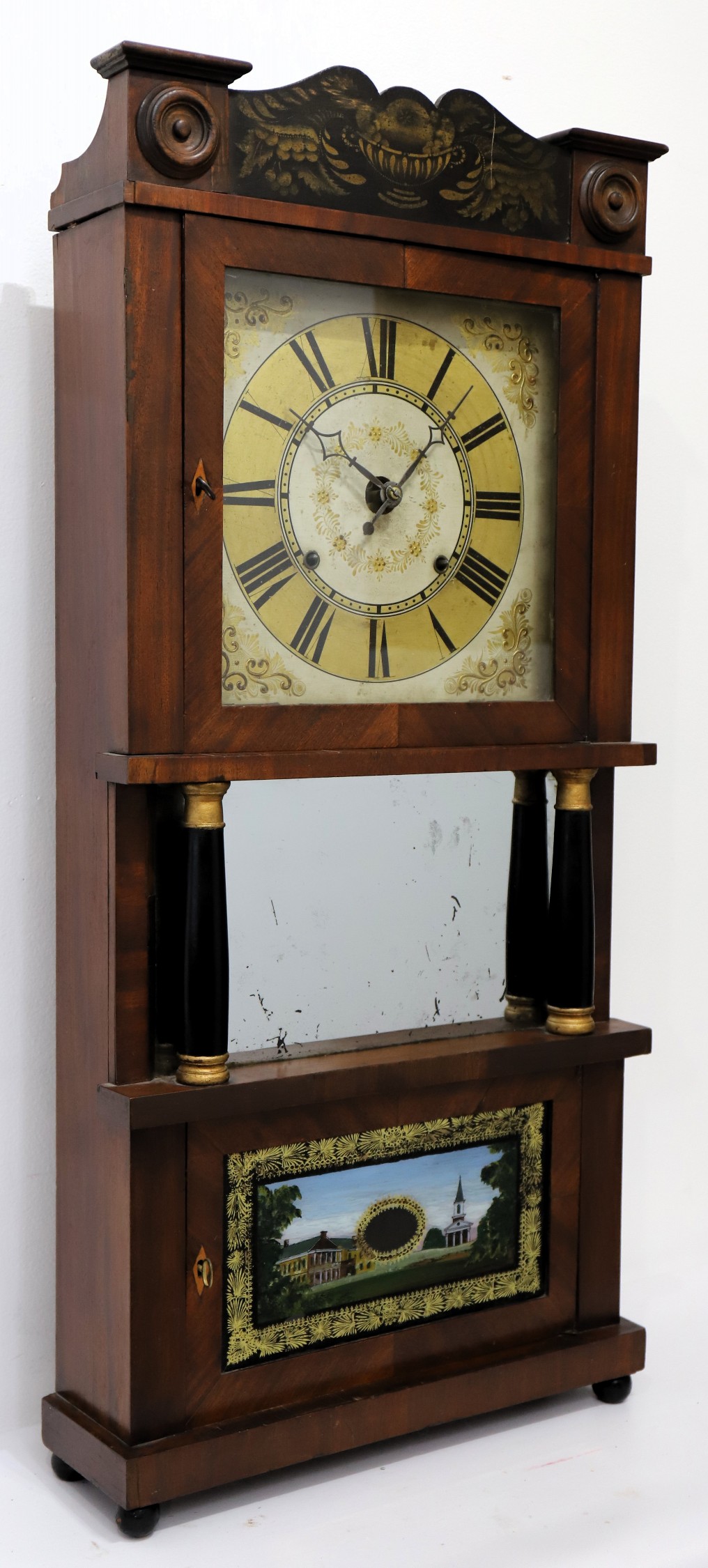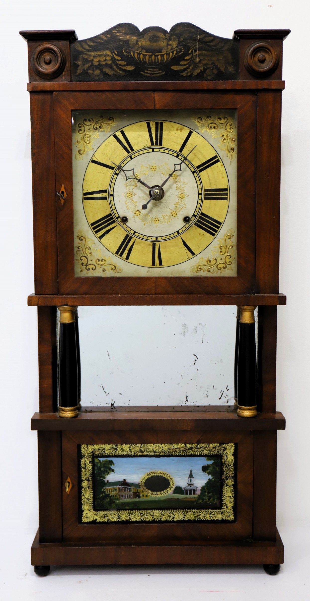 partner. The 36-inch case has mahogany veneer, a bronze-stenciled splat with wood rosettes on the chimneys, two repainted